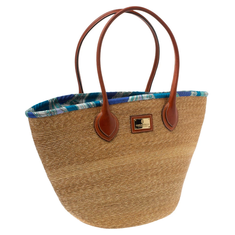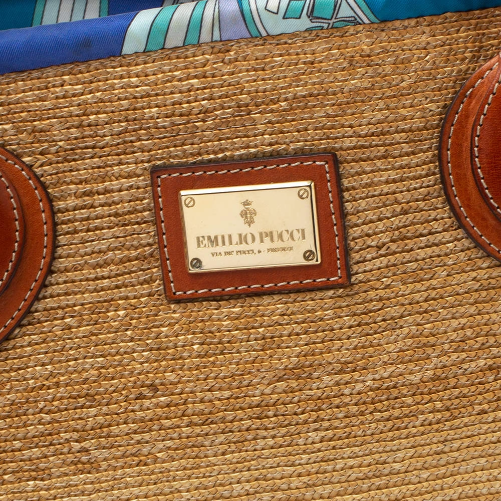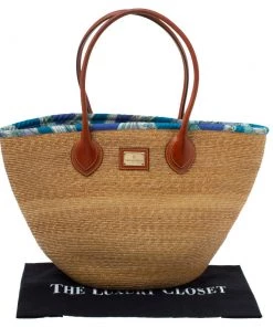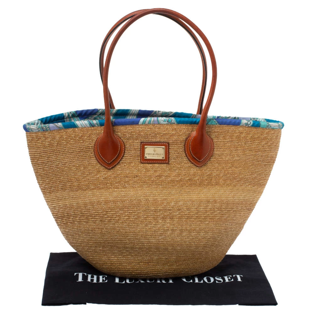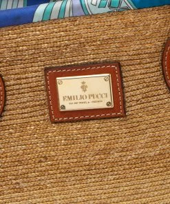 Emilio Pucci is known for its meticulous design and coveted styles. This stunning shopper tote is testimony to the brand’s tasteful aesthetic. Crafted from raffia and leather, it comes in lovely hues of brown & beige. It has been styled with dual handles, logo plaque on the front, a blue-printed fabric interior and gold-tone hardware.