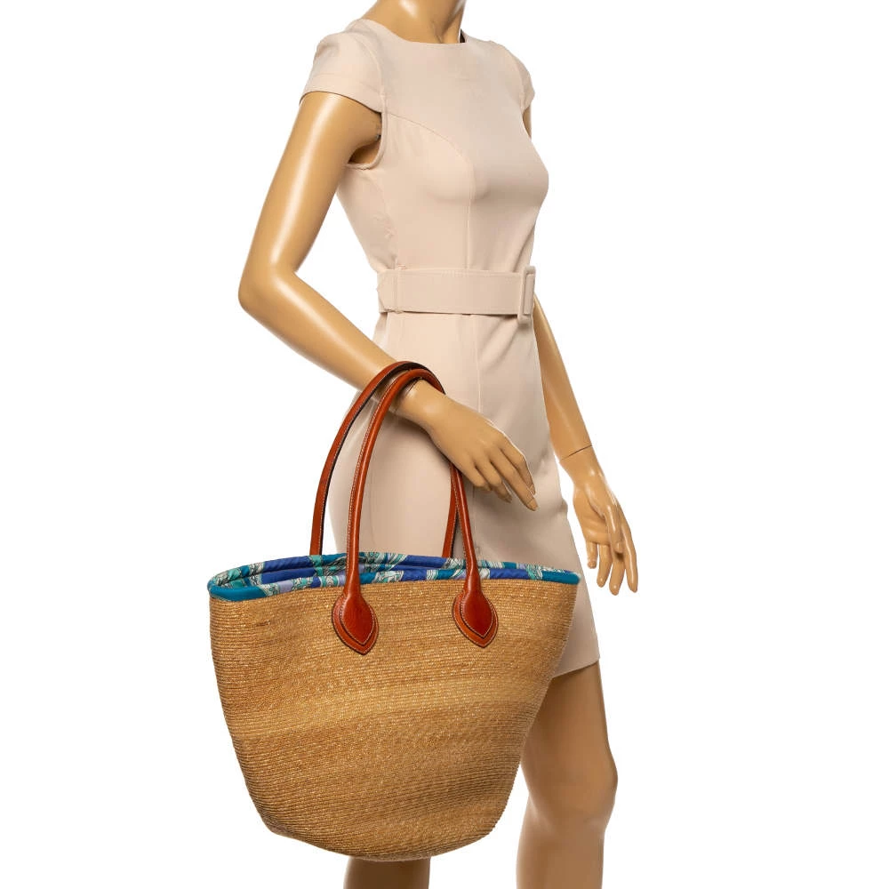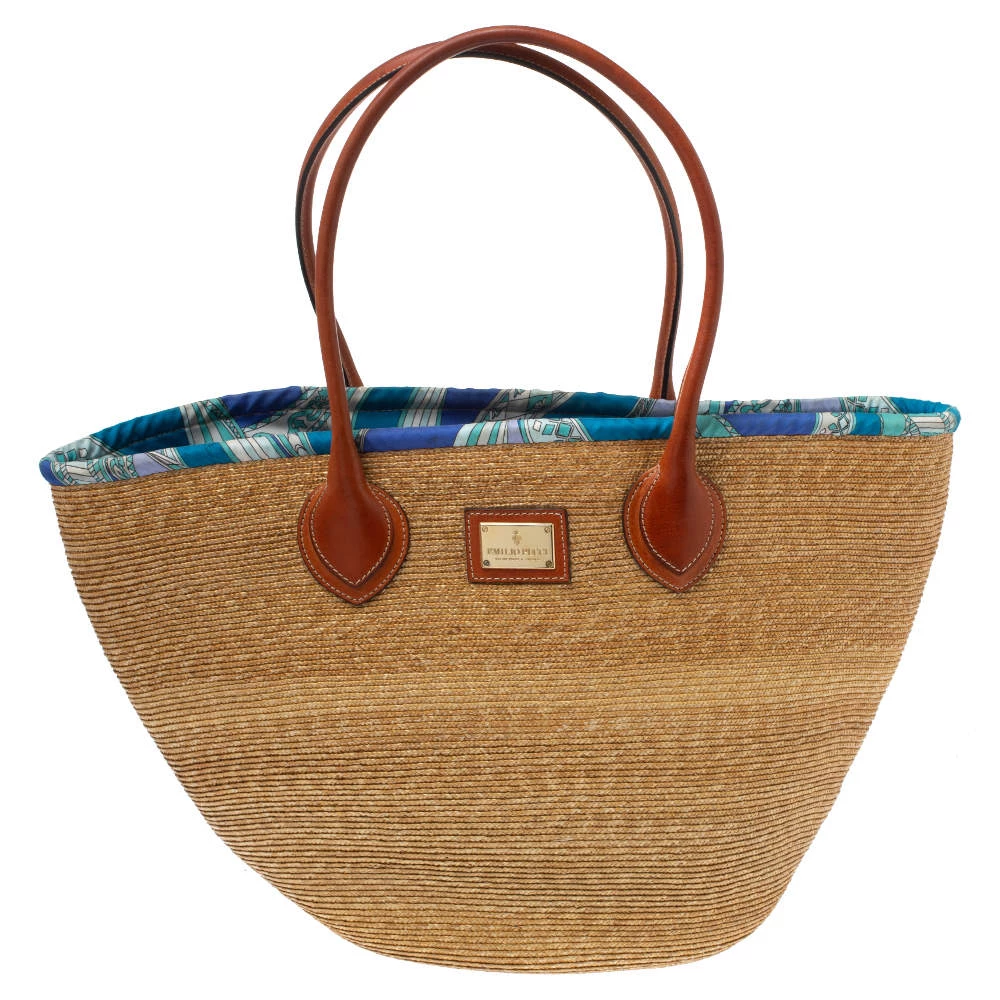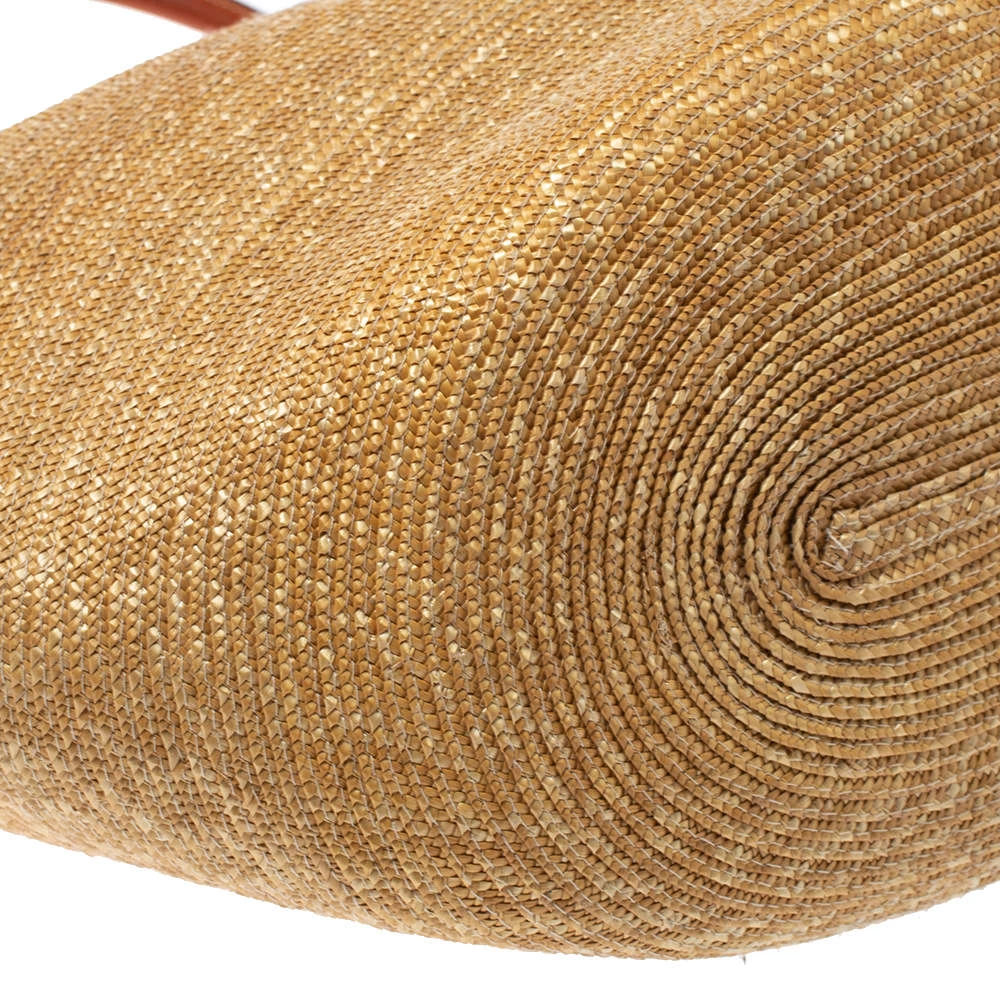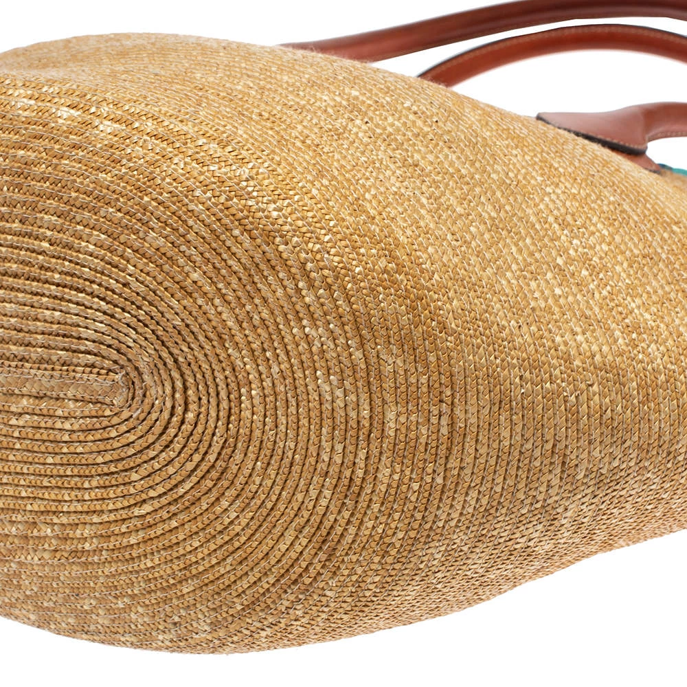Emilio Pucci is known for its meticulous design and coveted styles. This stunning shopper tote is testimony to the brand’s tasteful aesthetic. Crafted from raffia and leather, it comes in lovely hues of brown & beige. It has been styled with dual handles, logo plaque on the front, a blue-printed fabric interior and gold-tone hardware.