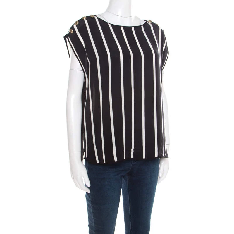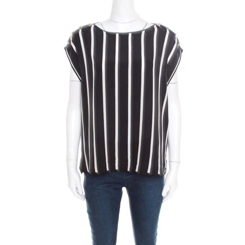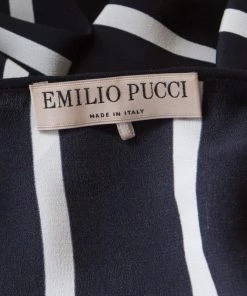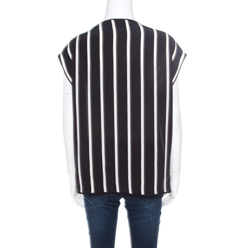 Cut from 100% silk, this Emilio Pucci sleeveless top is perfect for a casual outing with friends. Styled in an oversized silhouette, this top comes with a black and white striped pattern all over. Style yours with denim jeans and nude pumps.