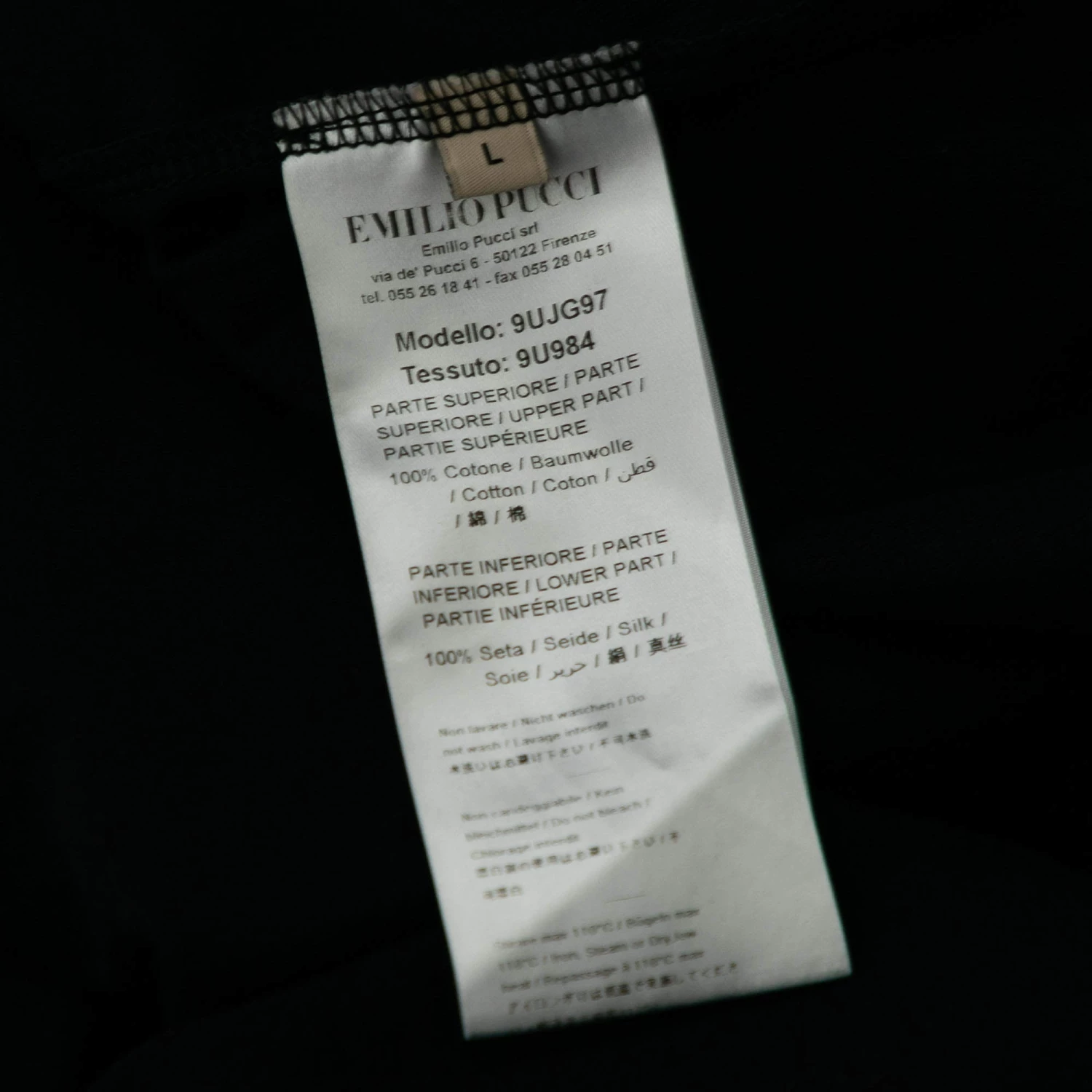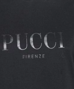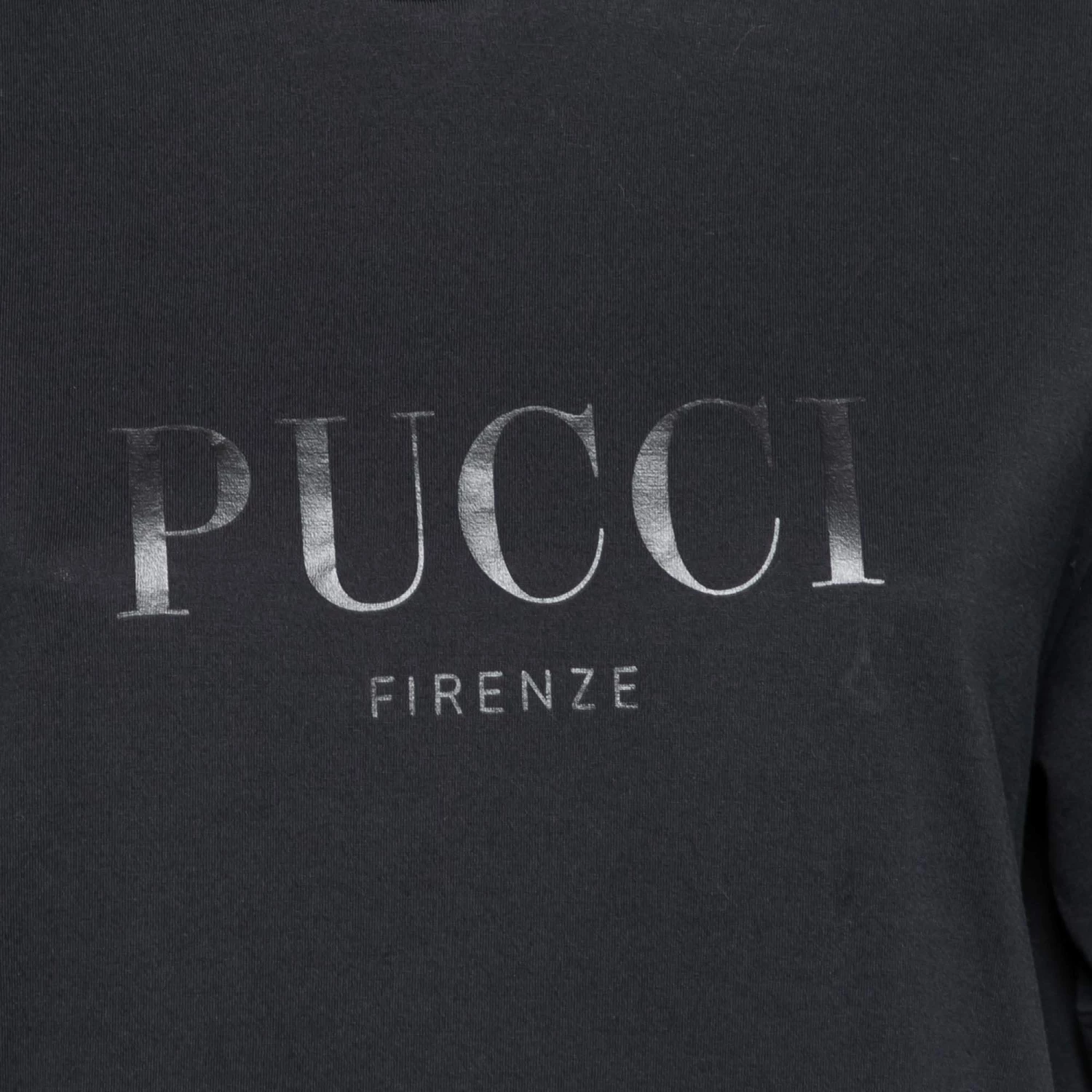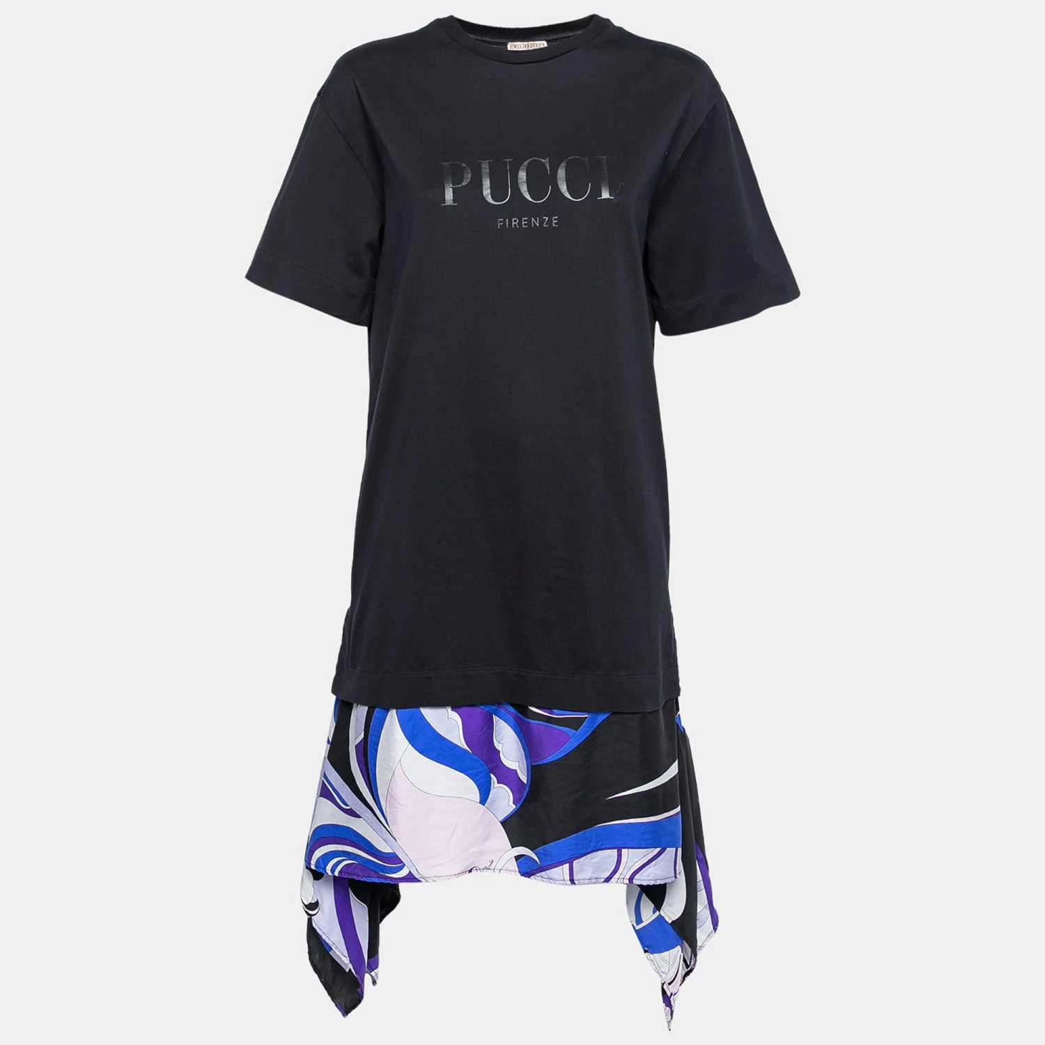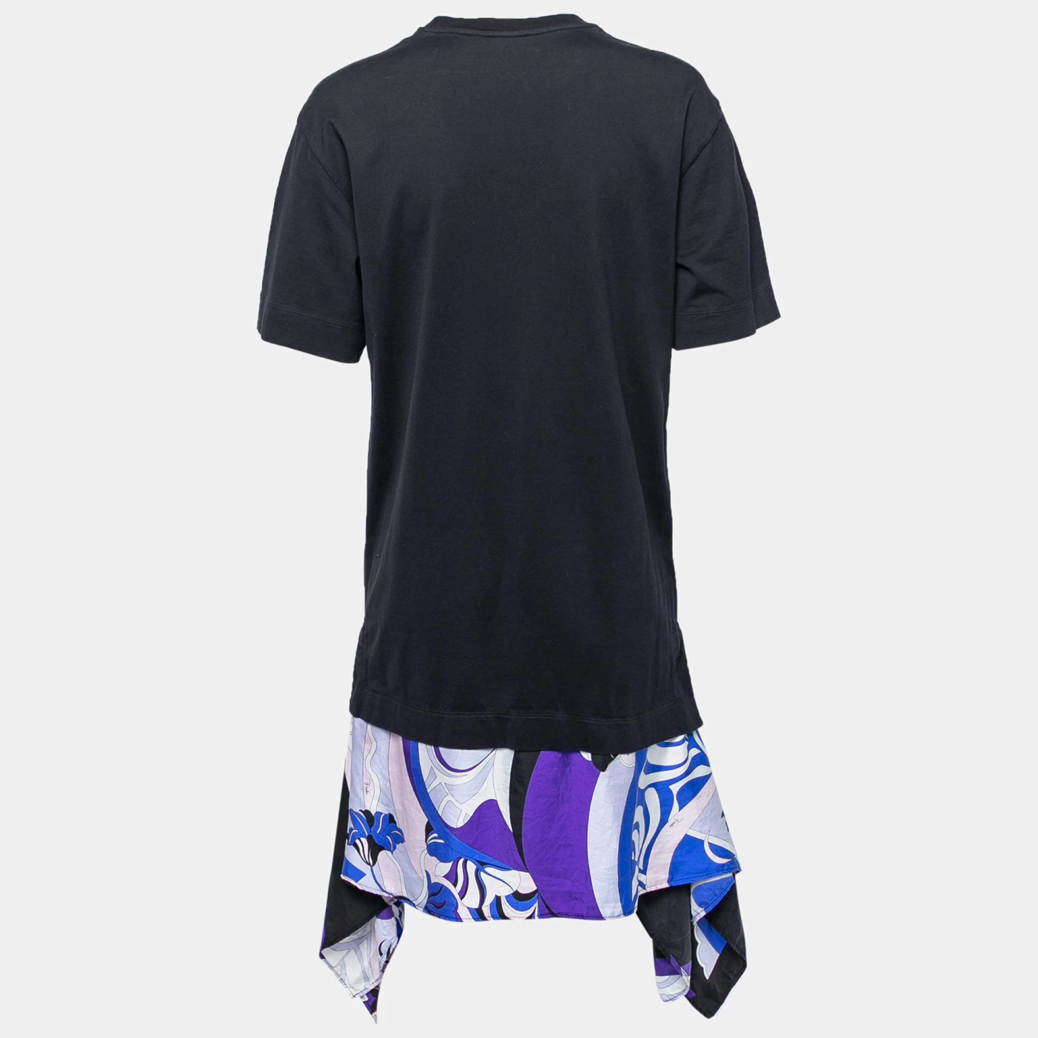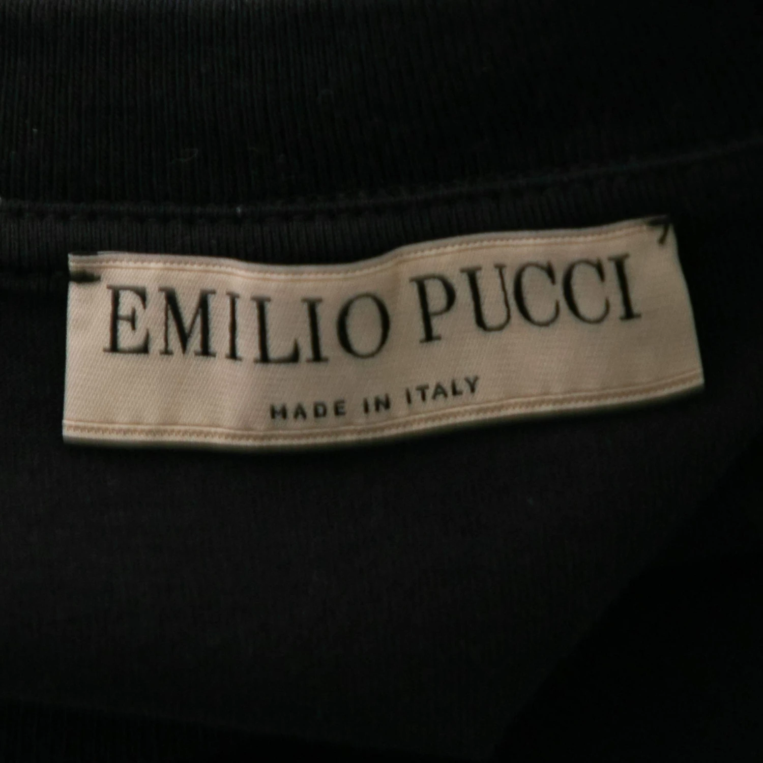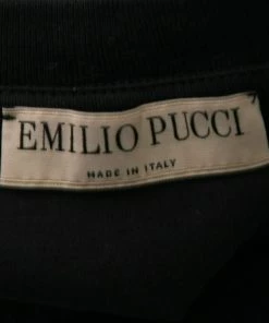 This T-shirt dress from Emilio Pucci is all about class and comfort. It is tailored using black cotton and silk fabric, with a brand print highlighting the front. It has short sleeves and a relaxed fit. This dress is great for casual use.