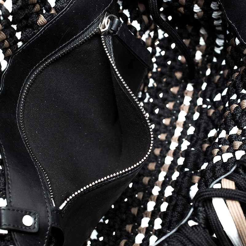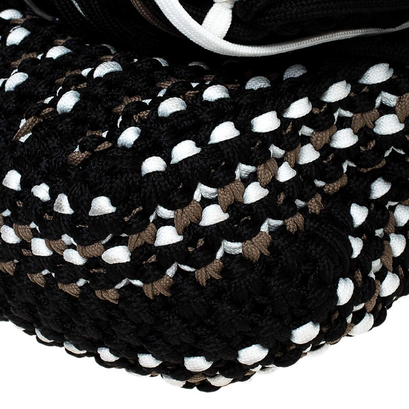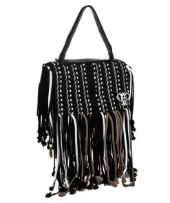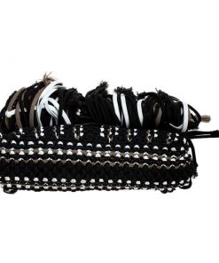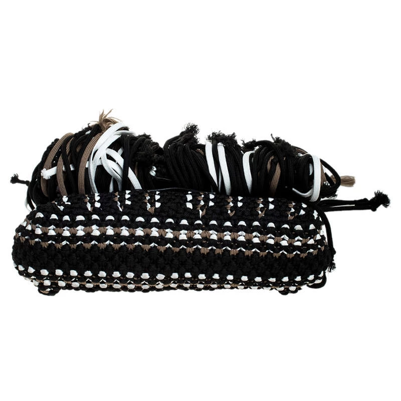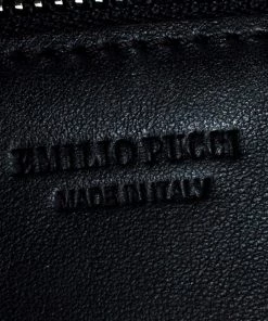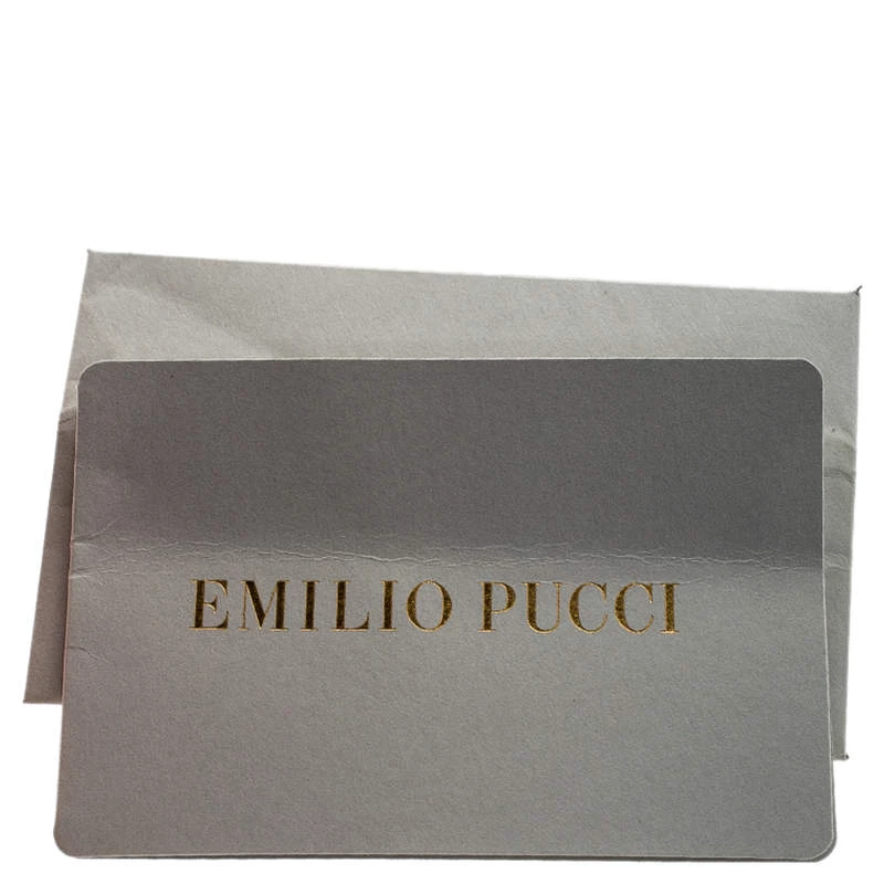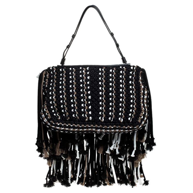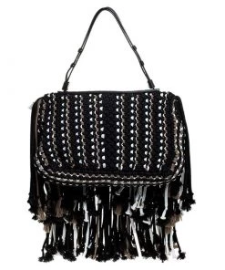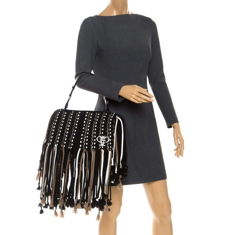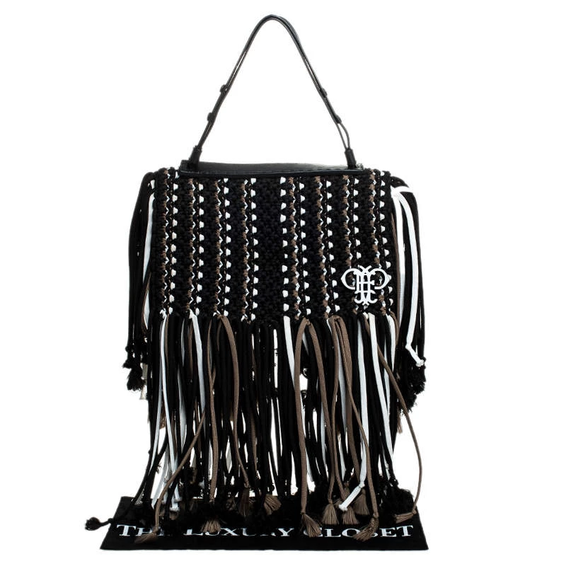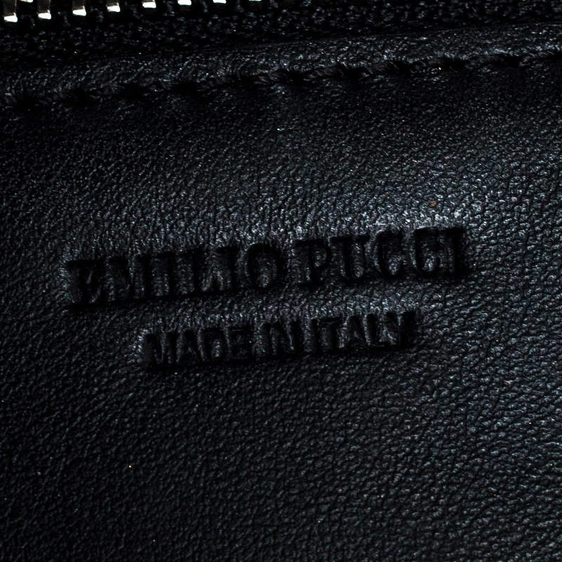 This Emilio Pucci handbag will uplift your wardrobe instantly. This strikingly stylish fabric bag does dual work as a fashion accessory and practical necessity. Meticulously crafted in Italy, it comes in a classic shade of black. The exterior is made beautiful with lovely fringe detailing. The bag opens to reveal a leather and fabric interior with enough space to house your essentials. It is finished impeccably with the brand logo and silver-tone hardware.