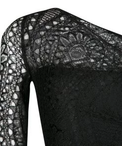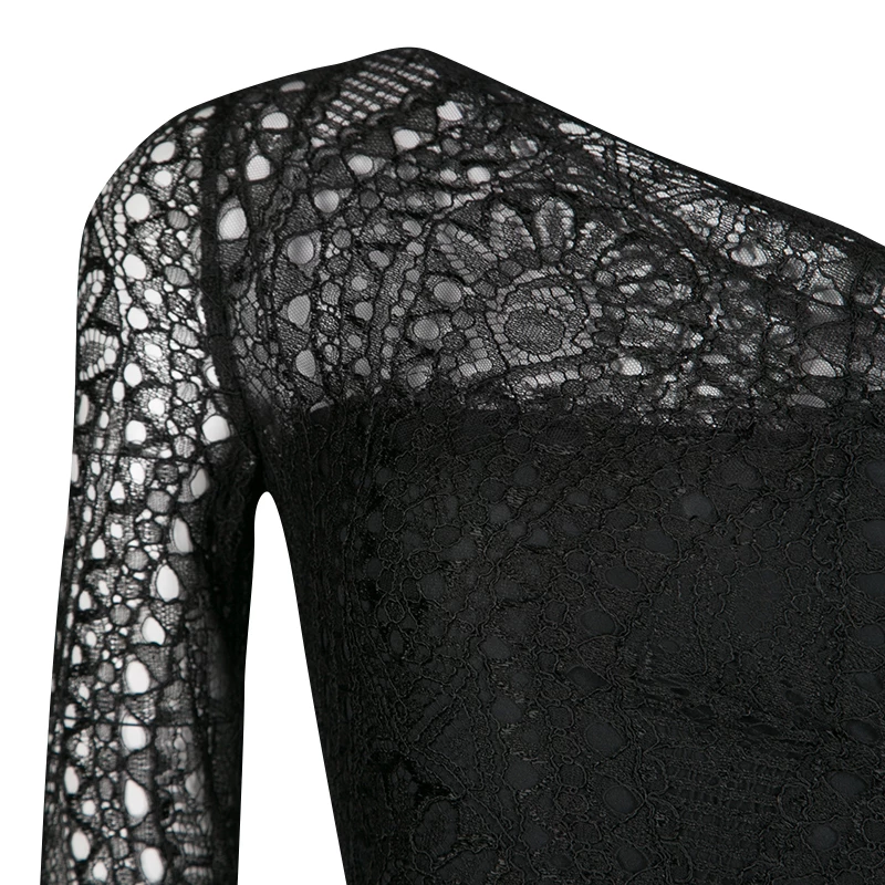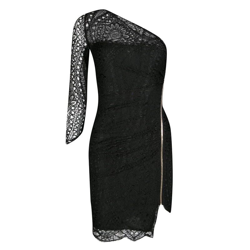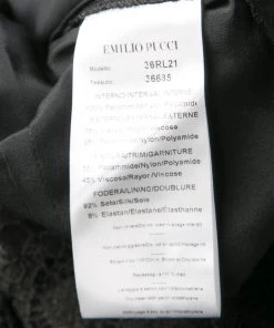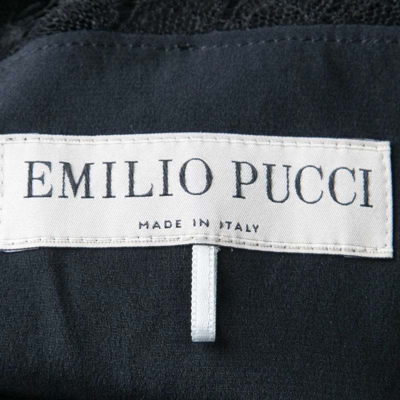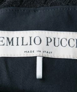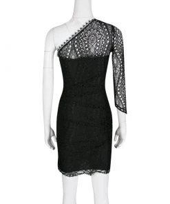 Everything about this Emilio Pucci dress is glamorous and ultra-modern. Crafted from nylon in a straight structure, this one-shoulder LBD features a long sheer sleeve flaunting the intricate lacework. Slightly ruched with a zipper detail on the side, the dress will look best with complementing accessories and shoes.