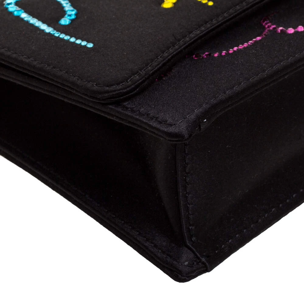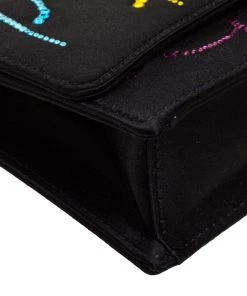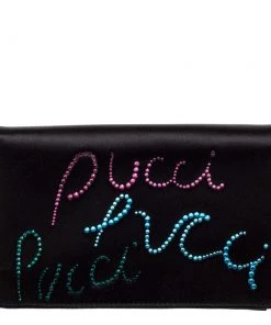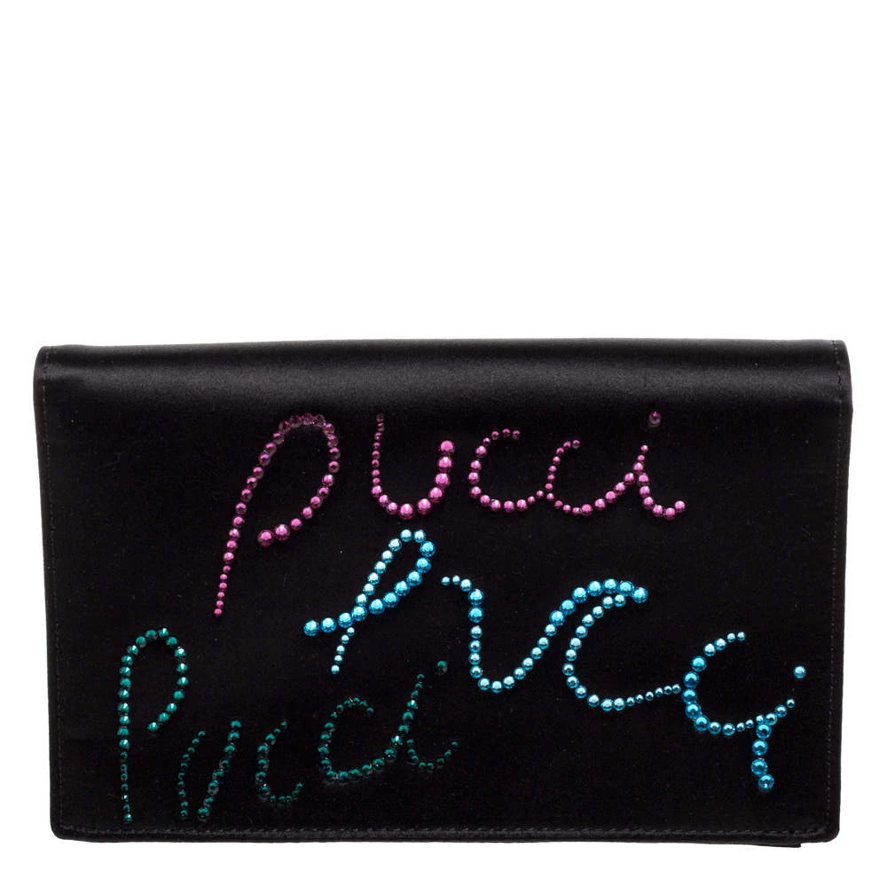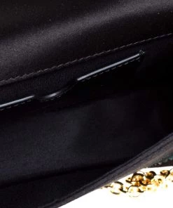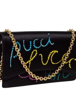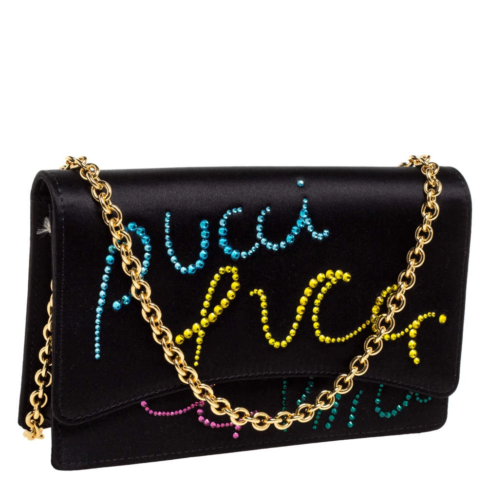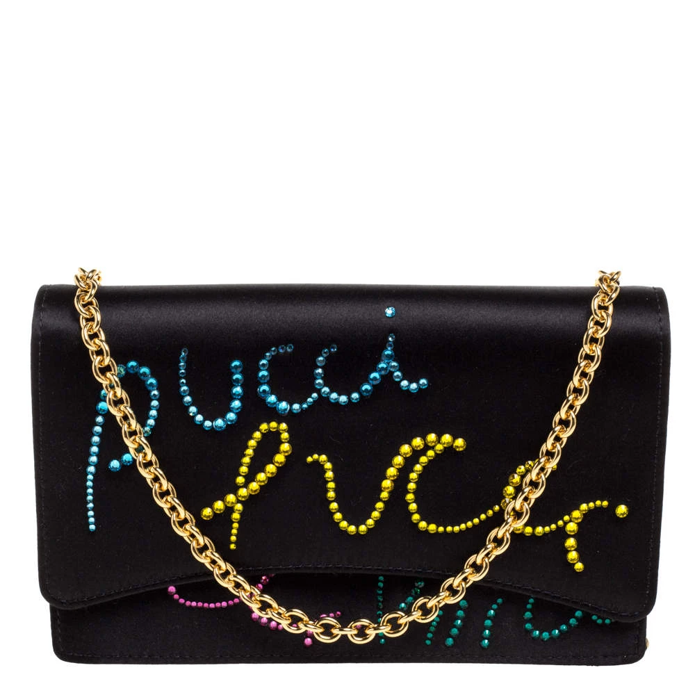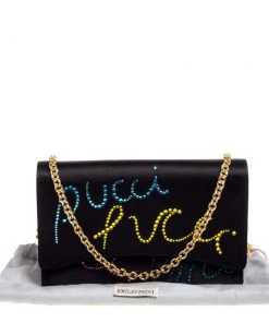 This luxurious and stylish Box bag from Emilio Pucci is a treat to our eyes! The extravagant brand offers you a bag that has been crafted in Italy and is made from black satin. It is decorated with crystal embellishments. A front flap secures the insides of the bag. The luxurious piece is complete with a shoulder strap, and gold-tone hardware.
