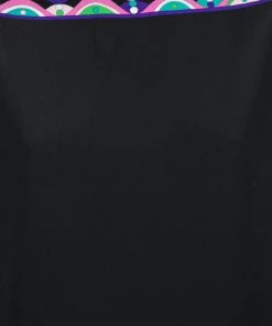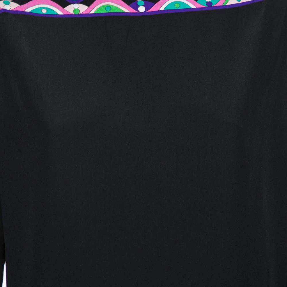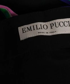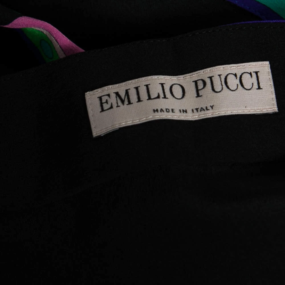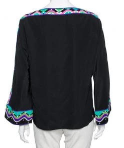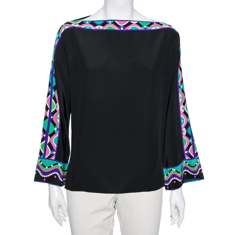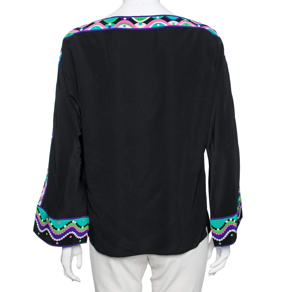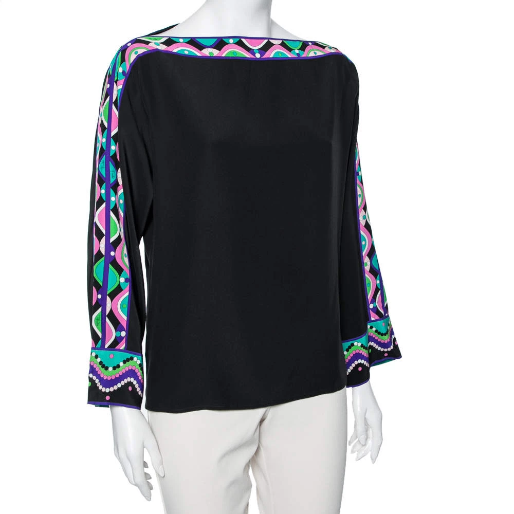 Classy and chic, this blouse from Emilio Pucci will be your favorite in no time. It is made using black satin fabric, which is embellished with multicolored printed trims. It has long sleeves and a comfortable fit.