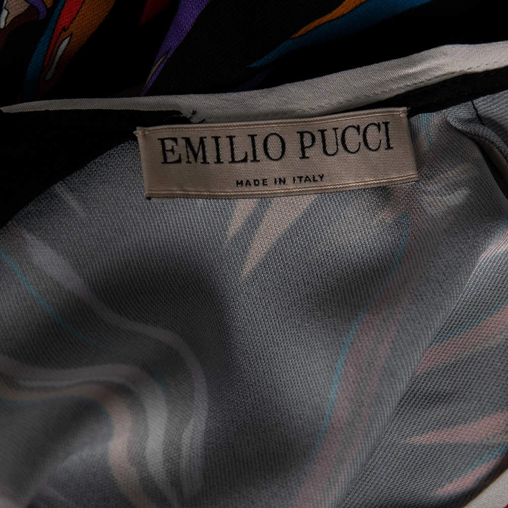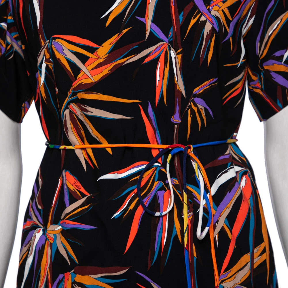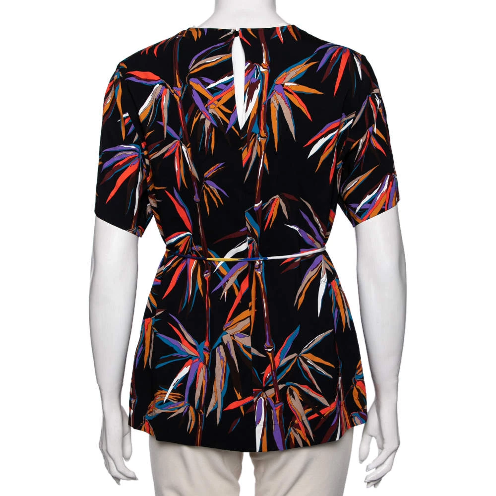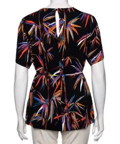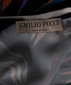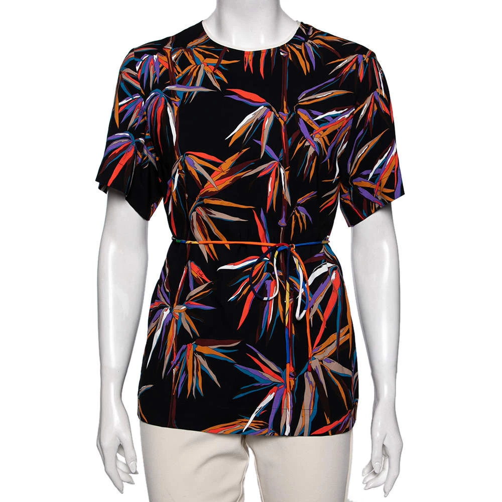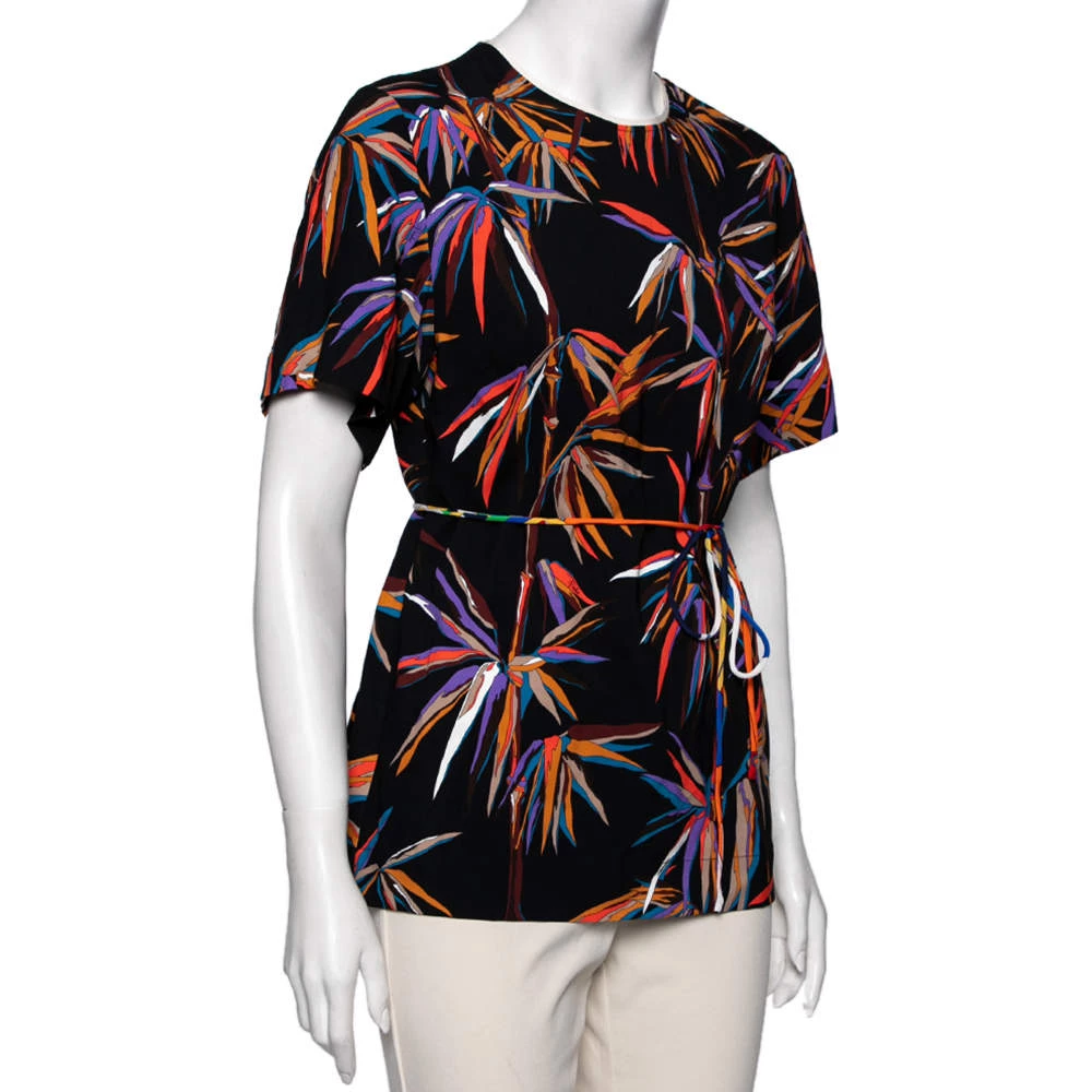 This top from the House of Emilio Pucci will make you look beautiful. It is made from black viscose fabric, which shows the Tropical Palm print. It has a crew neck, short sleeves, and a tie-detail on the front.