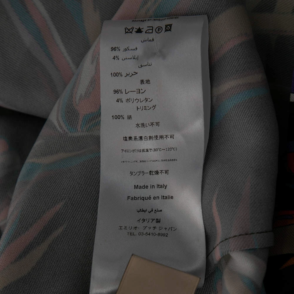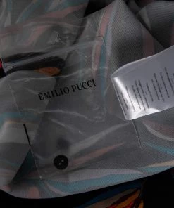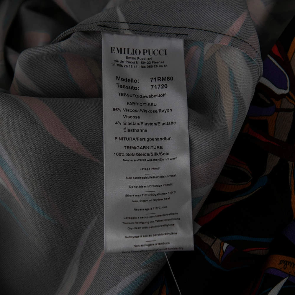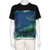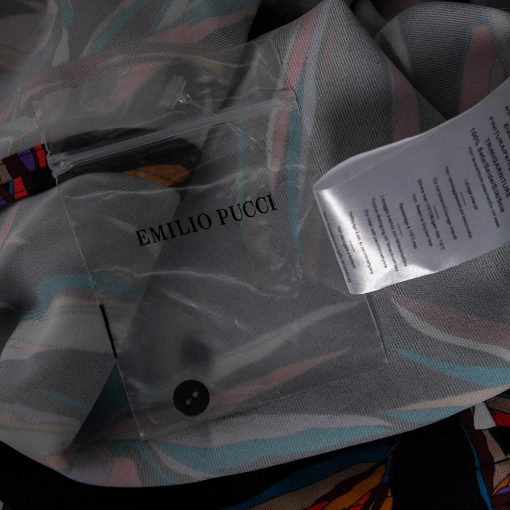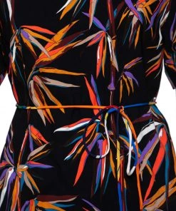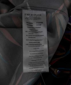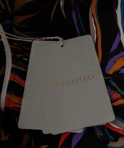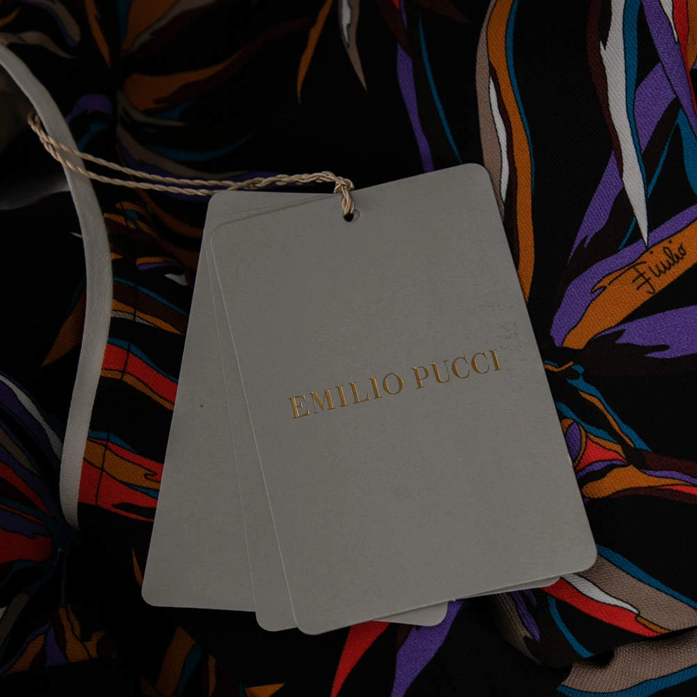 This top from the House of Emilio Pucci will make you look beautiful. It is made from black viscose fabric, which shows the Tropical Palm print. It has a crew neck, short sleeves, and a tie-detail on the front.