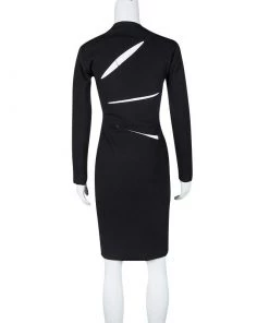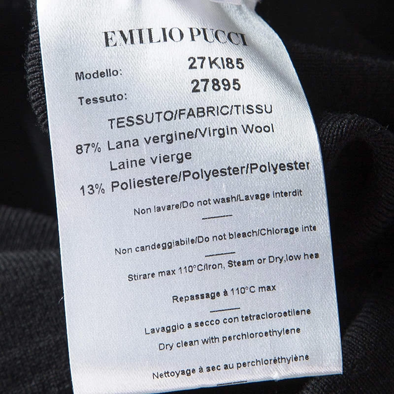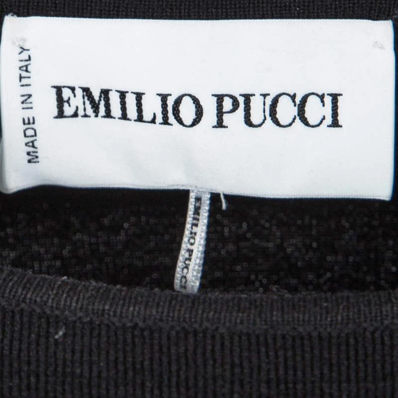 This Emilio Pucci dress is designed in a figure-flattering silhouette. It features a black wool blend construct and falls till the knee. This simple dress comes with full sleeves and a rounded neckline. The cut-out detailing at the back stands as the highlighting features of the dress. Style with bling sandals to add a dramatic touch to the dress.