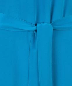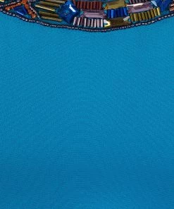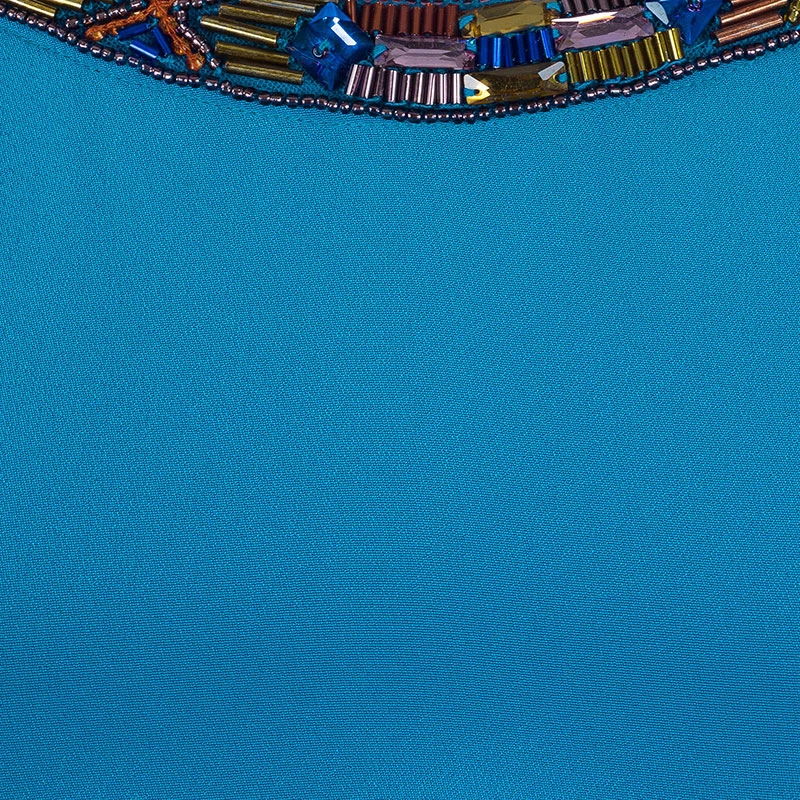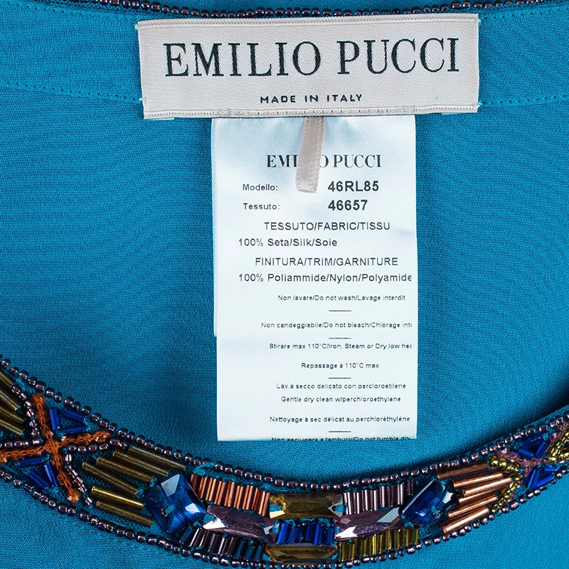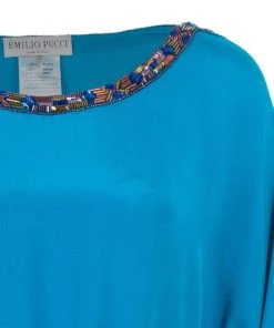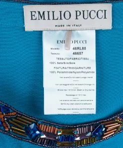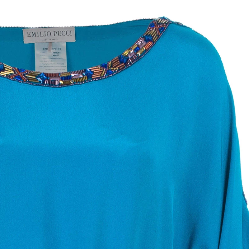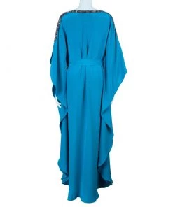 This Emilio Pucci Kaftan has its own charm with floor-length blue silk drape, and a round neck line. The overall fluid look is accentuated with sequin embellishment at the neckline and tie-belted waist.