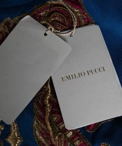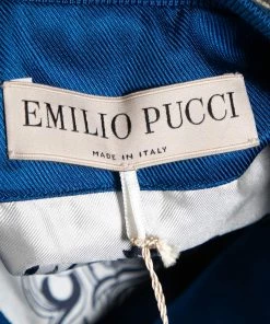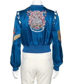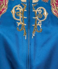 Make heads turn with this uber-chic cropped jacket from Emilio Pucci. The blue silk creation displays amazing and intricate tiger embroidery on the front and back. The artistic piece comes with a zipper at the front and stylish long sleeves.