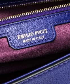 In an irresistible shade of blue, this Emilio Pucci bag will transform your outfit into a combination of classic and contemporary. Made from leather, its exterior is designed with a gold-tone logo plaque on the front flap, a top handle and an optional shoulder strap. The bag opens up to a suede-lined interior with a zip pocket.