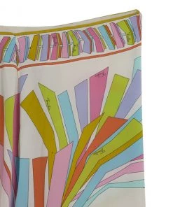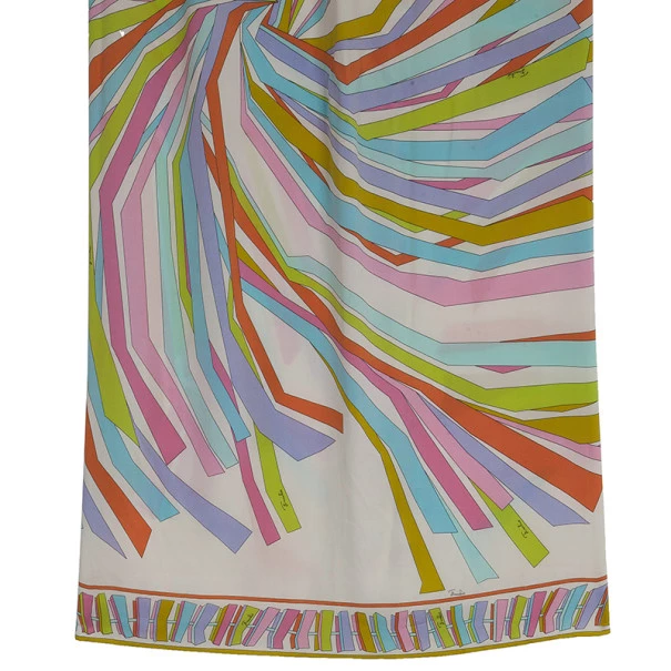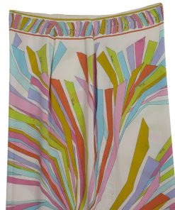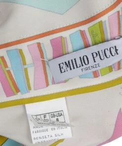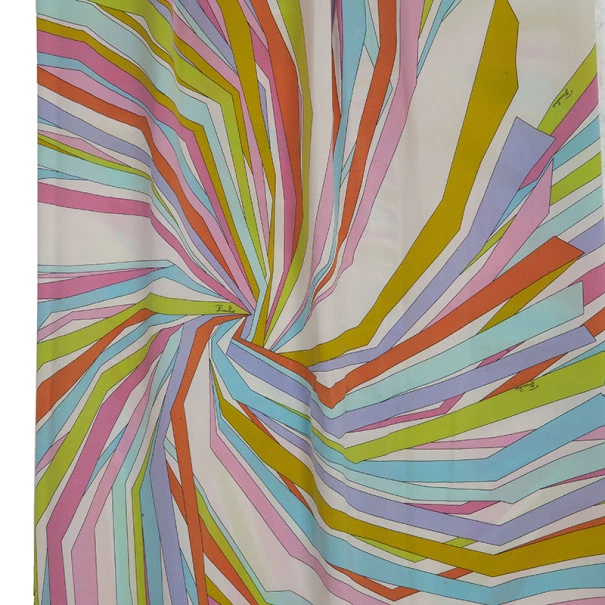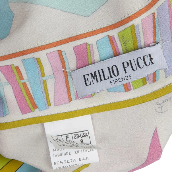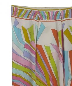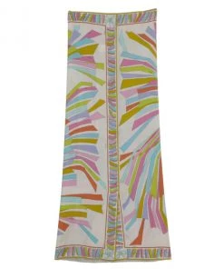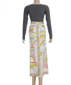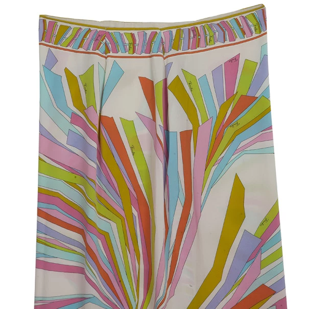 Take a trip to the Maldives and back with this tropical Emilio Pucci skirt. Reflecting the classic bright designs of Pucci, its multicolored print give it a look of tropical leaves in the fun colors of red, pink, purple, blue, green, and yellow. Made from silk and spandex, its long hemline is printed with a fun design on the top, bottom, and the back.Original Retail Price: US $354
