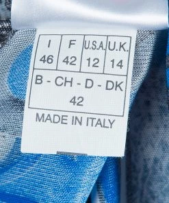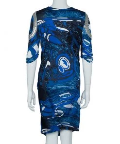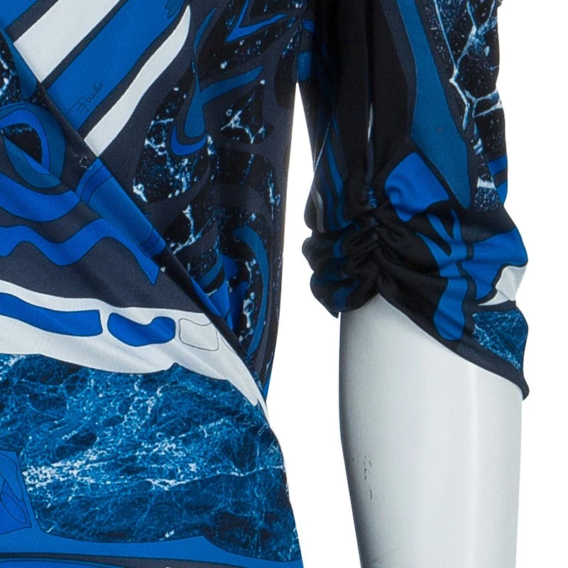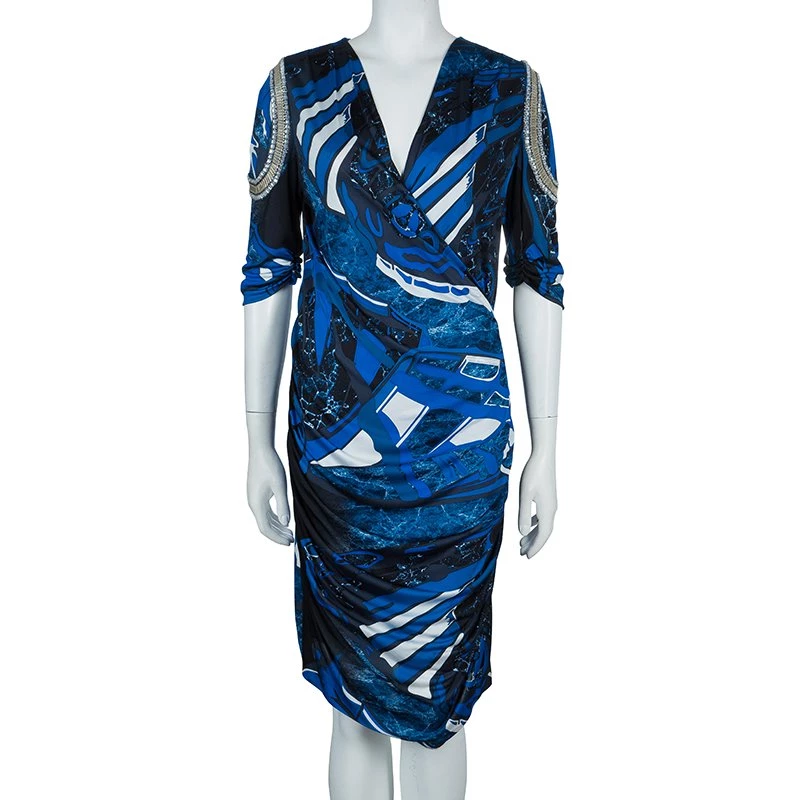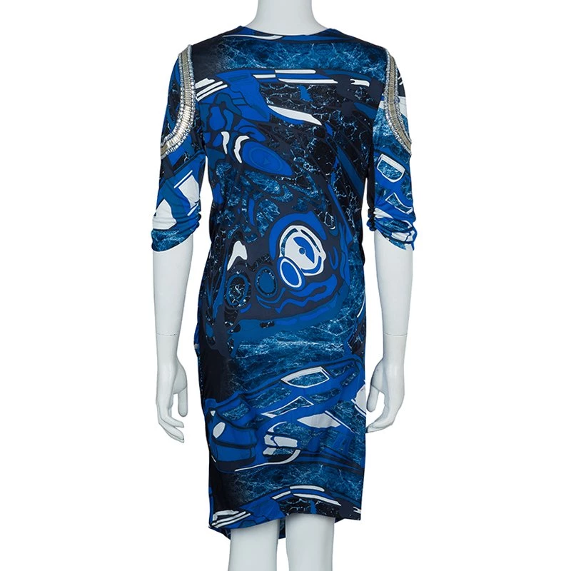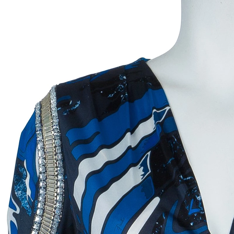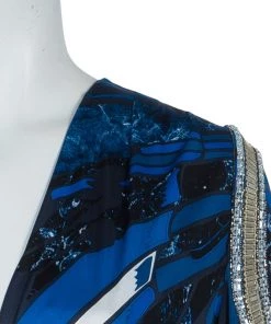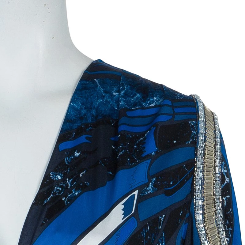 Wardrobe this chic and modish dress tailored by Emilio Pucci for perfection. It is crafted from viscose and is adorned with beads, stones and sequins embellishments on sleeves. This dress features a deep V shaped neckline with an adorable blue print design. It is accented with beautiful ruched details and elbow spanned sleeves.