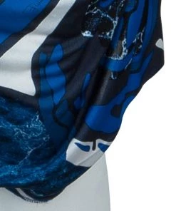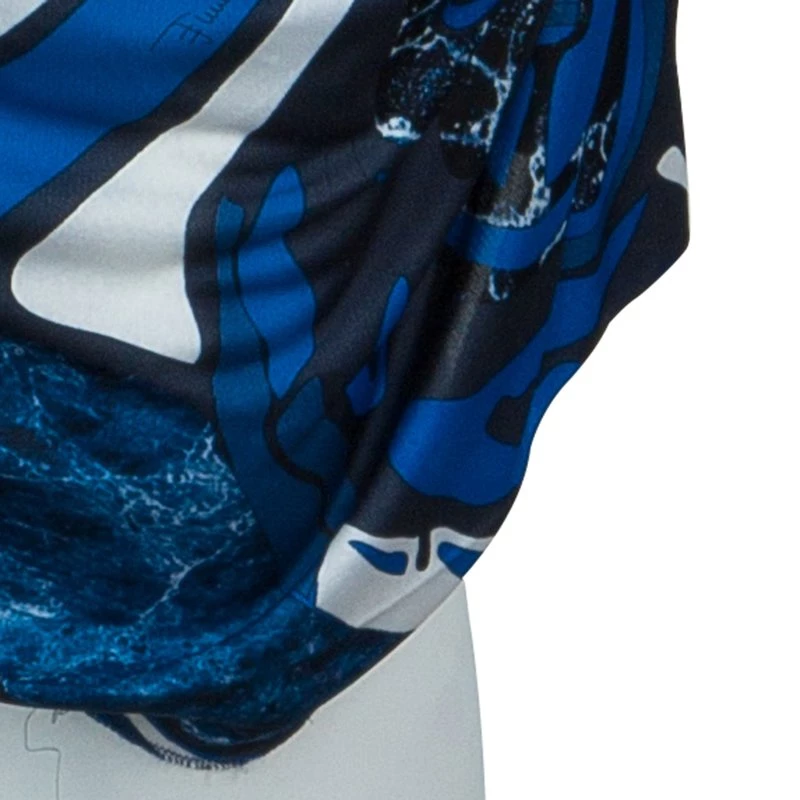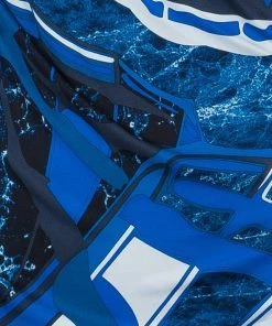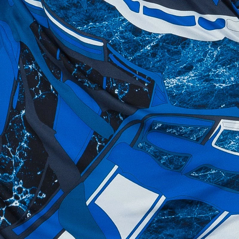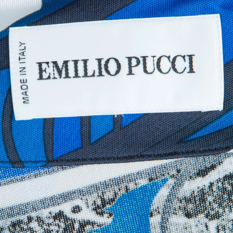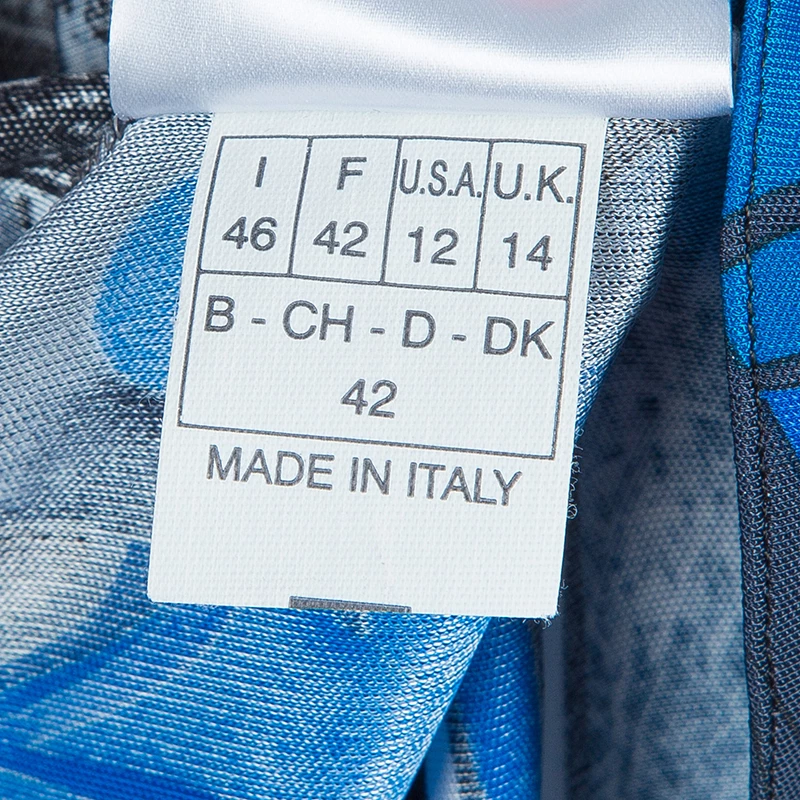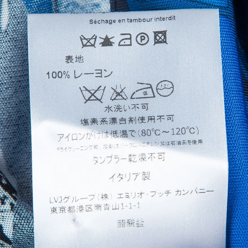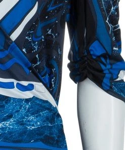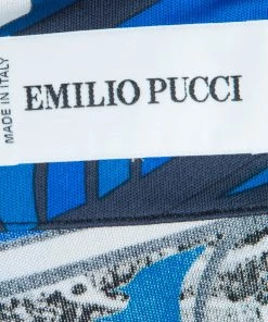 Wardrobe this chic and modish dress tailored by Emilio Pucci for perfection. It is crafted from viscose and is adorned with beads, stones and sequins embellishments on sleeves. This dress features a deep V shaped neckline with an adorable blue print design. It is accented with beautiful ruched details and elbow spanned sleeves.