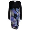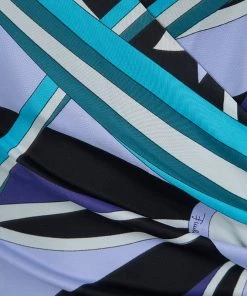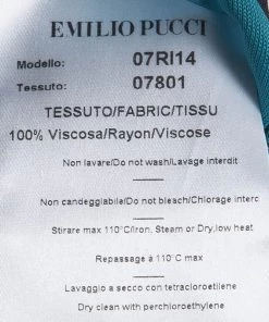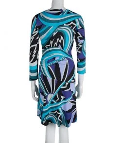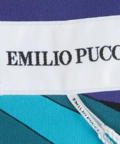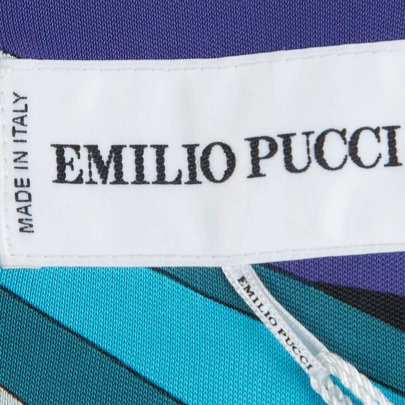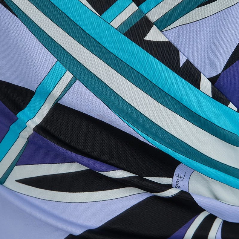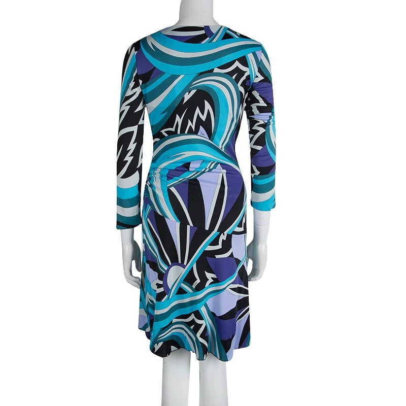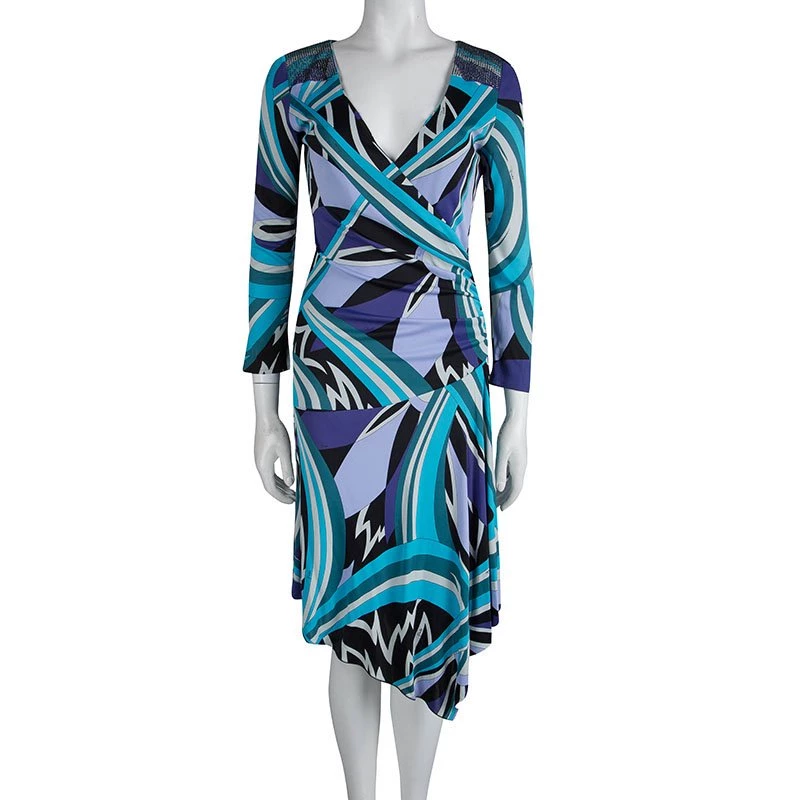 Italian fashion house Emilio Pucci is known worldwide for his bold, kaleidoscopic graphic prints. Designed in a draped silhouette, this dress is cut from a blue jersey fabric and embellished at the shoulders. It is totally adorable how the deep V-neckline and the wrap waistline together forms such a flattering silhouette accentuating the feminine figure!