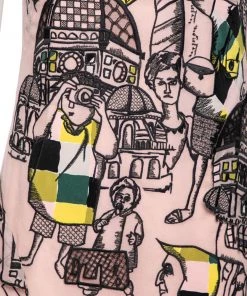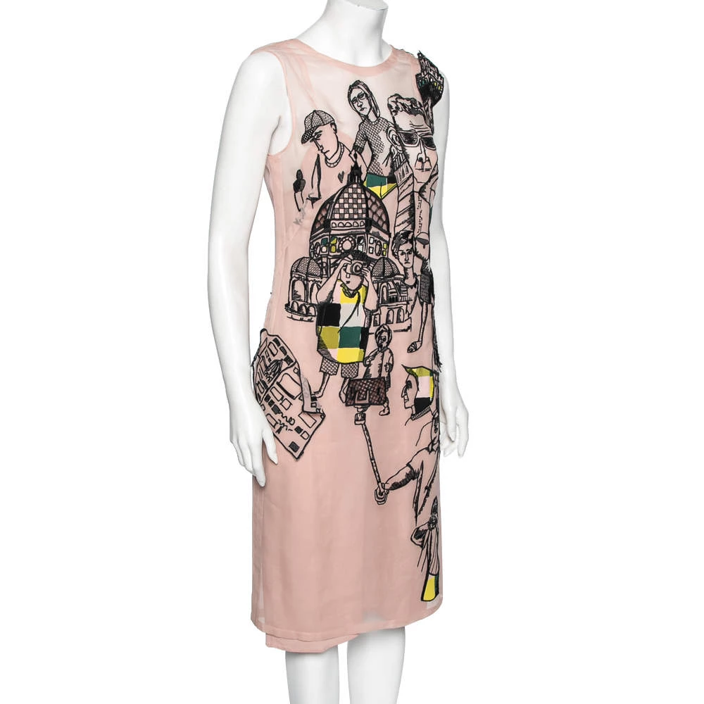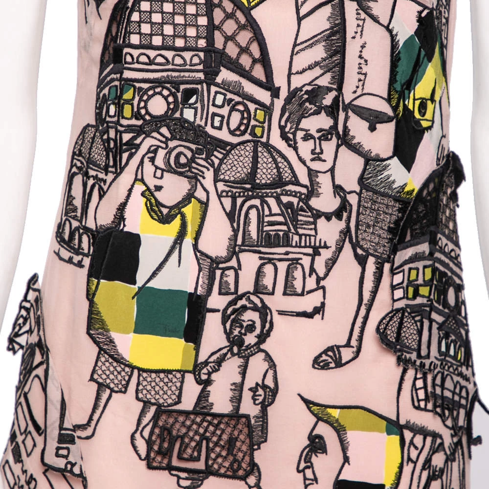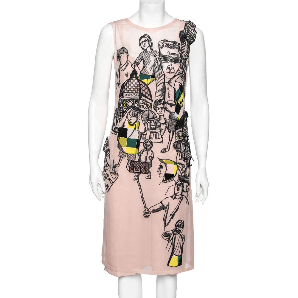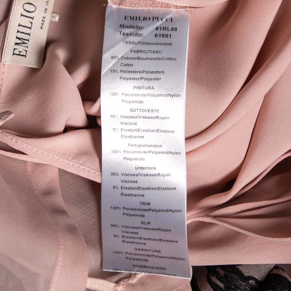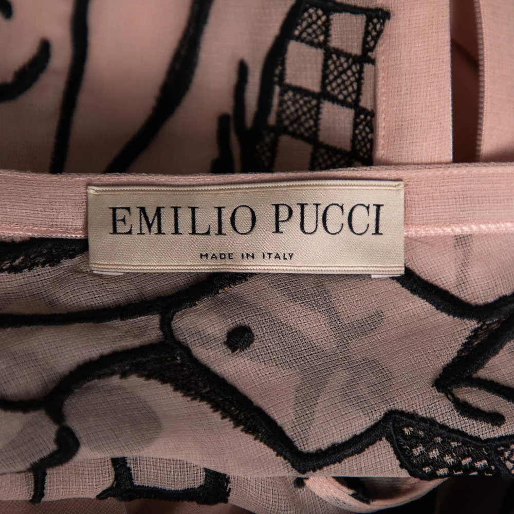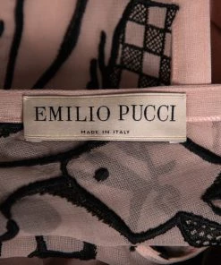 Exhibiting quirky prints and delicate tailoring, this shift dress from the House of Emilio Pucci denotes the brand’s flair in creating effortlessly elegant silhouettes. It is made from blush-pink cotton net fabric, with a contrasting Tourist applique embroidery elevating its charm. It comes with a zipper closure.