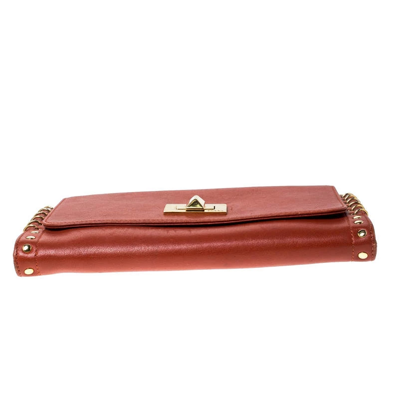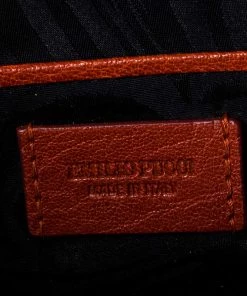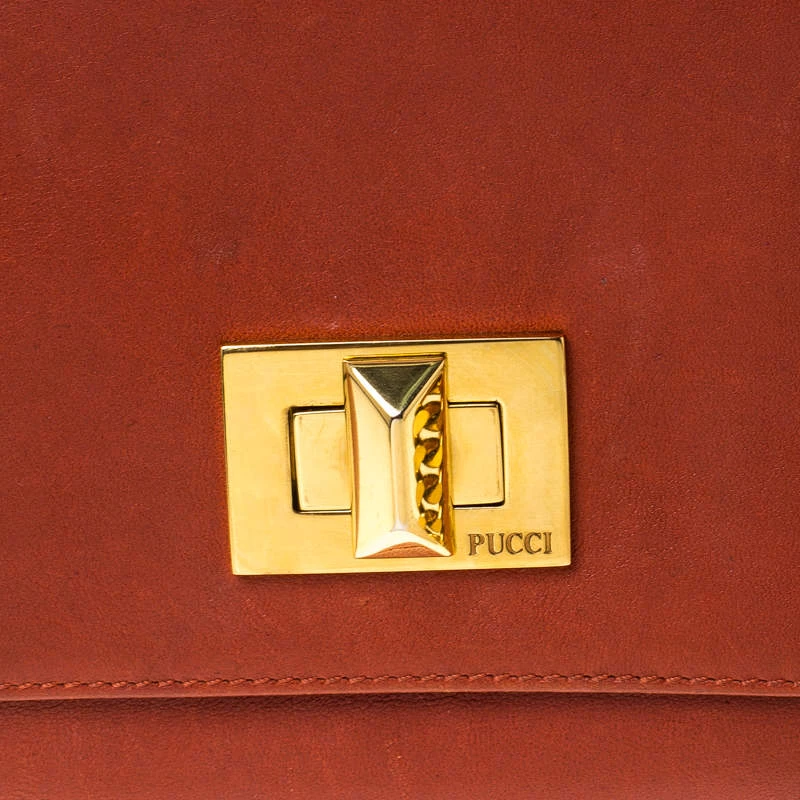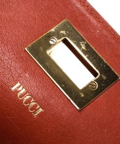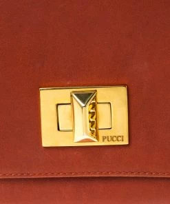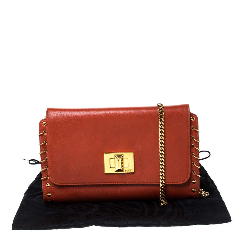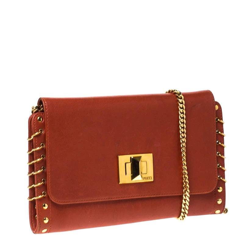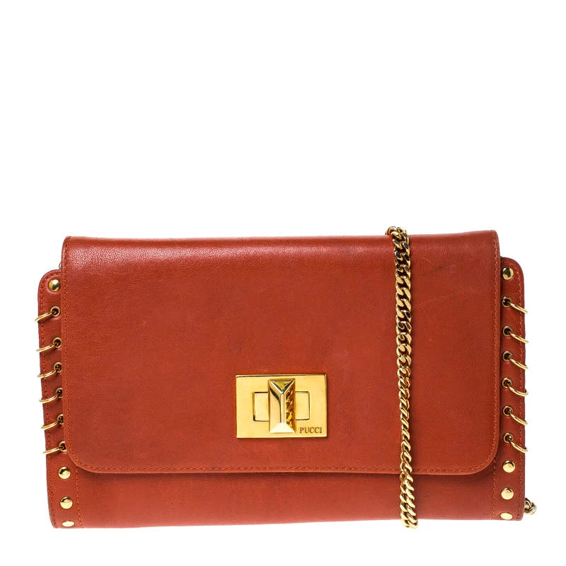 Step out in style by adorning this Ring Accented bag from Emilio Pucci. Crafted from leather, the bag flaunts a front flap with a gold-tone lock closure. The interior is fabric lined and the bag is held by a chain link.