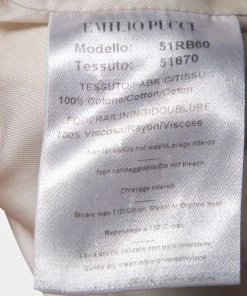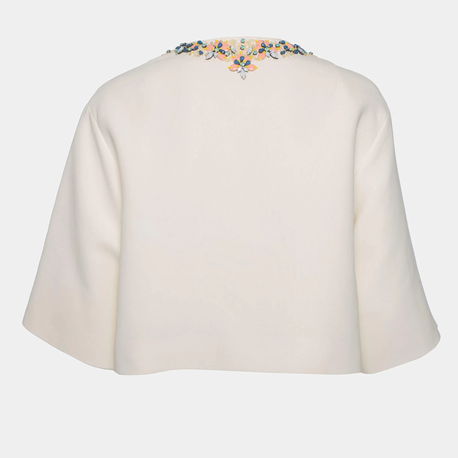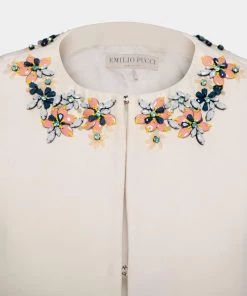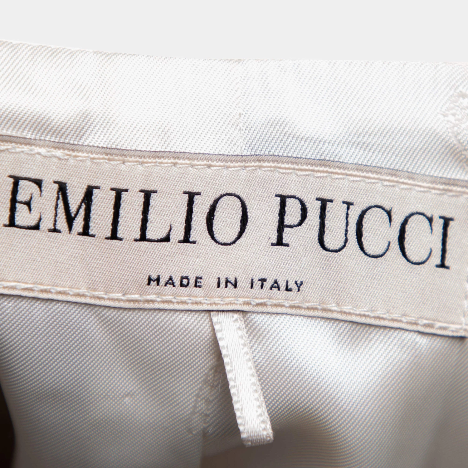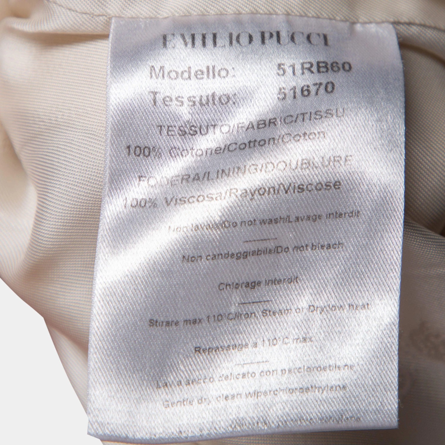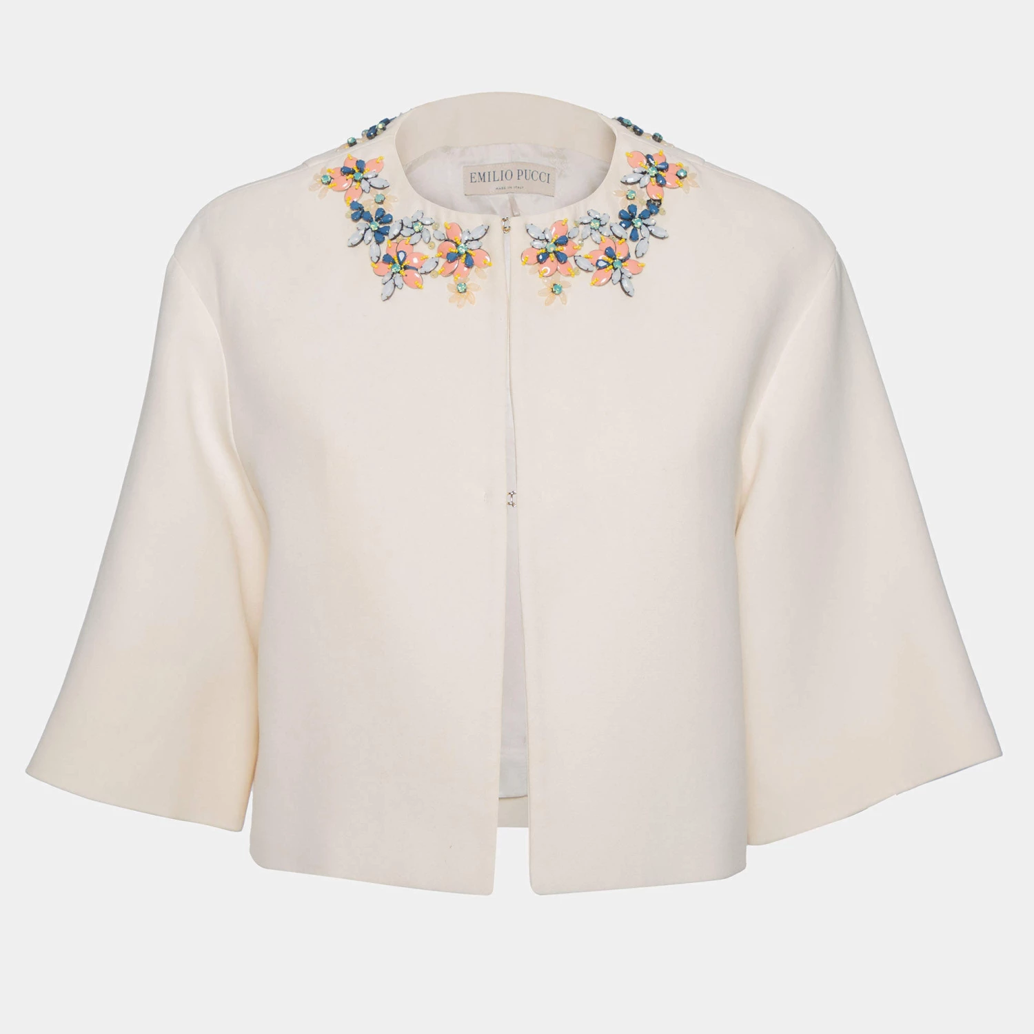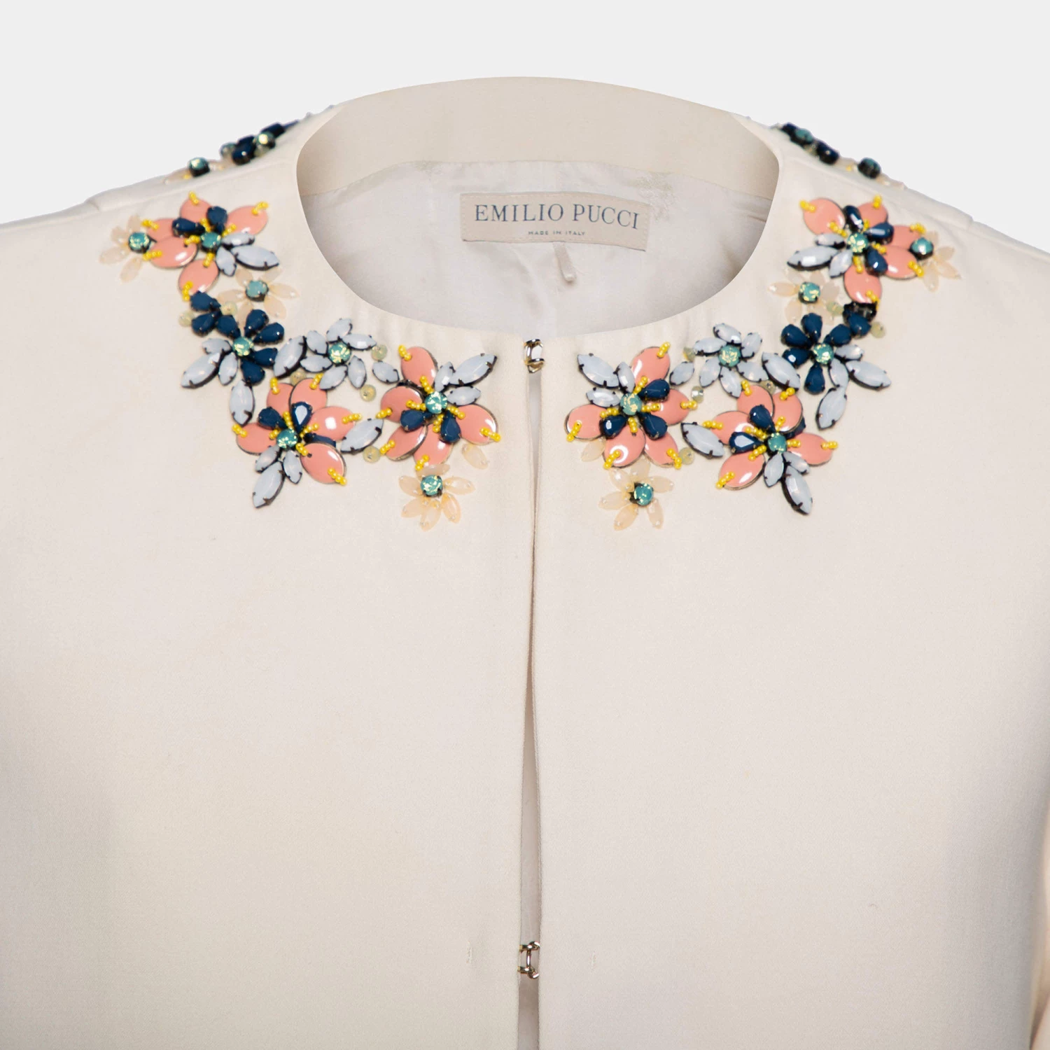 This Emilio Pucci jacket will add a fashionable finishing touch to your OOTD. The prized jacket is made of cotton and designed for comfort. It has wide sleeves, an embellished neckline, and front hook closure.
