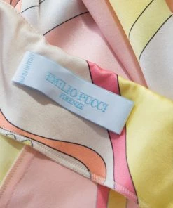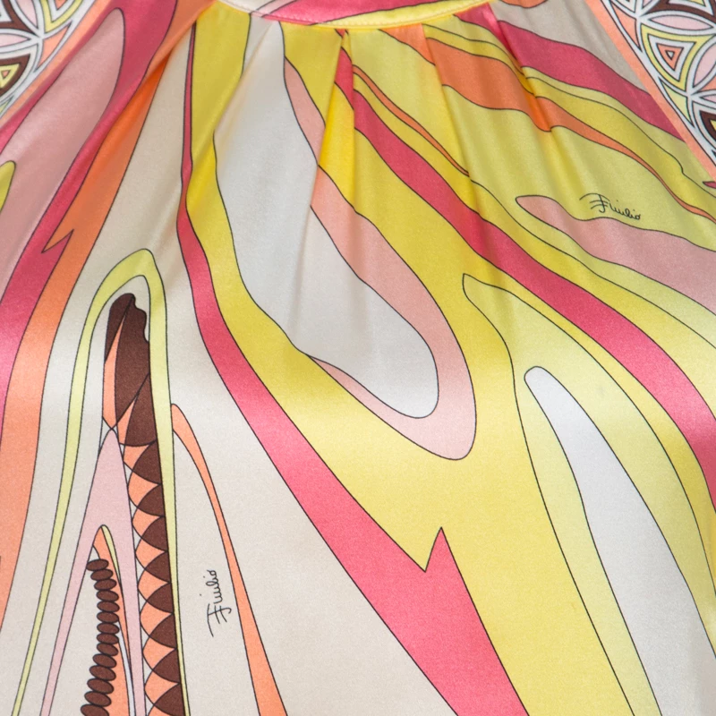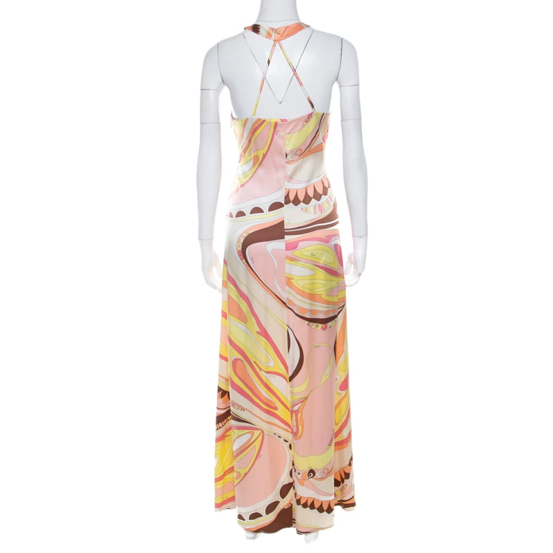 Put on this gorgeous Emilio Pucci dress and look like a diva. Elegant and classy, you can never go wrong with this multicolour piece, be it any occasion. Covered in abstract prints, this halter maxi dress will work just right with gold sandals.