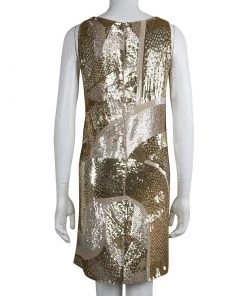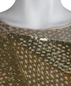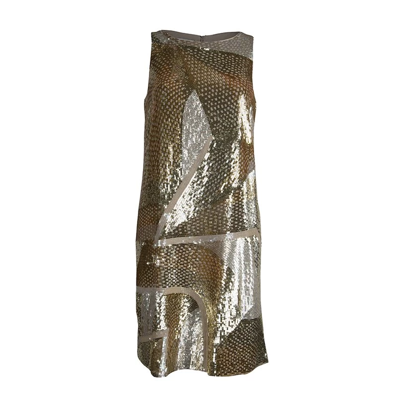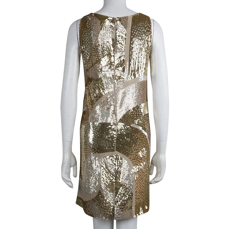 To bedazzle any party, this silk dress in gold tone is all you need. With a classic boat neck, it comes with a sleeveless design and concealed rear zip closure. In a comfort fit design, it is an above the knee length dress with gold sequin embellishments for extra grandeur.