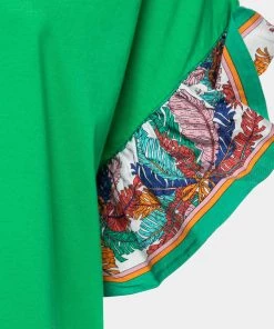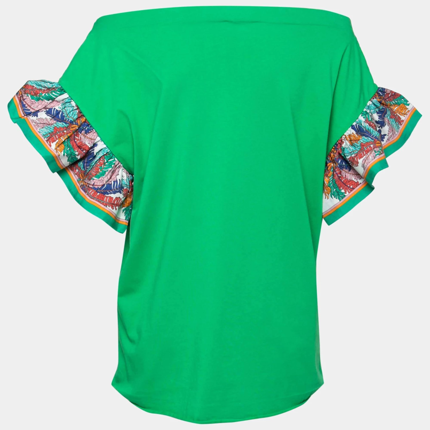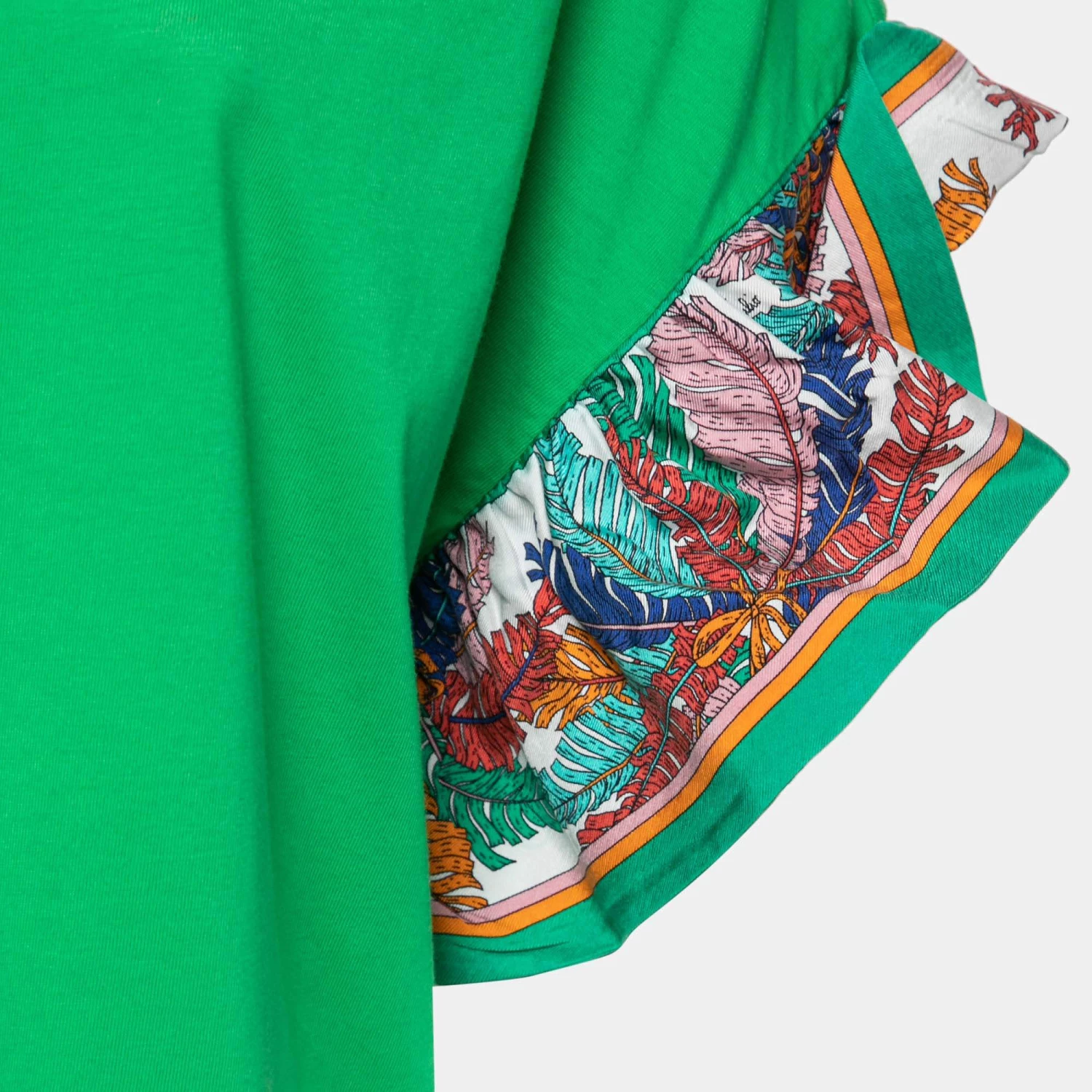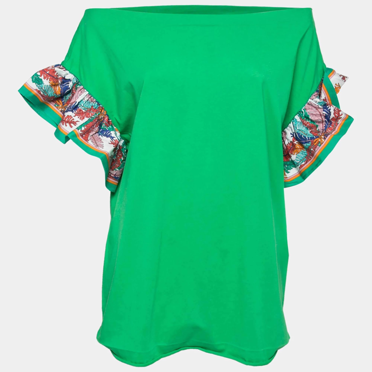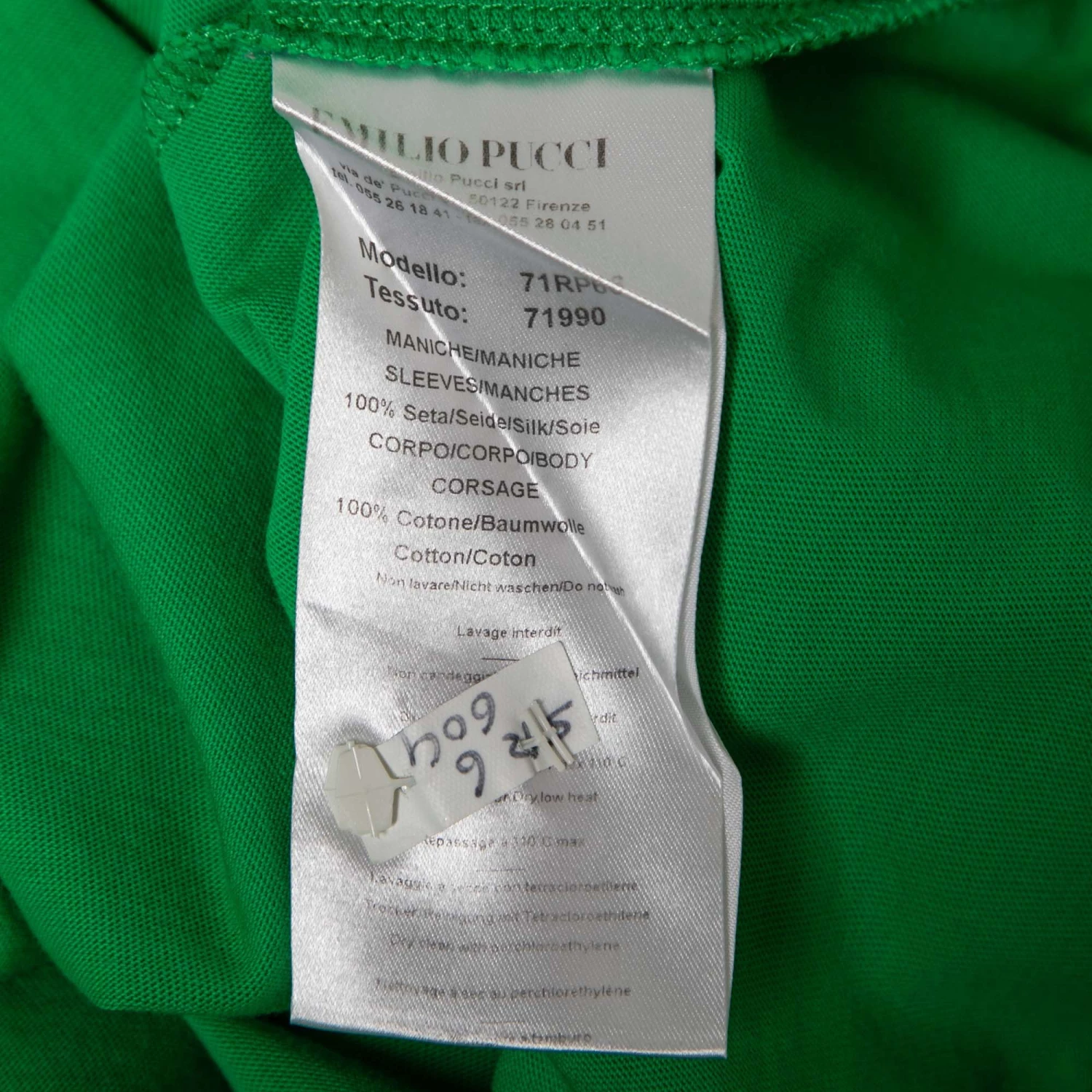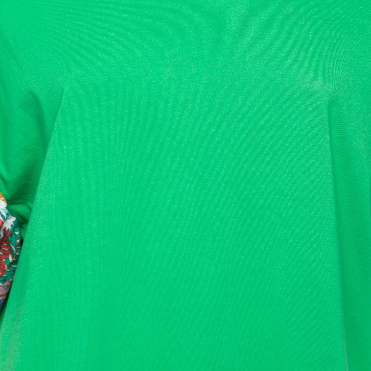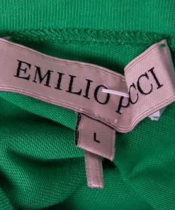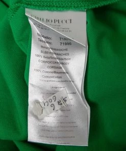 Known for its fancy and colorful prints, this T-shirt from the house of Emilio Pucci grants your a versatile style with a splash of color. It is made from green cotton and silk, with contrast colorful sleeves. It will surely be your favorite pick in no time!