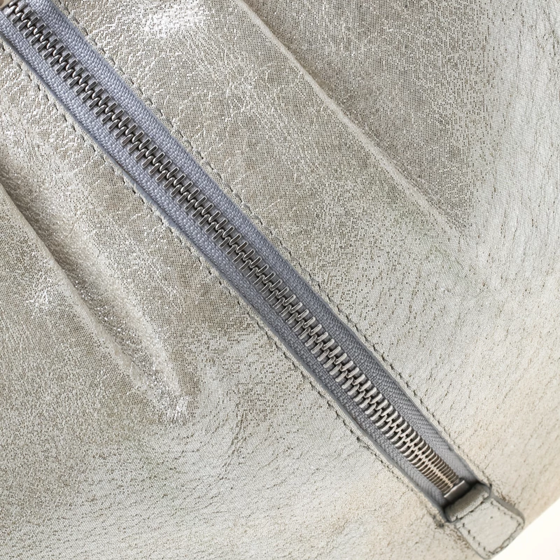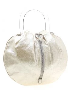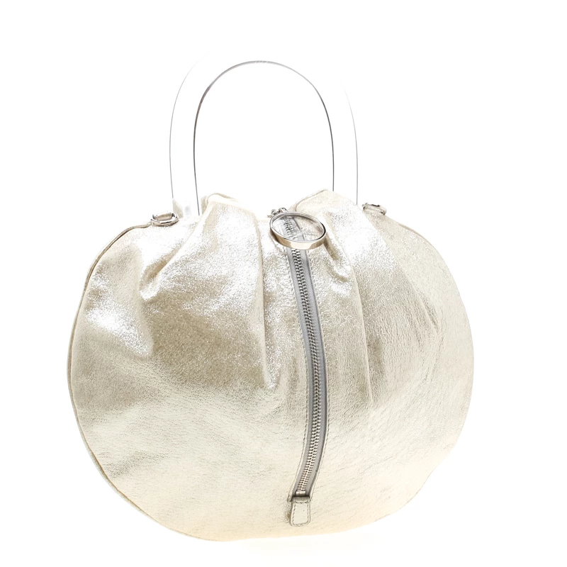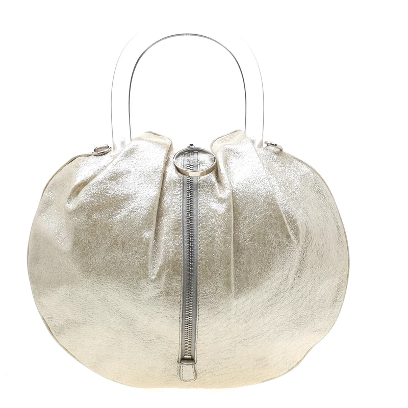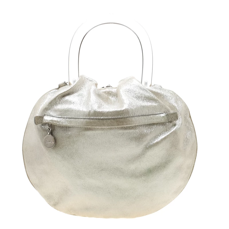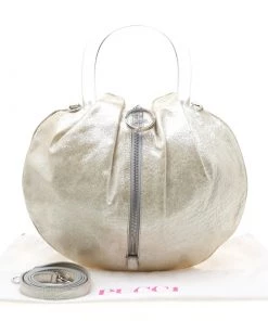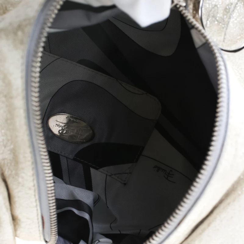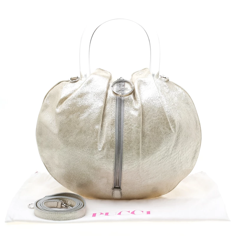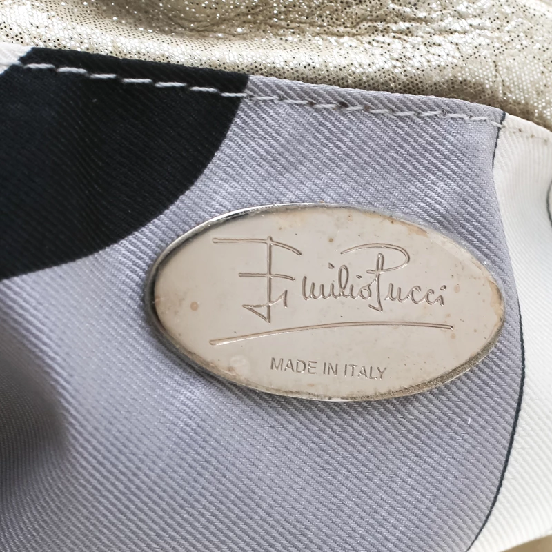 This crossbody bag from Emilio Pucci is creation you will love to own! Crafted from metallic light beige leather, this bag features a front zip detail, a rear zip pocket and a long shoulder strap along with a top handle. It opens to a fabric lined interior that can hold all your essentials in place. This conversation starter style is perfect to take to the parties and dinners!