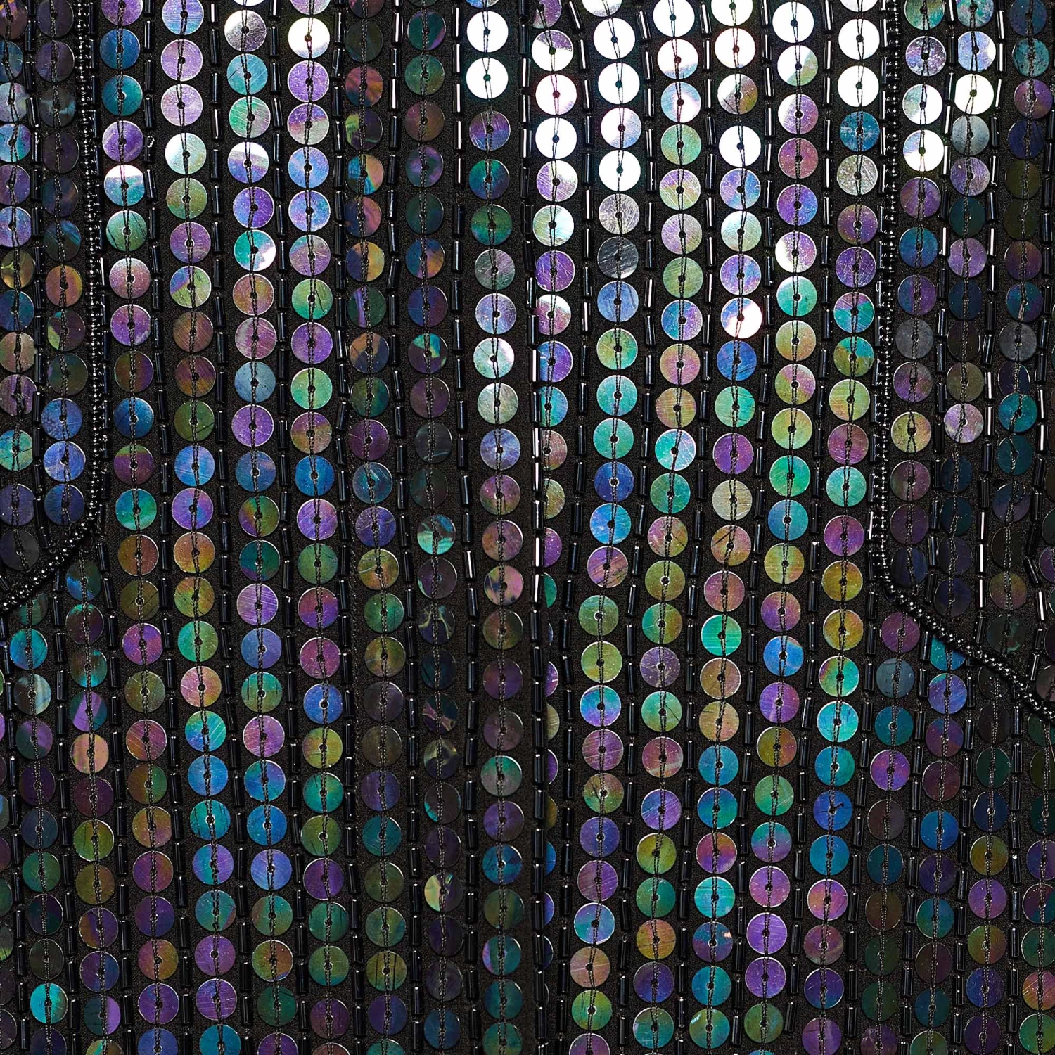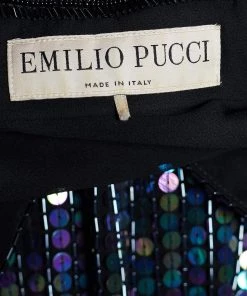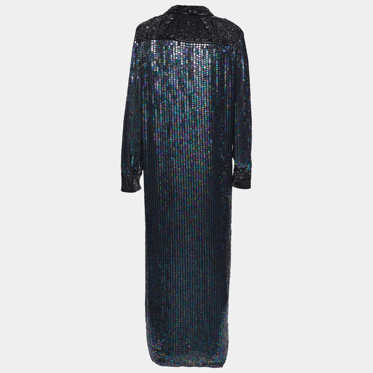 From the House of Emilio Pucci comes this shirt dress that will elevate your style and make you look classy. It is tailored using metallic sequin and bead-embellished silk fabric. It has long sleeves and a button-front closure. It accommodates two pockets. Make a statement as you wear this dress.
