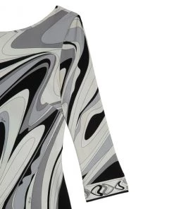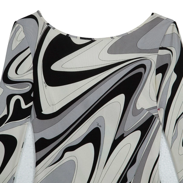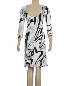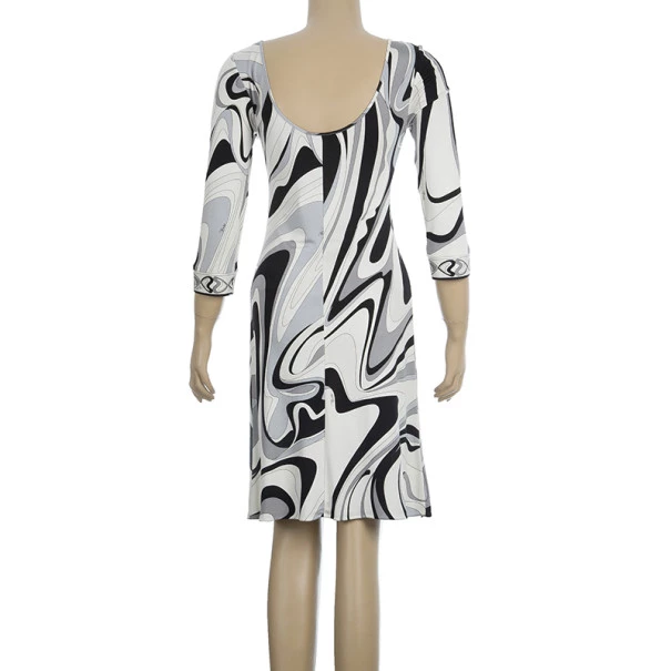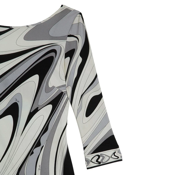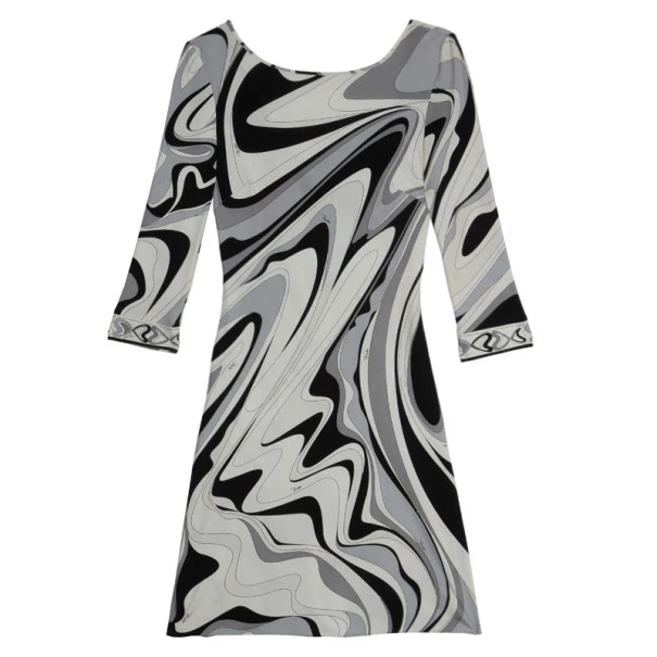 We love this Emilio Pucci Monochrome Print stretch Dress! Featuring black, grey and white geometric print, this dress is effortlessly elegant. It has long sleeves and a round neckline. Original Retail Price: US $995