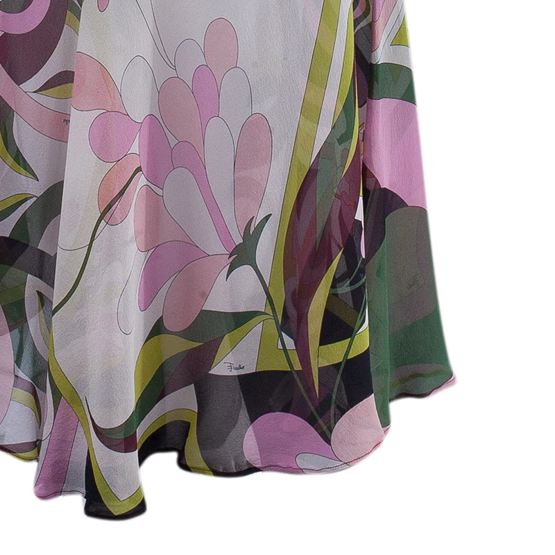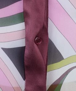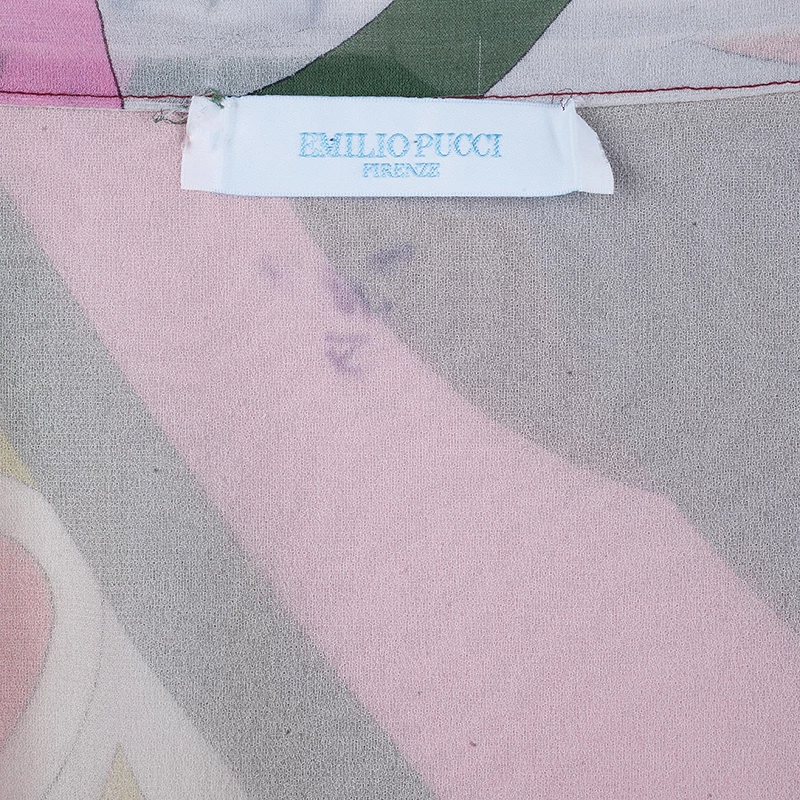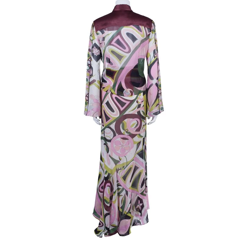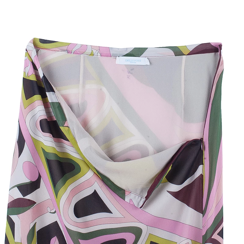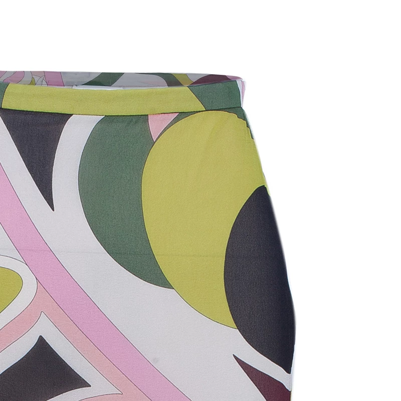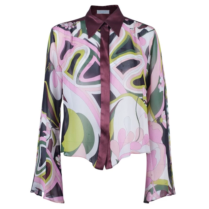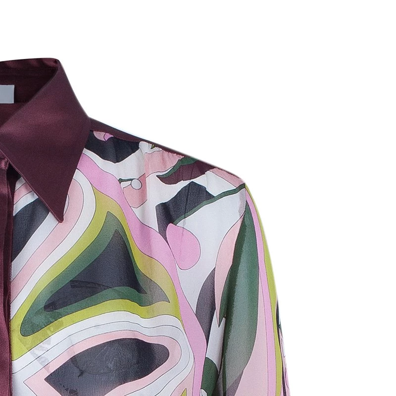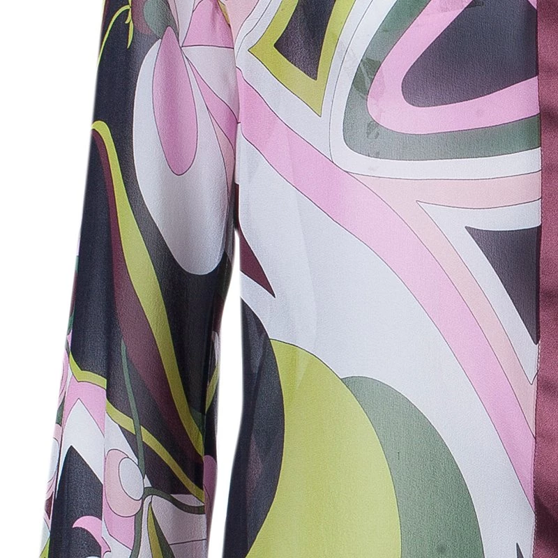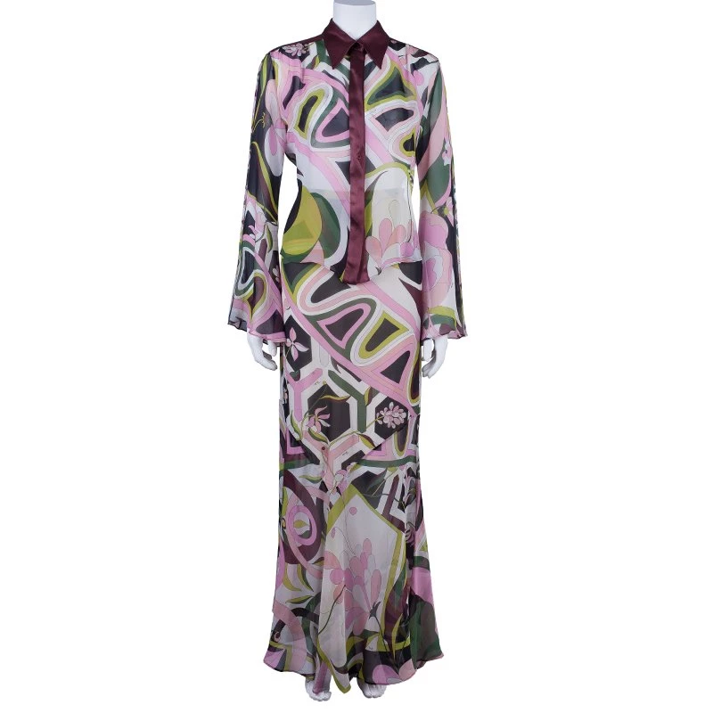 Emilio Pucci is adored by many for his exotic designs and prints. This multicolor top and skirt set is made from silk and comes in an overall abstract pattern. It includes a shirt with open collar and hidden button-up closure highlighted with maroon satin and full length wide sleeves. The skirt fits on the waist with a side-zip closure and is designed with a flowing drape-like effect at the hem.