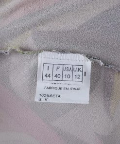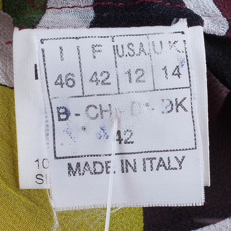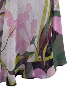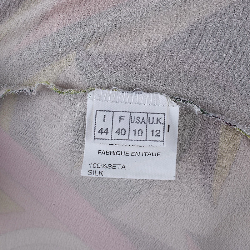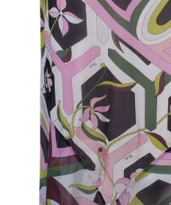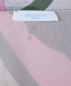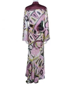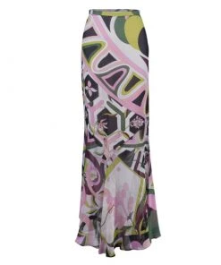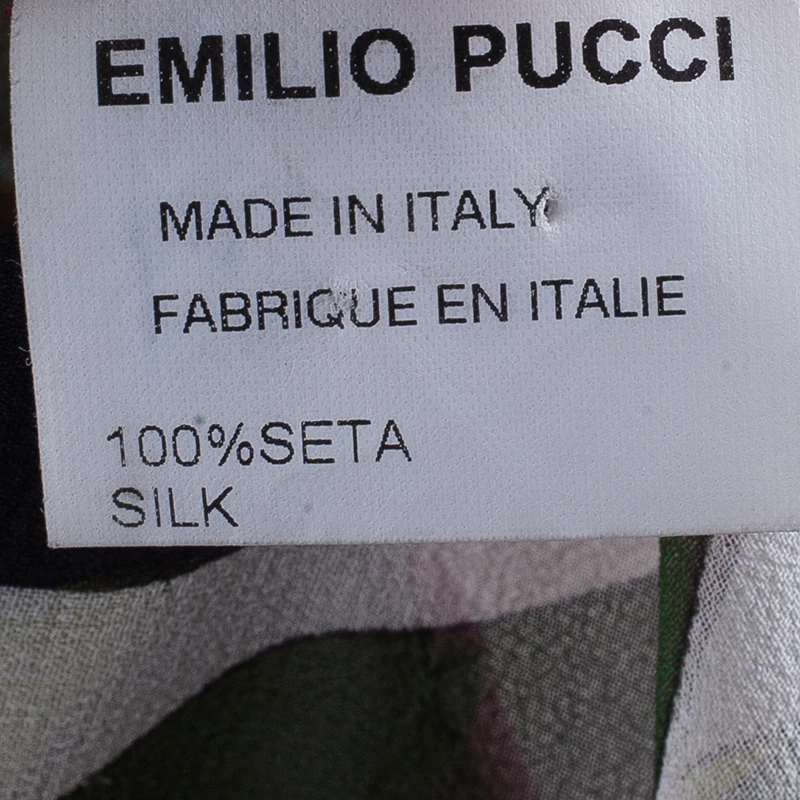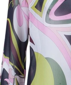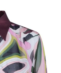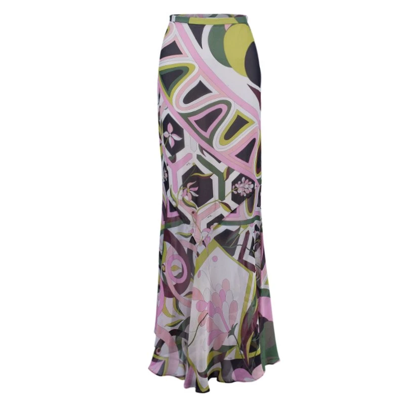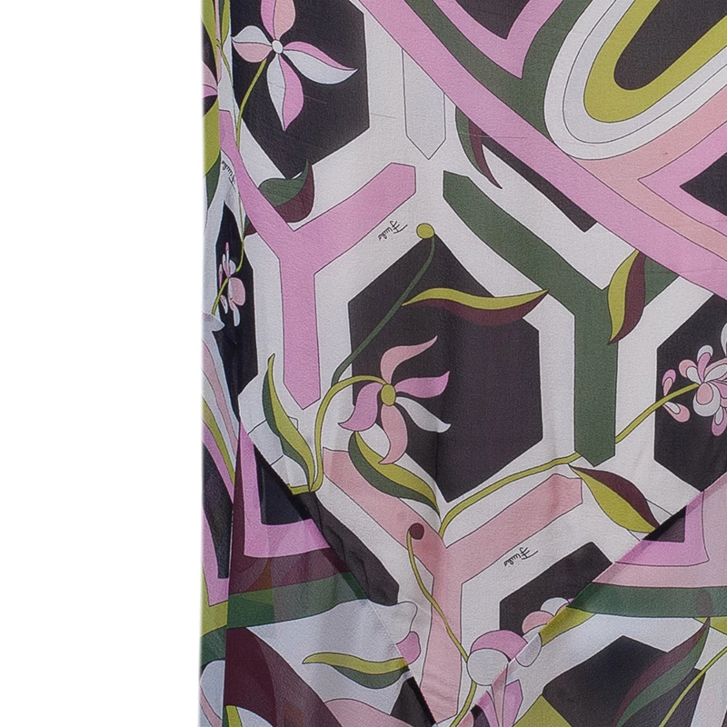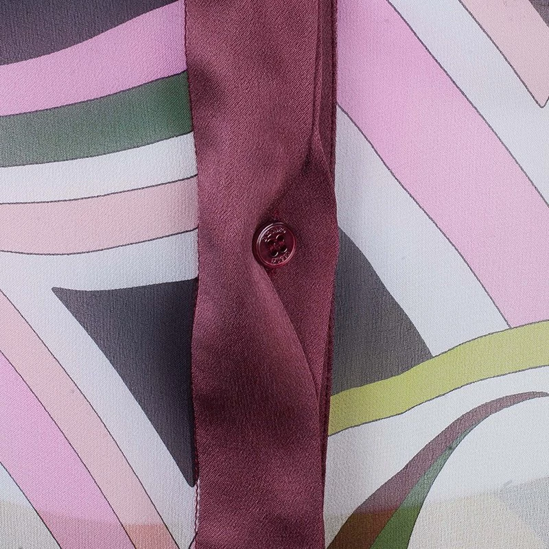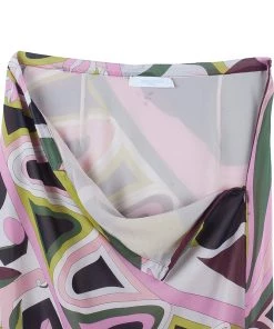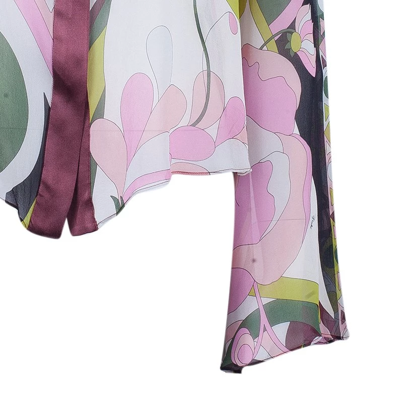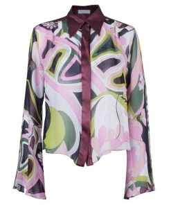 Emilio Pucci is adored by many for his exotic designs and prints. This multicolor top and skirt set is made from silk and comes in an overall abstract pattern. It includes a shirt with open collar and hidden button-up closure highlighted with maroon satin and full length wide sleeves. The skirt fits on the waist with a side-zip closure and is designed with a flowing drape-like effect at the hem.