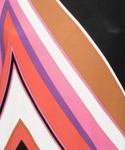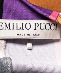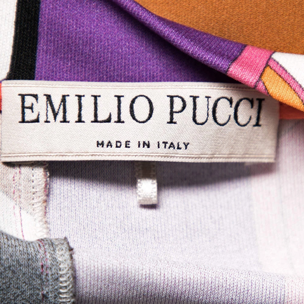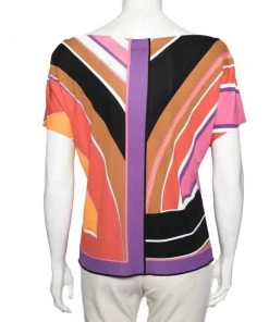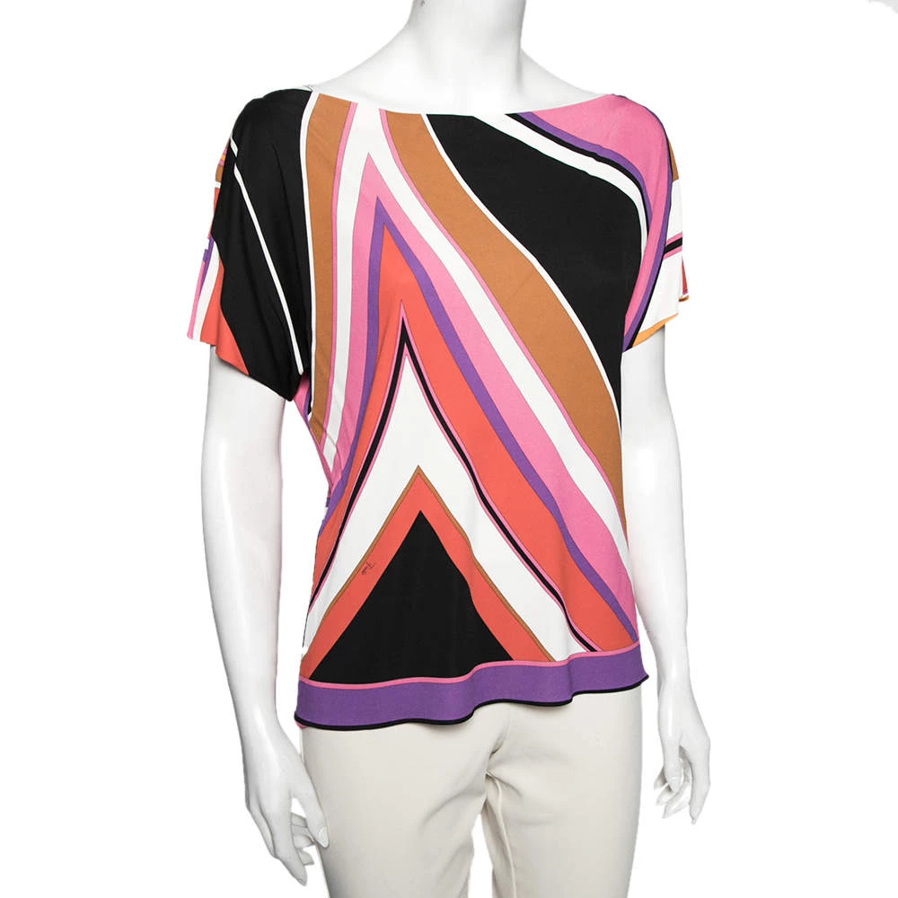 Vibrant colors and relaxed silhouette define this Emilio Pucci top. Exhibiting the brand’s expertise in attractive prints, it is highlighted with an abstract print design and features short sleeves and a boat neckline. Pair it with a black skirt or pants to complete the ensemble.