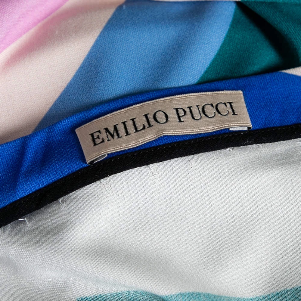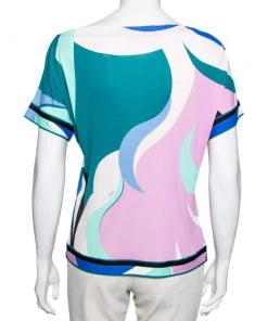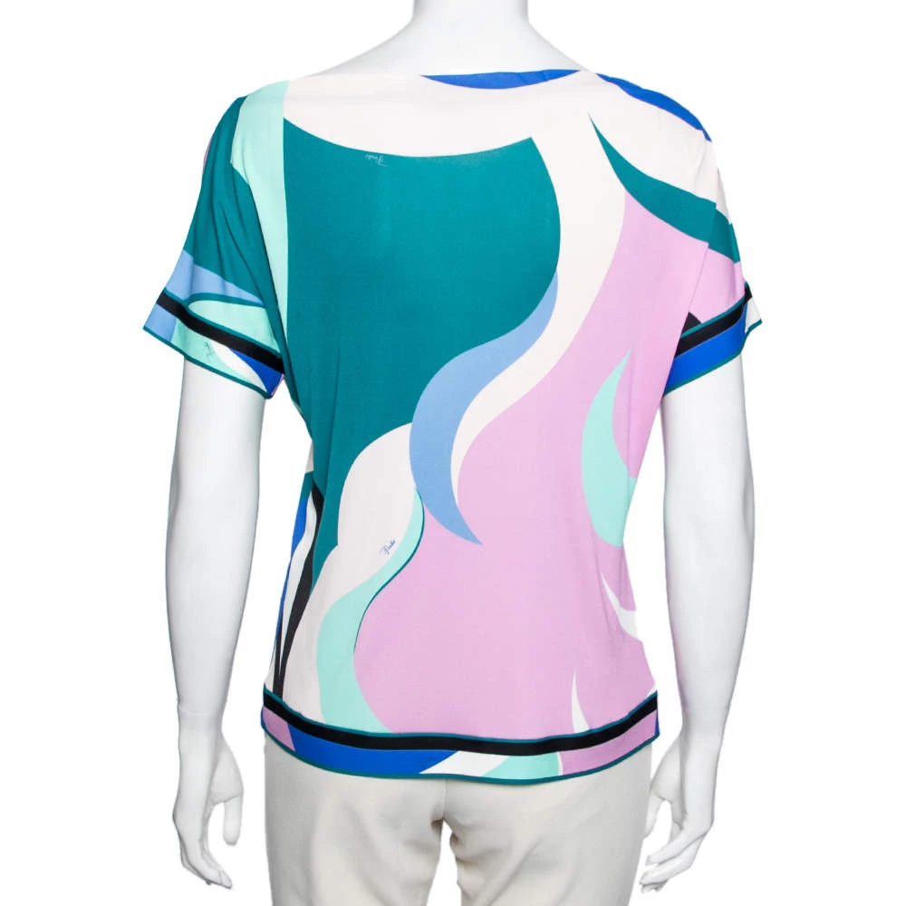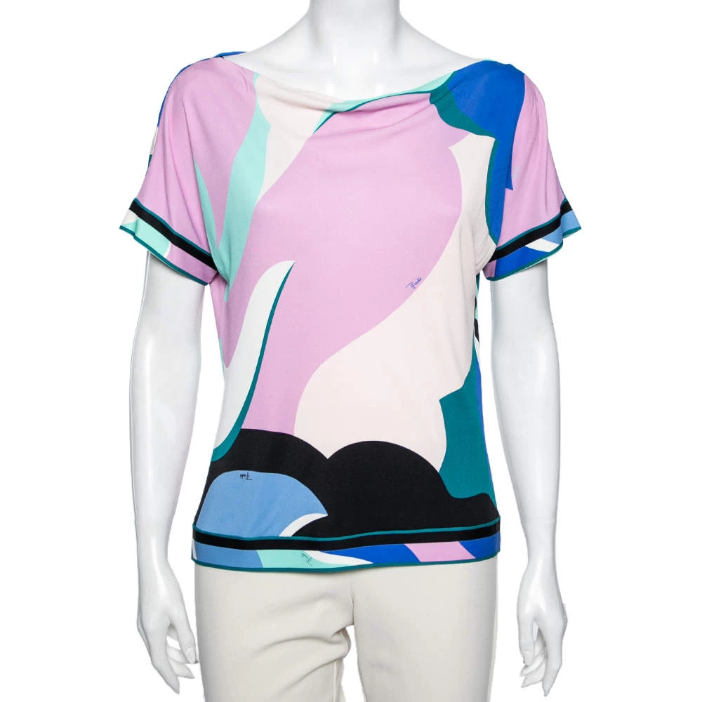 This top from Emilio Pucci is here to let you explore a new style. It is creatively stitched using multicolored cotton knit fabric with an abstract print highlighting its appearance. It is designed with short sleeves and has a comfy, feminine silhouette. Complete your look by matching the top with black trousers and flats.