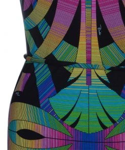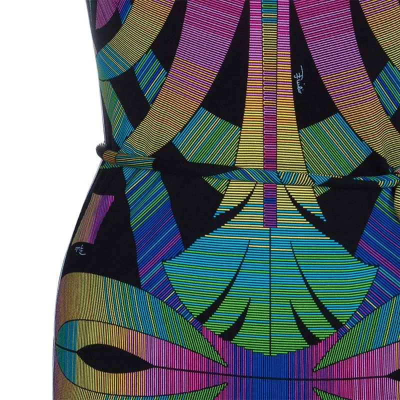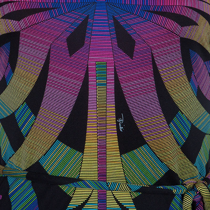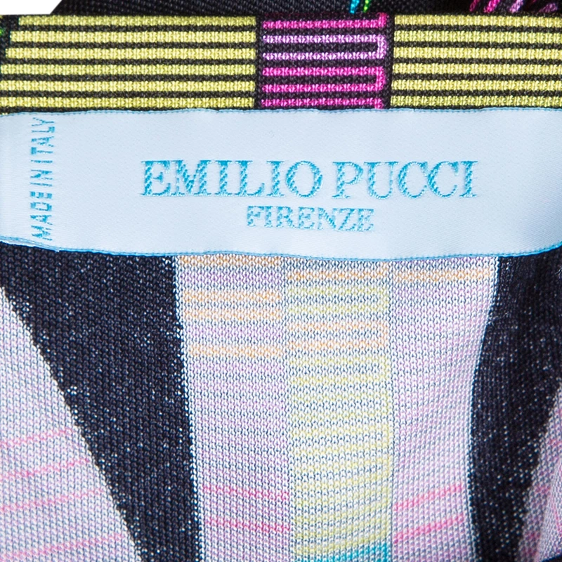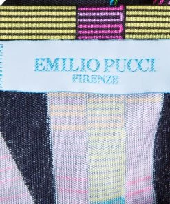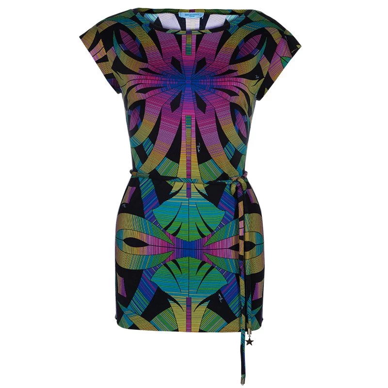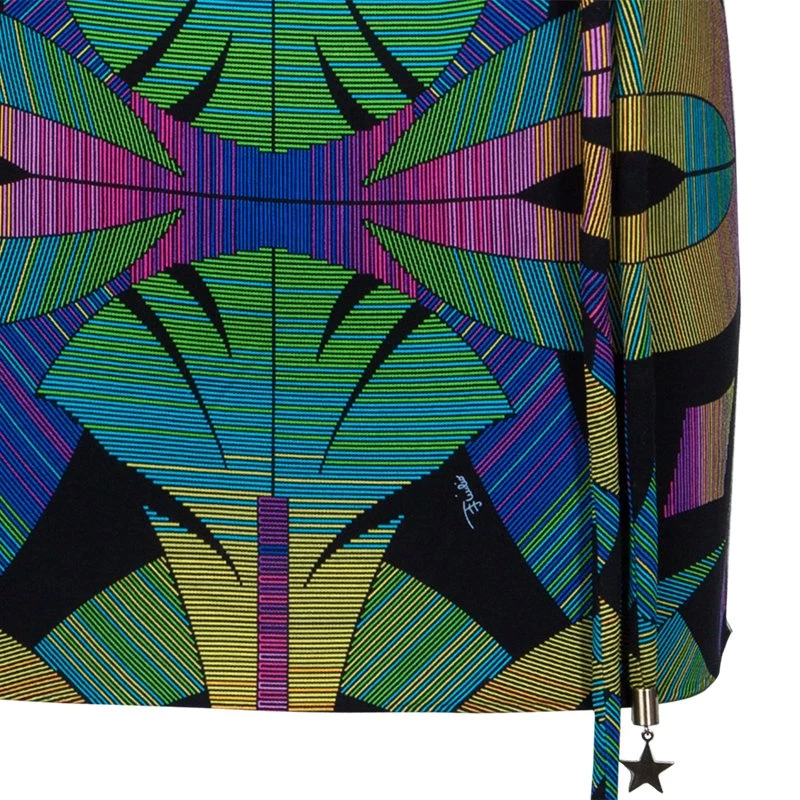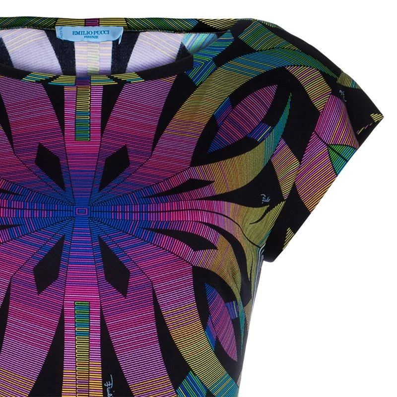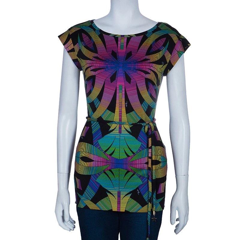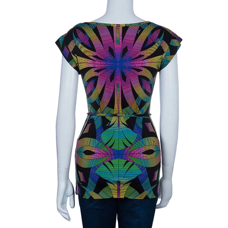 Designed with colorful and gorgeous print, this Emilio Pucci tunic top is certainly one of the brand’s most beautiful creations. Showcasing a very artistic print, this silk top features a slight boat neck, cap sleeves, and a waist belt for comfortable fitting.