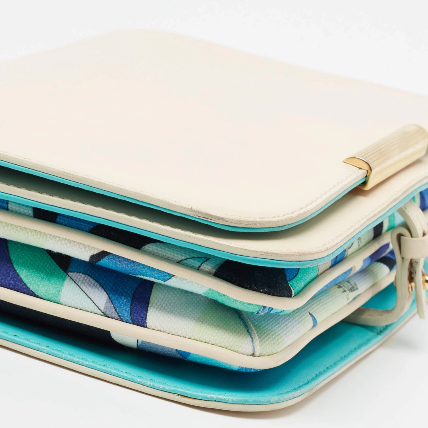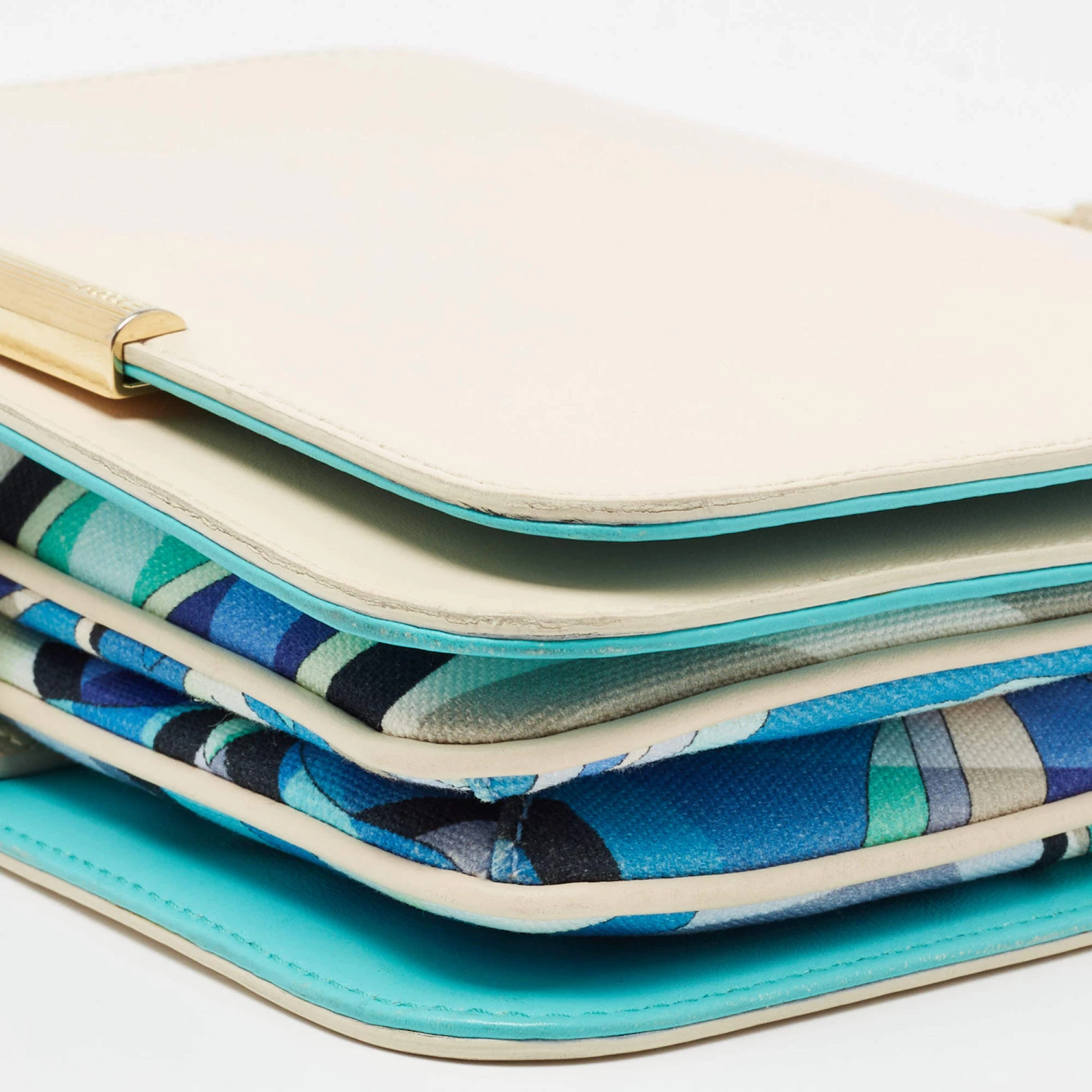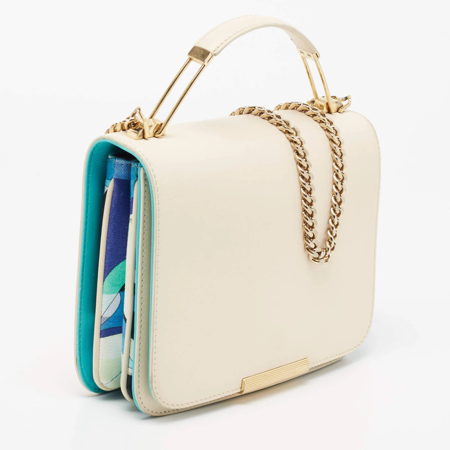 This Emilio Pucci bag is a timeless piece that can last you season after season. This bag is made of leather as well as printed canvas and is sized to house all the things you need. It has a top handle, a long shoulder chain, and lined compartments.