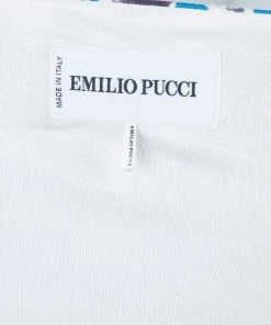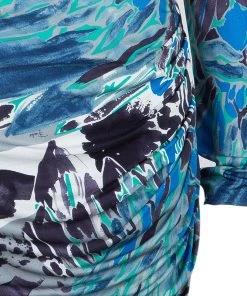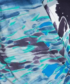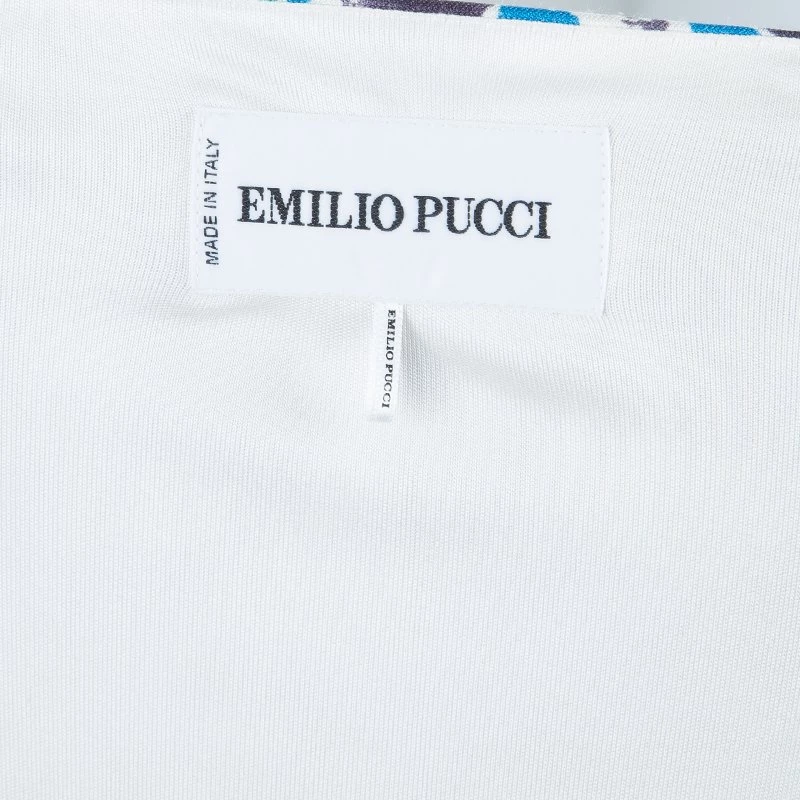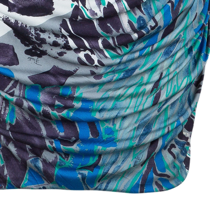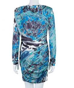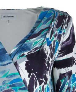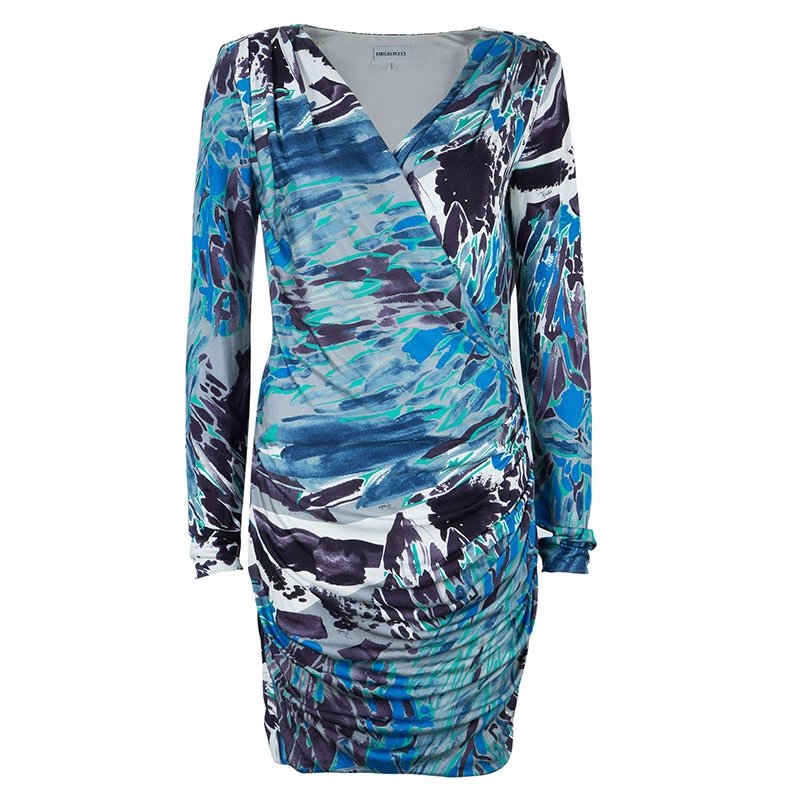 A cool abstract aqua print gives an eye-catching style to this dress by Emilio Pucci. Tailored from pure silk, it features fitted wrapped bodice featuring a v-neckline and long sleeves. The ruched side gives a subtle drape effect on the knee-length skirt.