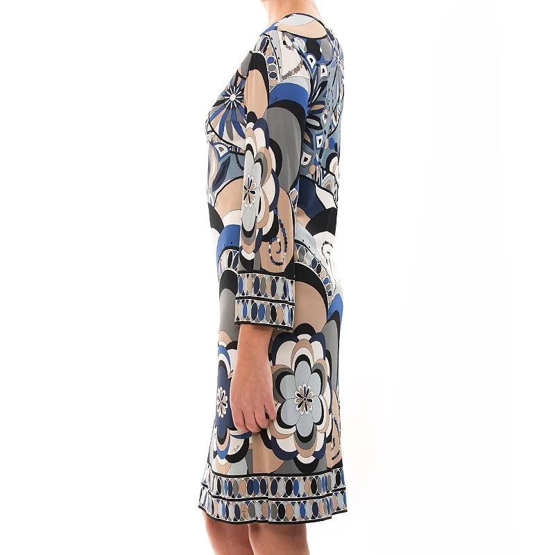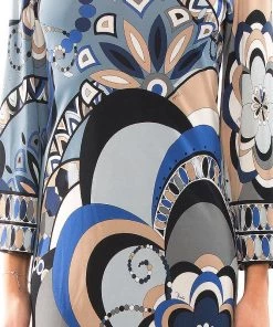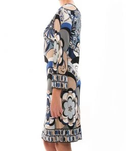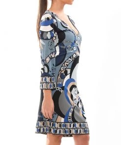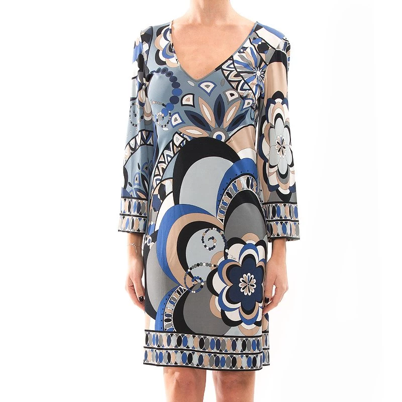 Emilio Pucci brings out the best fashion forward piece when it offers a new jersey knee-length dress to the public. This multicolored printed dress is sleek and modern which could be adorned on formal days with stylish accessories to accentuate the overall look. The deep V neckline and the floral prints of blue, black and beige all add to the charm of the dress.
