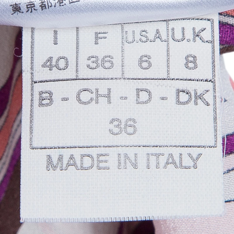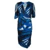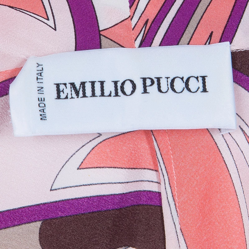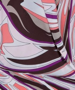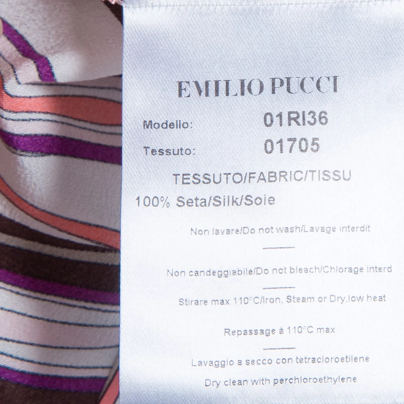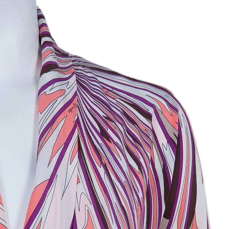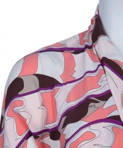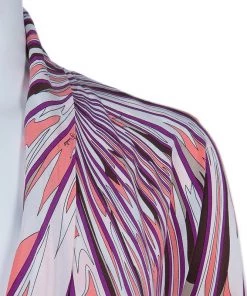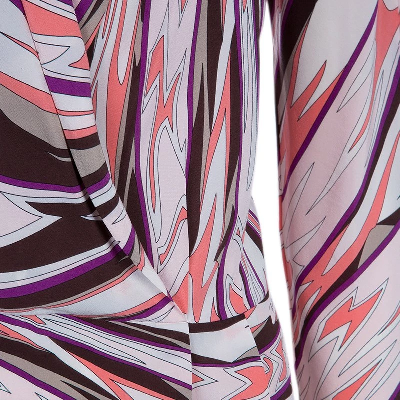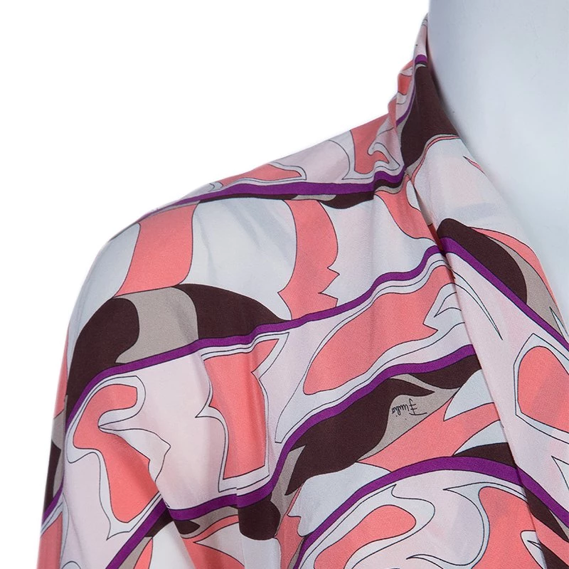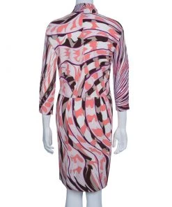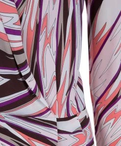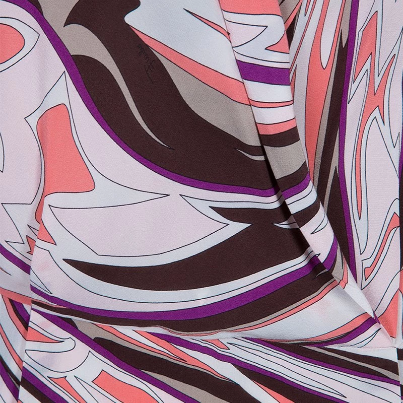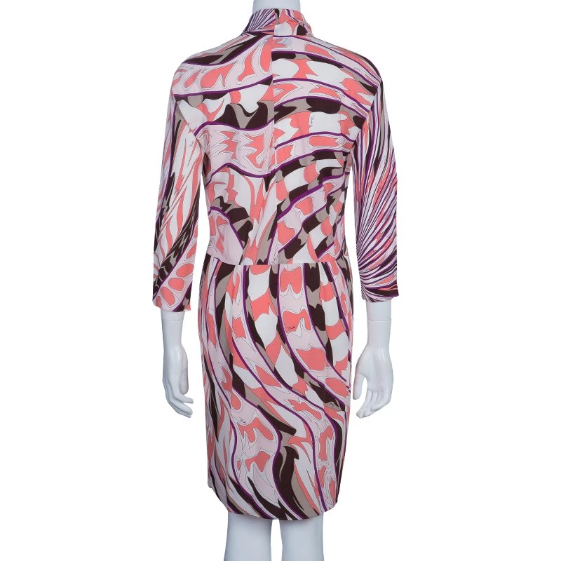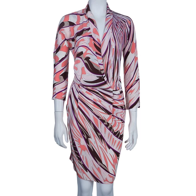 This Emilio Pucci dress is loved for its sartorial elegance and drape. Cut from pure silk, this multicolored dress features abstract print throughout, 3-quarter sleeves, plunging neckline, and a knee-length hem.