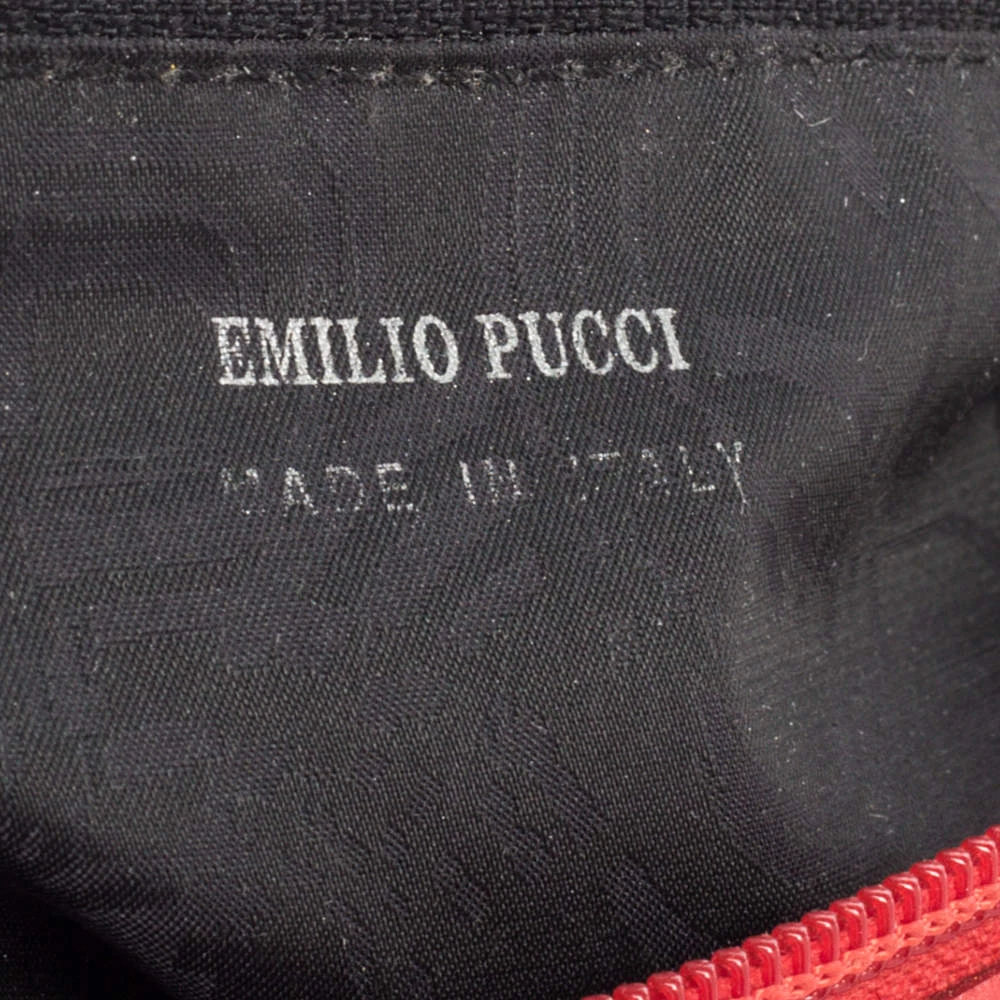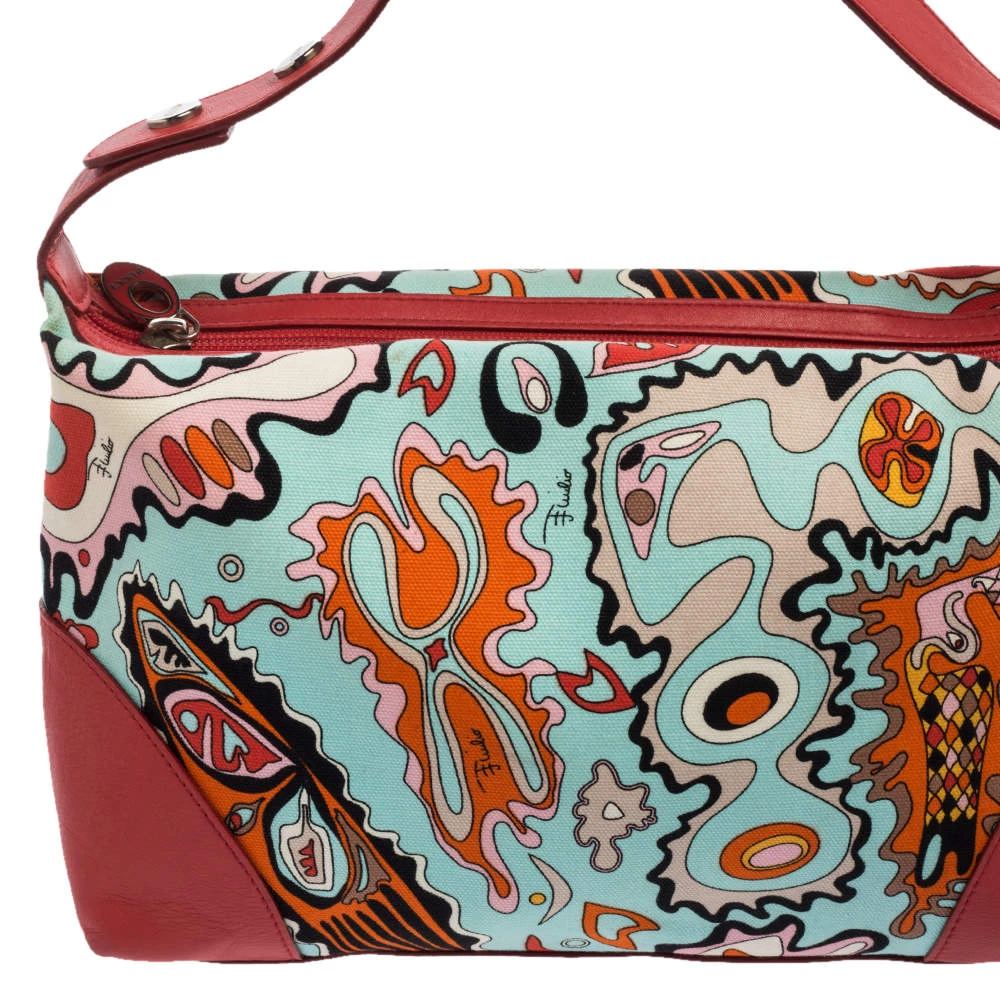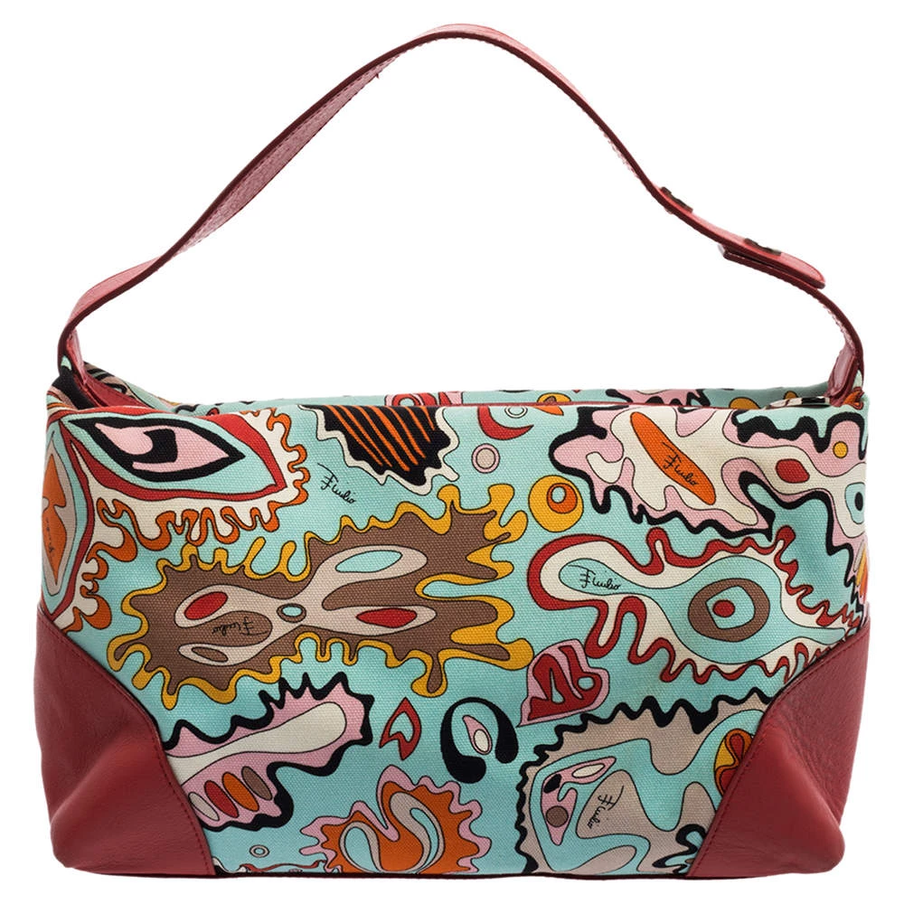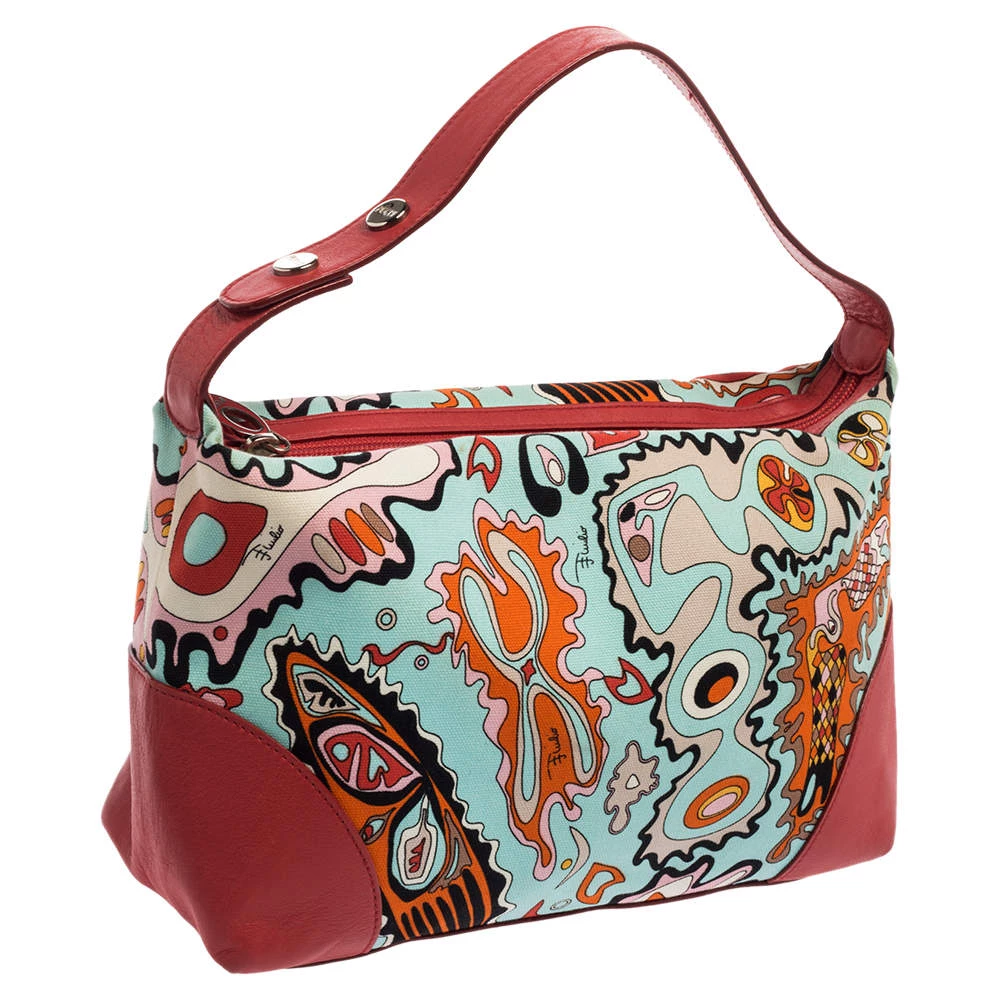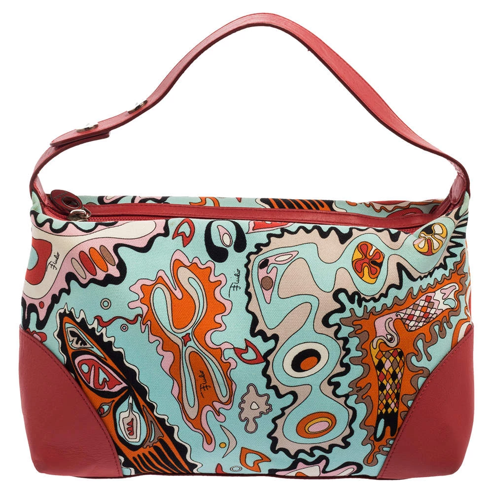 Make a striking appearance with this Baguette bag by Emilio Pucci. This elegant creation is at once a fashion statement as well as a rational necessity. It is crafted from multicolored printed canvas and leather. This bag is completed with silver-tone hardware, a fabric-lined interior, and a single handle drop.
