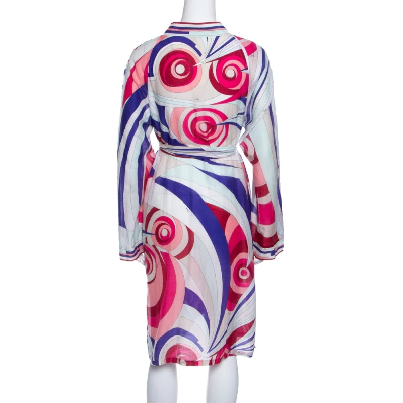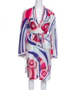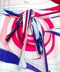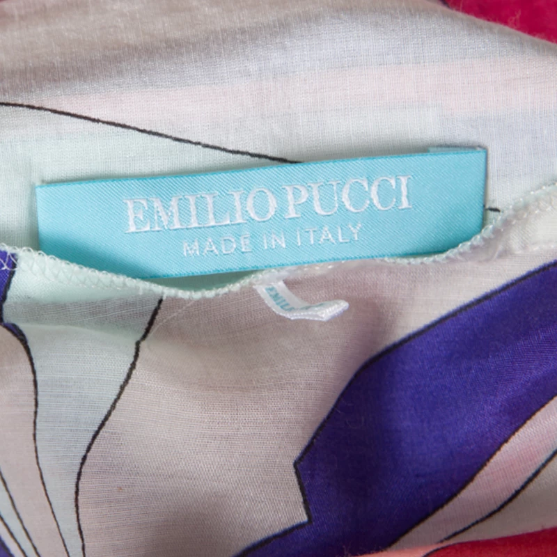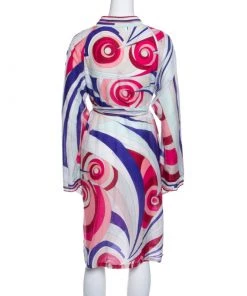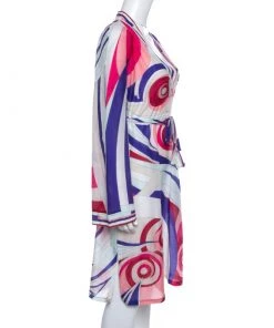 This multicoloured printed tunic dress from the house of Emilio Pucci is a gorgeous piece for your upcoming events. It is designed with long sleeves, a plunging neckline, and a self-tie waist belt. Crafted with a silk-cotton blend, the outfit will lend you a fun, casual look.