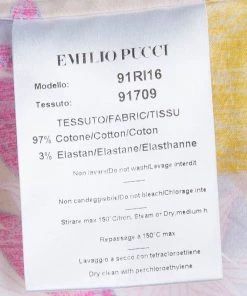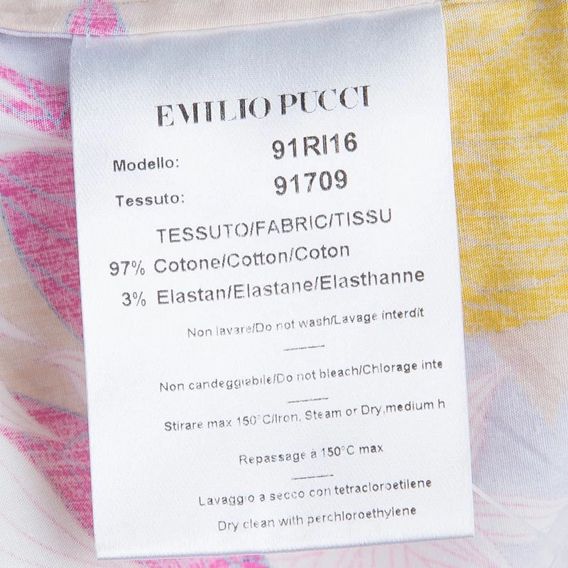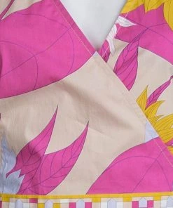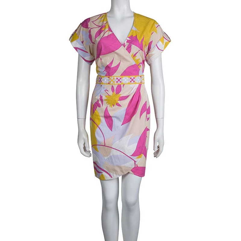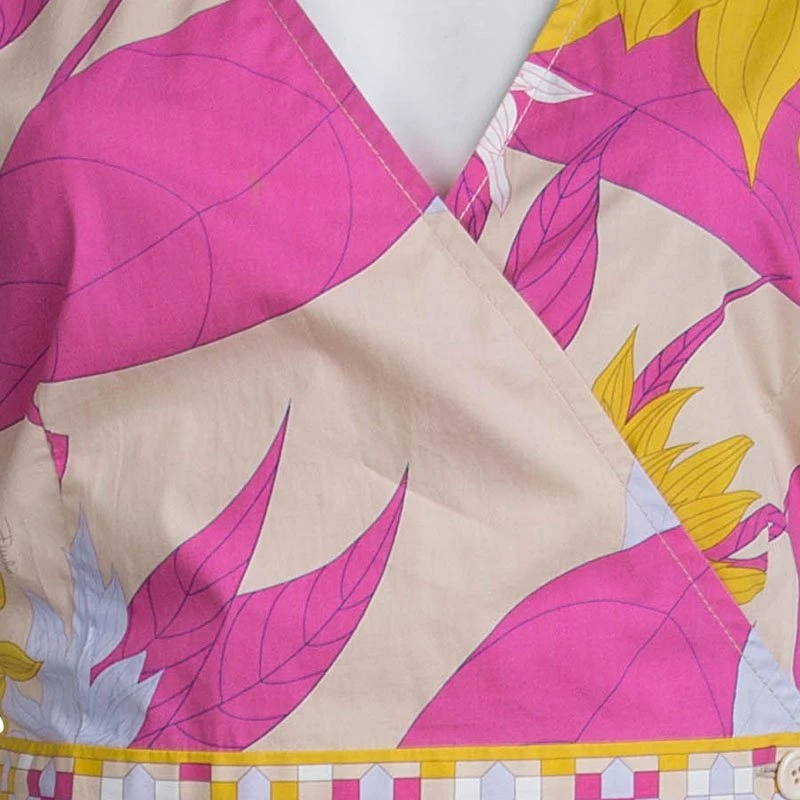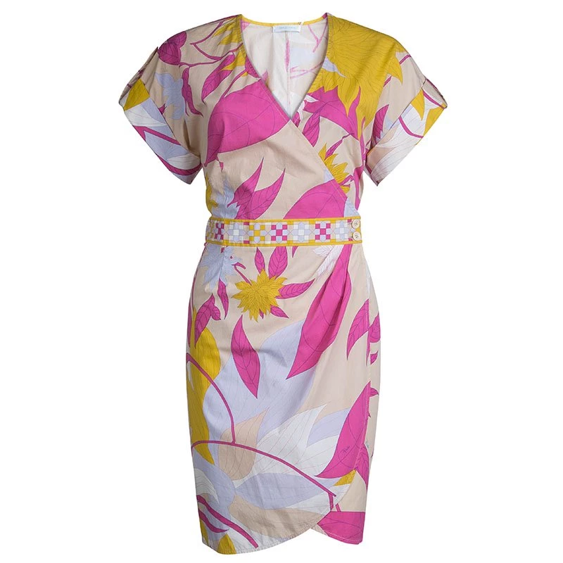 Emilio Pucci takes a fresh approach to modern designs with this wrap dress. Splashed with the signature Miri leaf print, it is fashioned with a plunging V-neck and rolled-up cap sleeves with button fastenings. The printed waistband lends a flattering silhouette and is finished with a button-fastening wrap front.