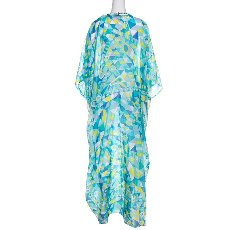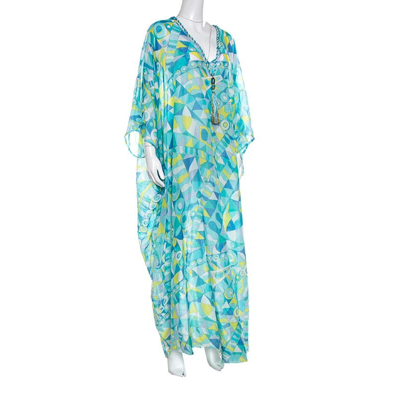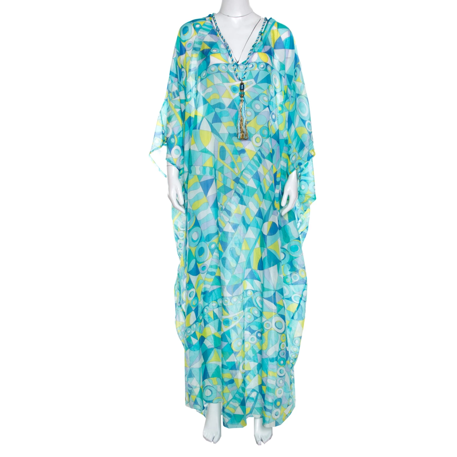 This kaftan from Emilio Pucci is vibrant and gorgeous! It is tailored from quality cotton and silk and designed with colourful prints all over, floor-length hem and a braided detail along the neckline,
