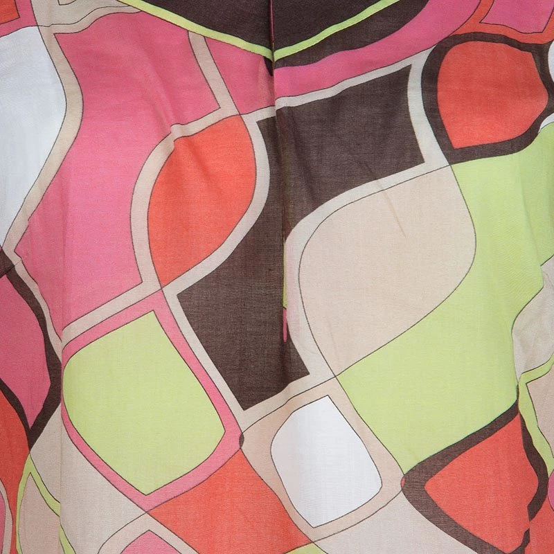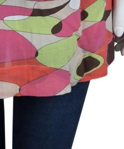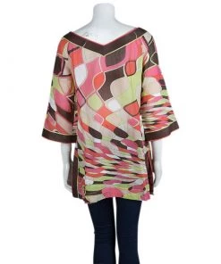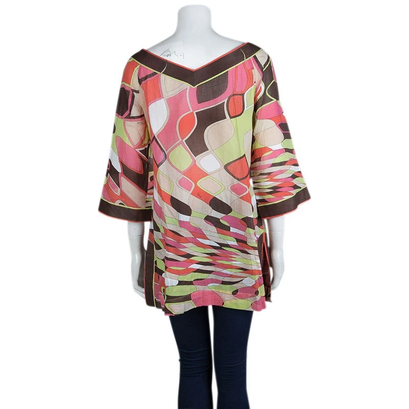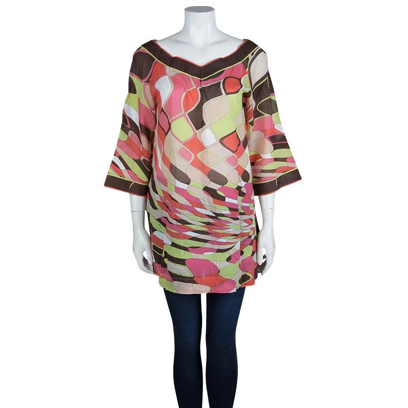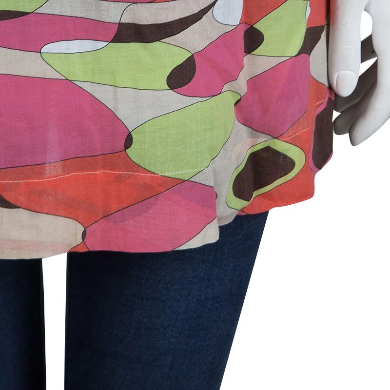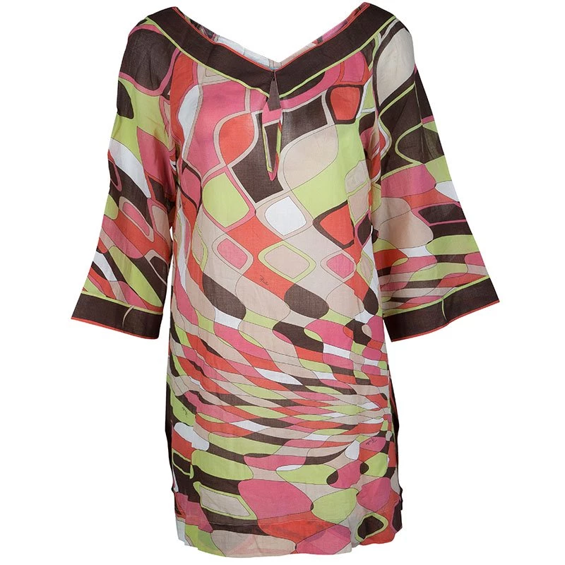 Cut from soft cotton with multi-color prints, this lovely tunic from Emilio Pucci is the perfect blend between comfort and style. Featuring three-quarters sleeves, this stylish tunic has a V neckline on the front and back. The contrast border around the neck and sleeves adds more character to this piece.