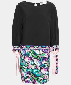 Bring Emilio Pucci’s charm and elegance to your closet with this gorgeous dress. This dress’s pretty prints and multicolored hues perfectly complement the black fabric. It has a midi-length silhouette, tie-detailed sleeves, and a zipper closure. This dress is the perfect accessory to look chic and elegant.