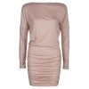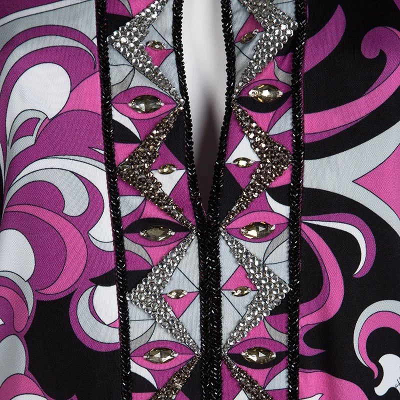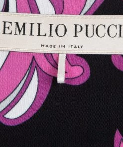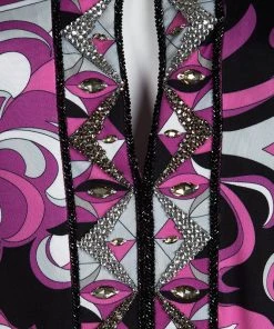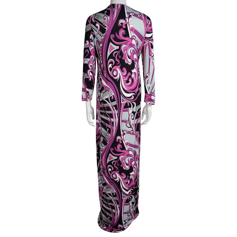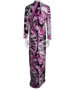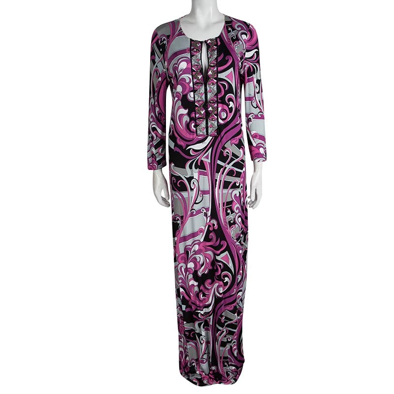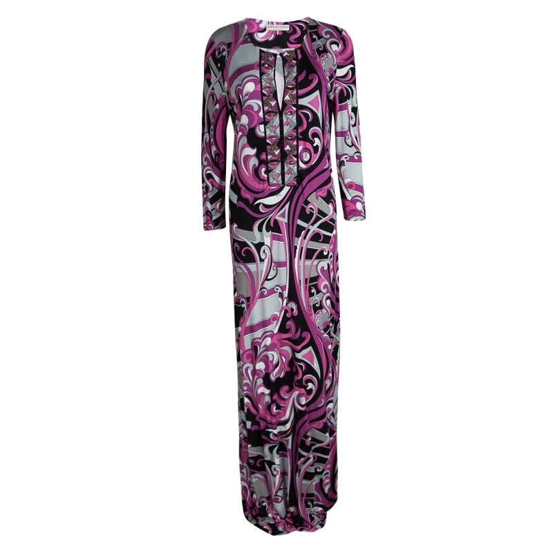 Emilio Pucci’s maxi dress features a multicolor print in a stunning color palette. It comes with an embellished neckline and quarter sleeves. The floor-sweeping length of this piece makes it an ideal wear for grand night events when paired with sky-high stilettos.