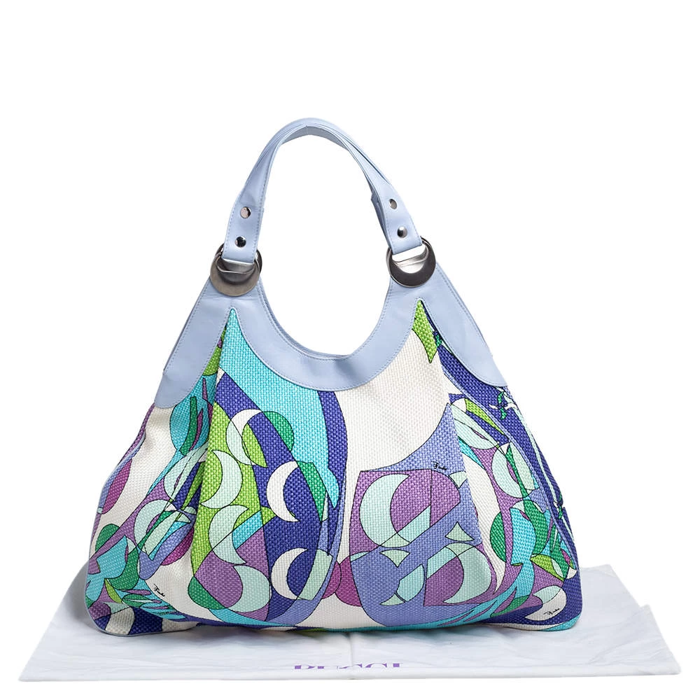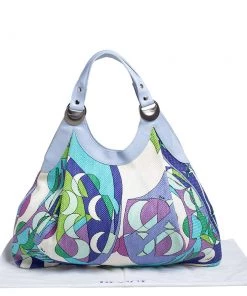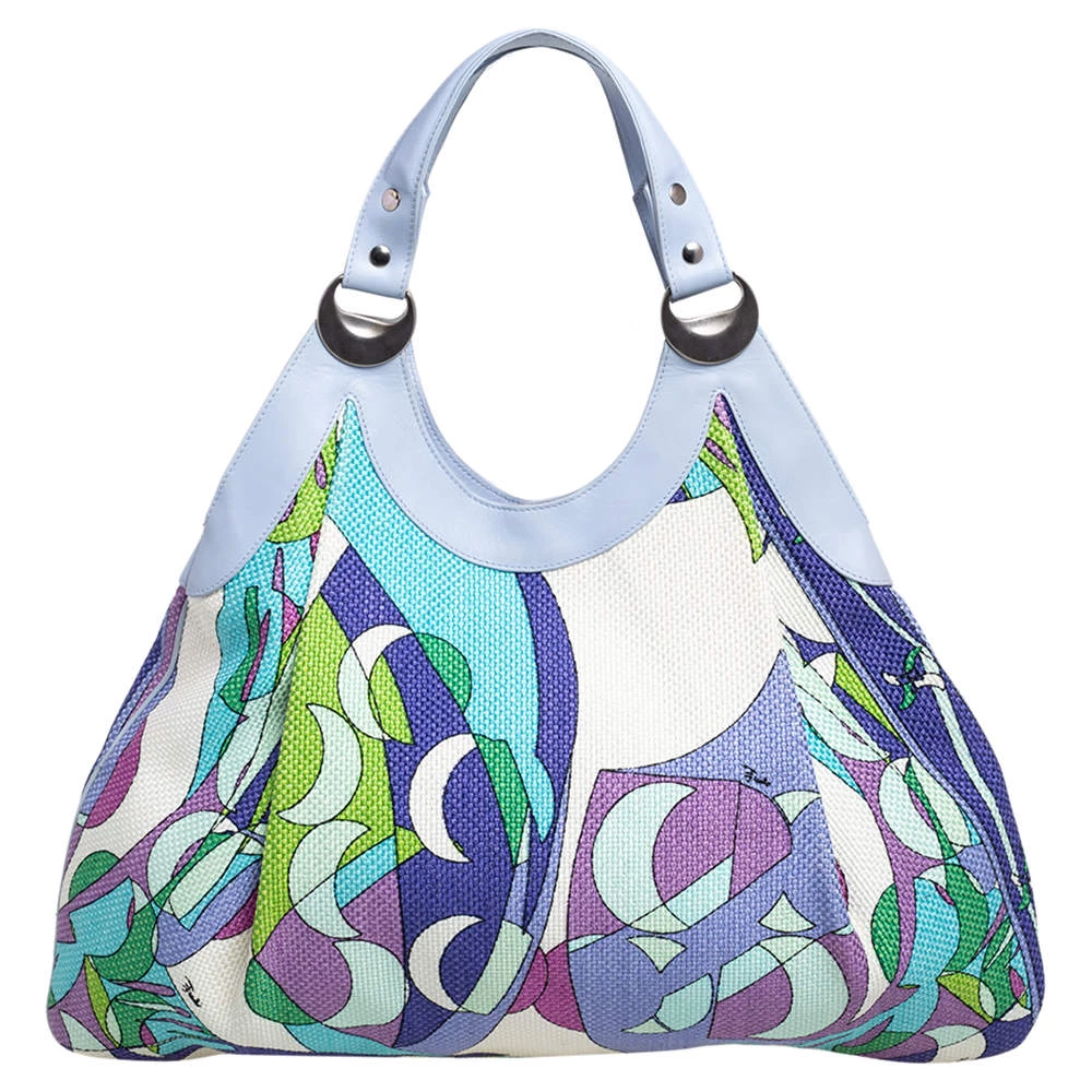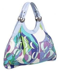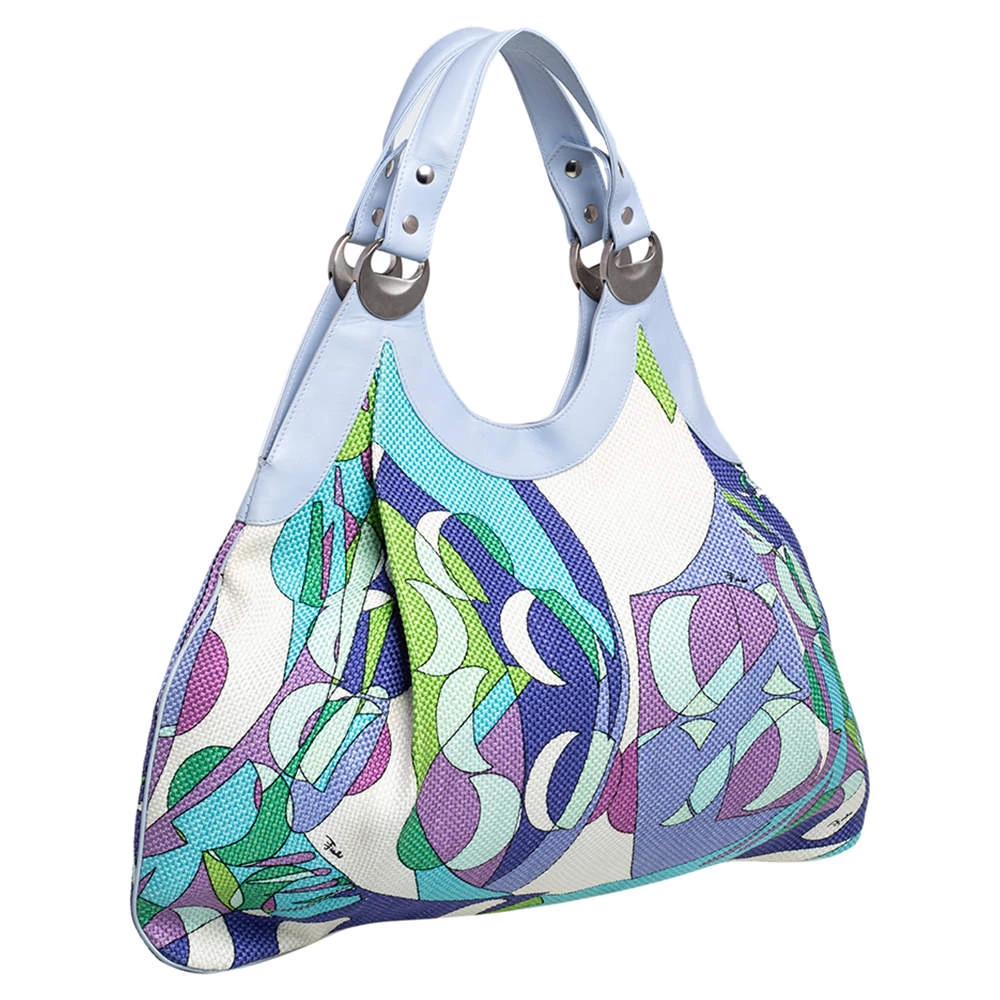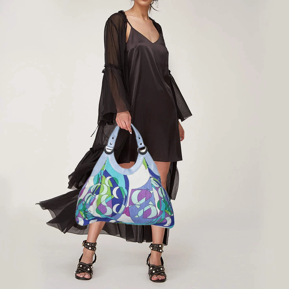 Luxury and elegance get personified with this brilliantly crafted hobo from Emilio Pucci. The bag is made from colorful fabric and leather and comes with twin top handles. The snap button closure opens to a fabric-lined interior that will hold all your necessities.