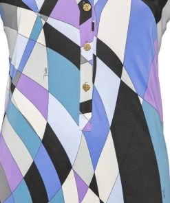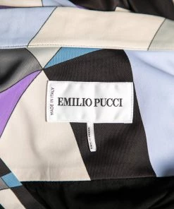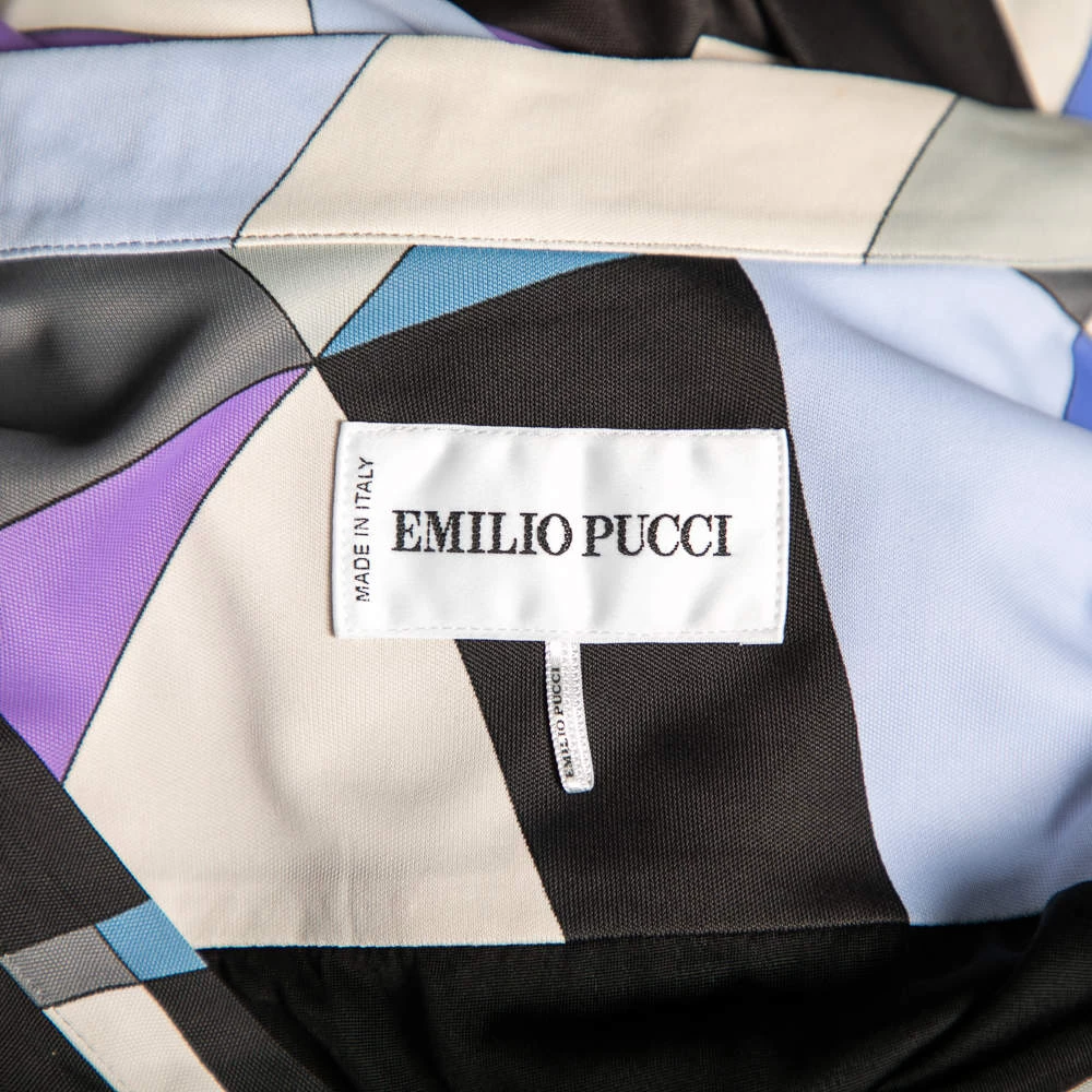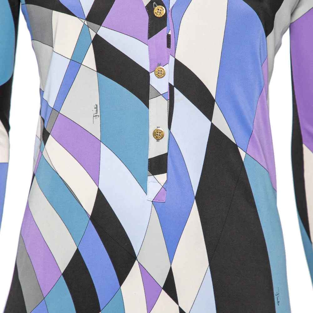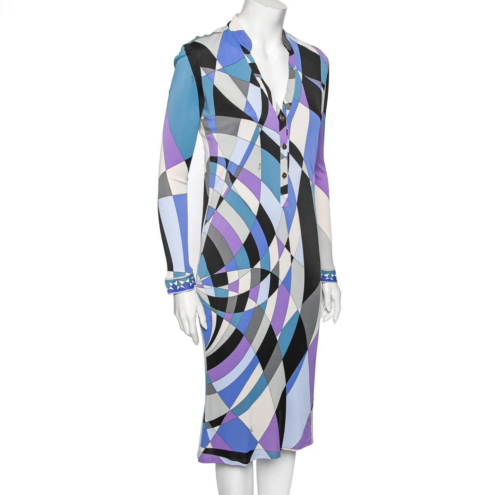 This dress from the House of Emilio Pucci defines elegance and poise with its chic silhouette. It is tailored using multicolored printed jersey fabric into a midi-length silhouette. It has a V-shaped neckline, long sleeves, and buttoned closures.