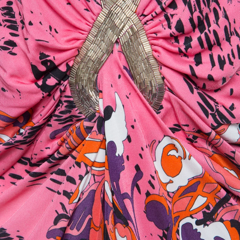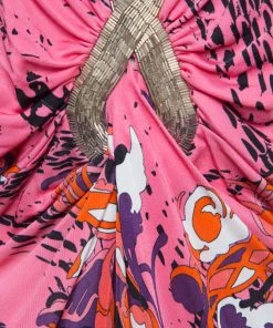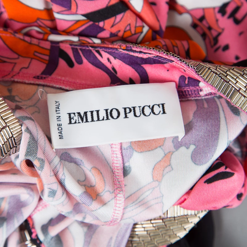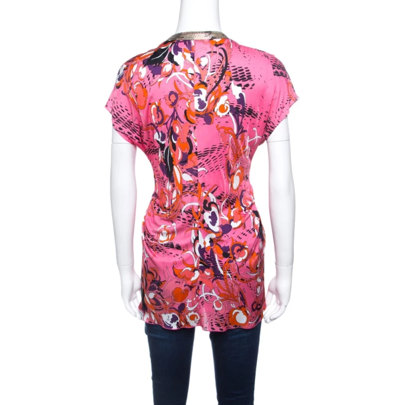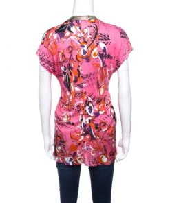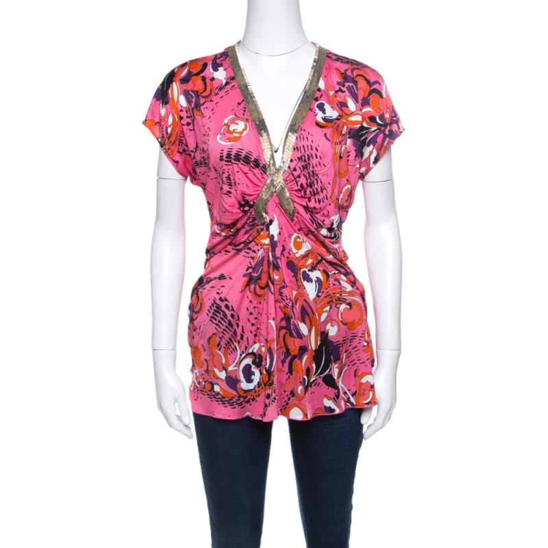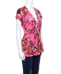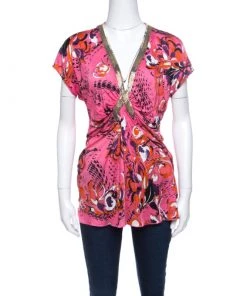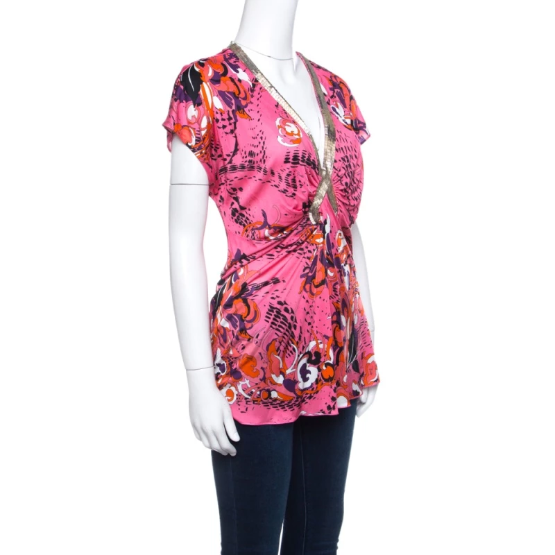 Emilio Pucci’s top is a lovely feminine piece that will complement your statement evening bottoms just perfectly. It features a multicoloured print all over along with slight ruching the front bodice and is beautifully embellished with bugle beads. It is complete with short sleeves and a plunging neckline.