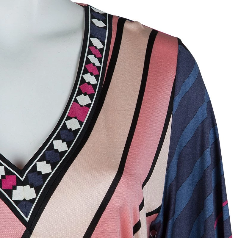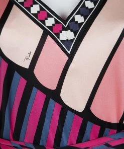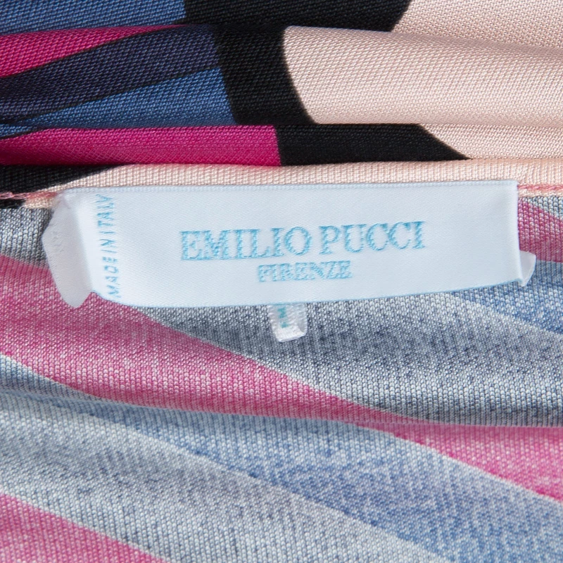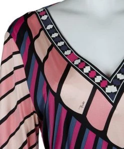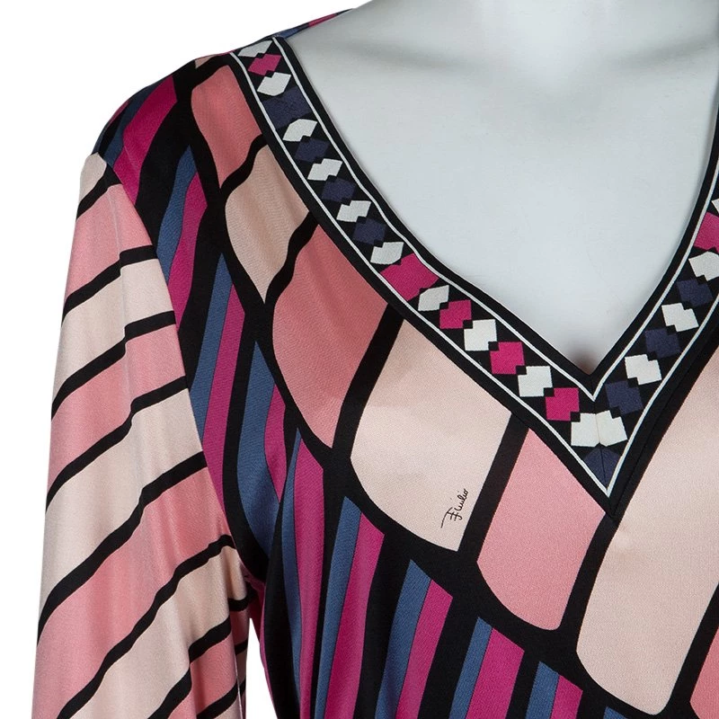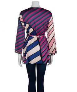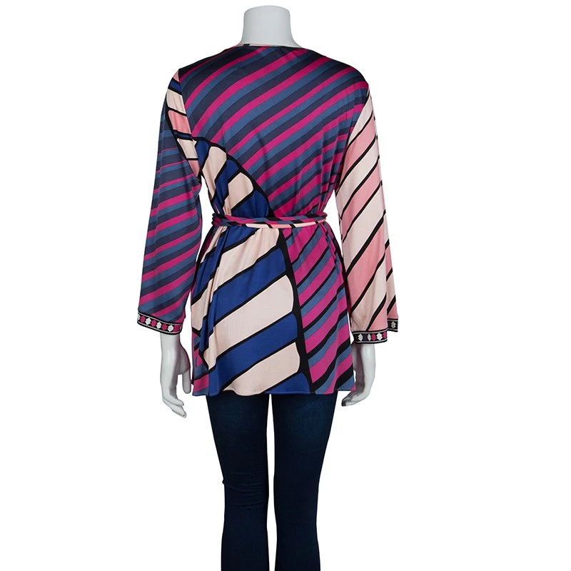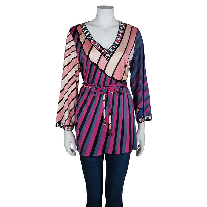 Best known for his geometric prints, Emilio Pucci loves to include a myriad of colors in his designs. This Emilio Pucci long sleeved belted top is no exception. This printed top is beautifully designed with a V-neck and long sleeves. A belted design, it can be cinched at the waist if necessary.