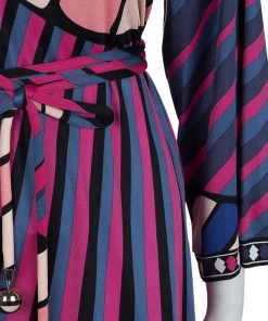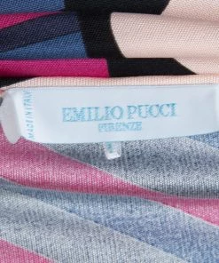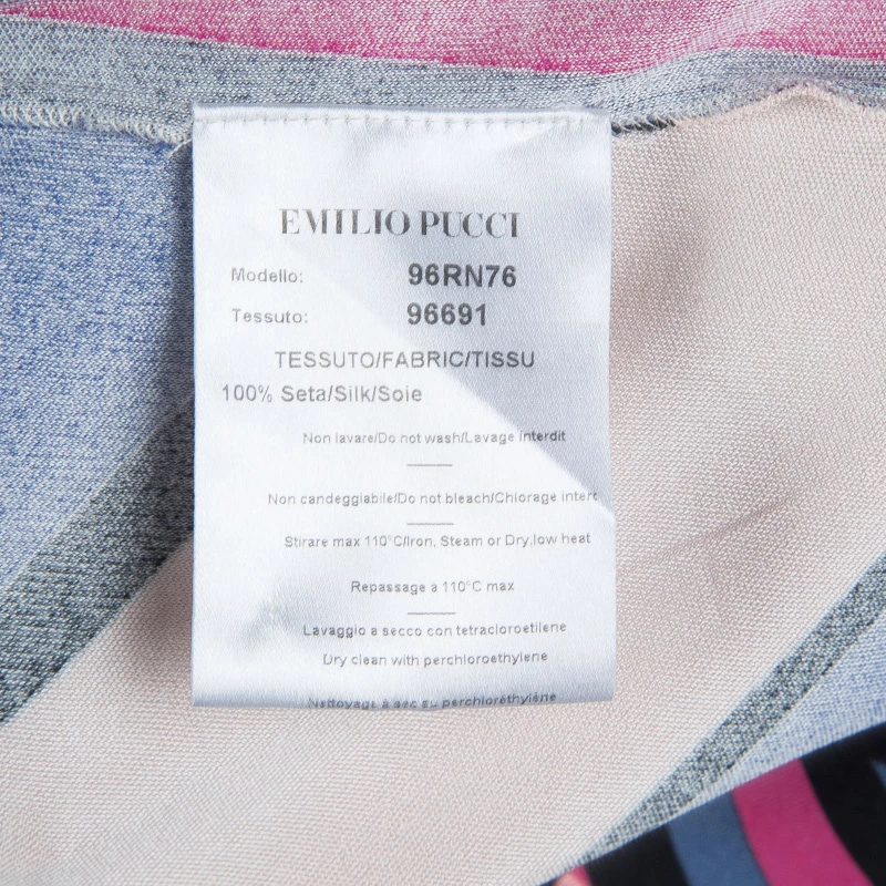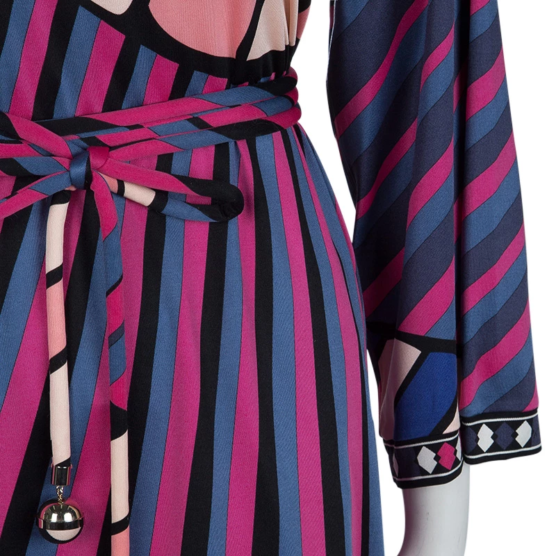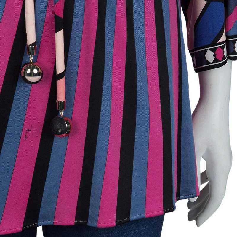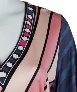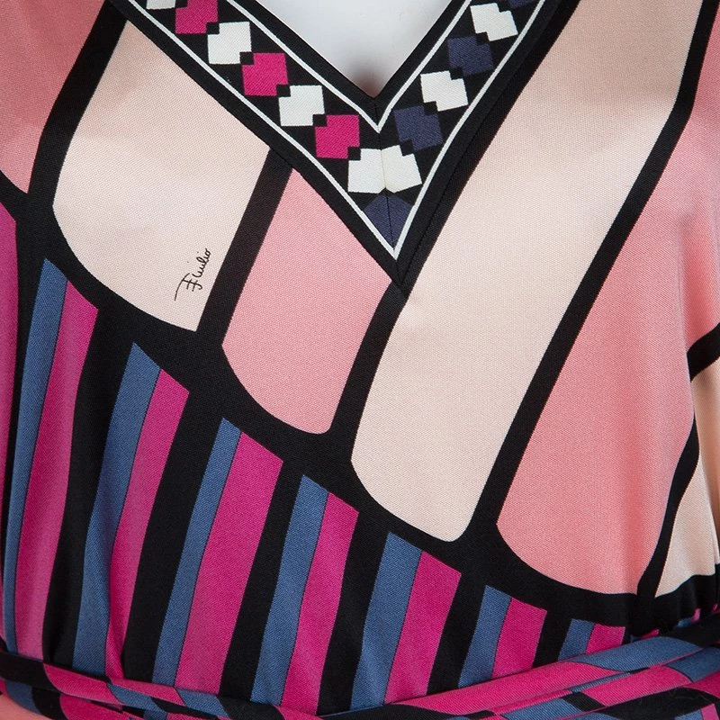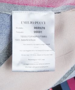 Best known for his geometric prints, Emilio Pucci loves to include a myriad of colors in his designs. This Emilio Pucci long sleeved belted top is no exception. This printed top is beautifully designed with a V-neck and long sleeves. A belted design, it can be cinched at the waist if necessary.