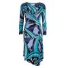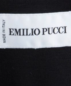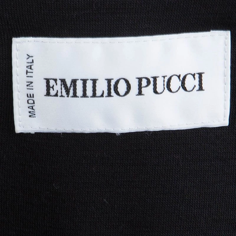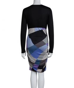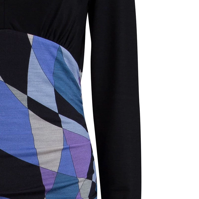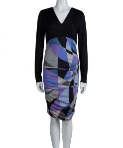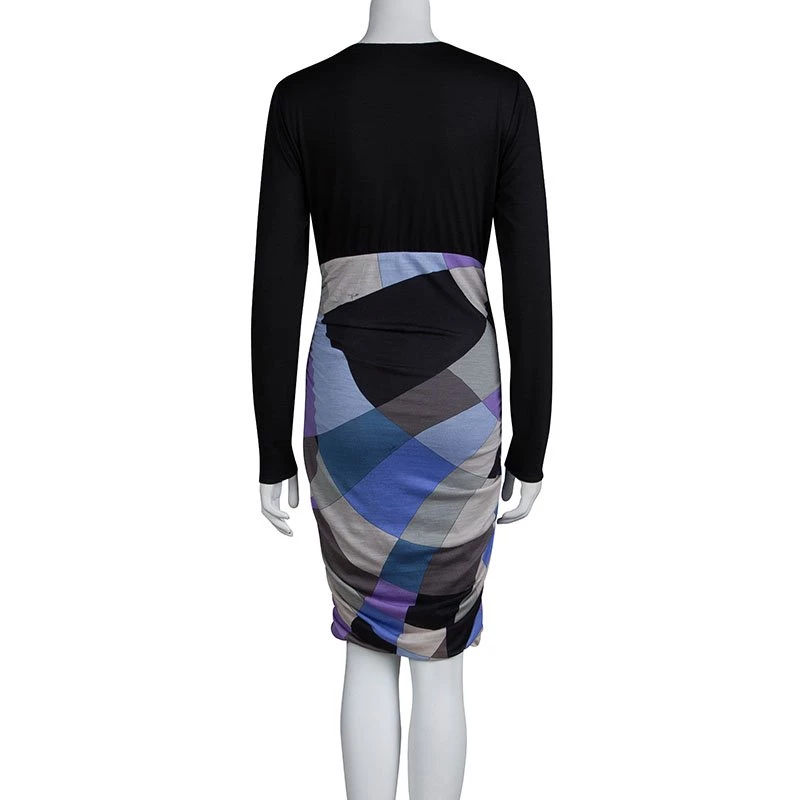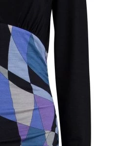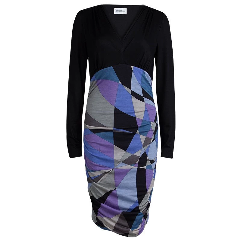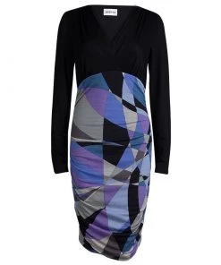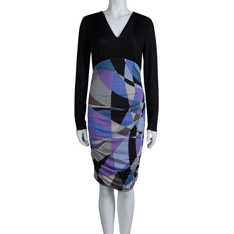 Opt for a vibrant look this season with Emilio Pucci’s multicoloured dress. It has a smooth black jersey bodice with a V-neck and long sleeves, and a ruched skirt that’s decorated with bold print for a dose of colour and recognition.