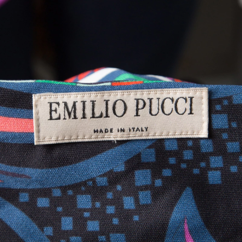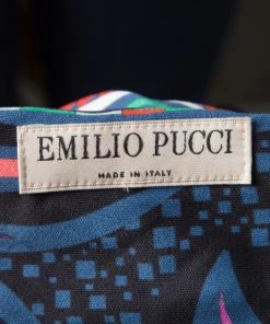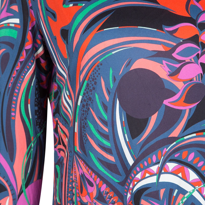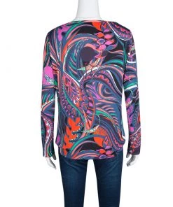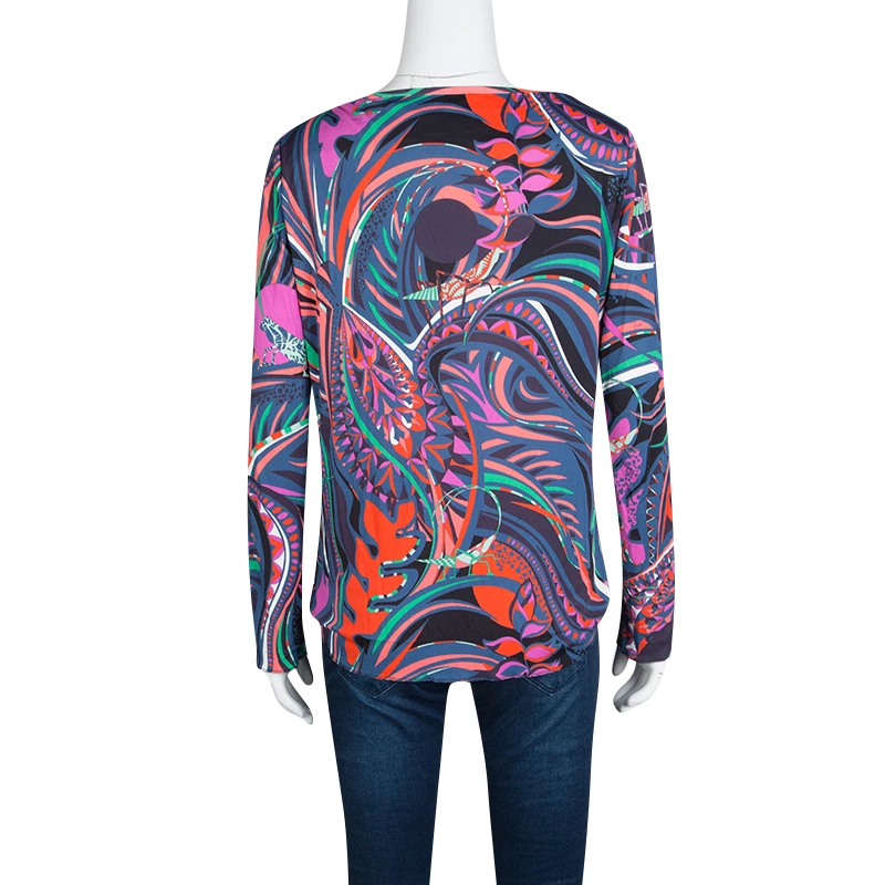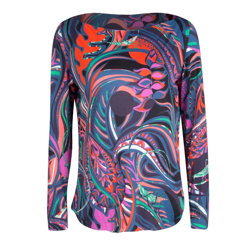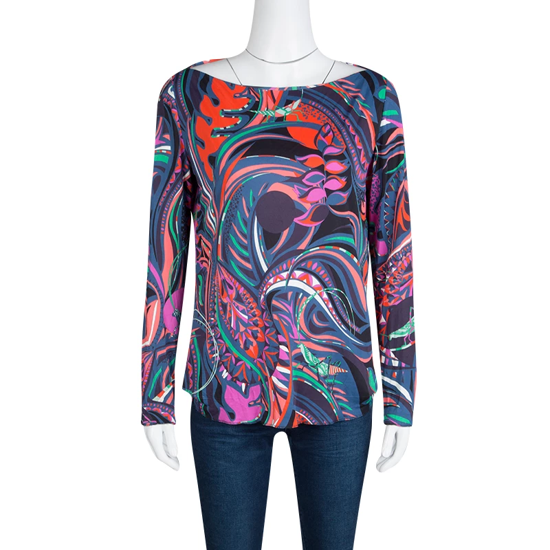 Fashioned with a multicolor printed knit, this Emilio Pucci top is perfect for a casual day look. It features a bateau neckline and finished with full sleeves. This top offers a relaxed fit and looks best styled with skinny jeans.